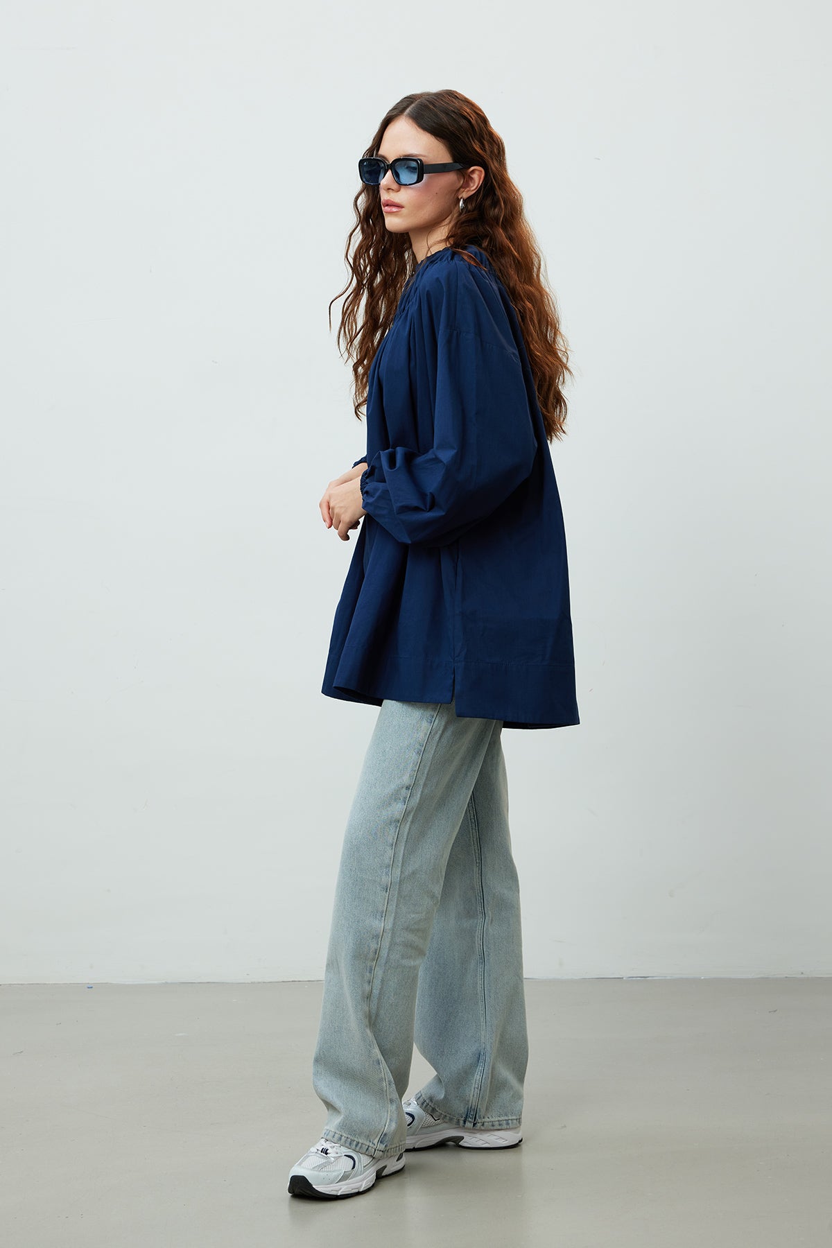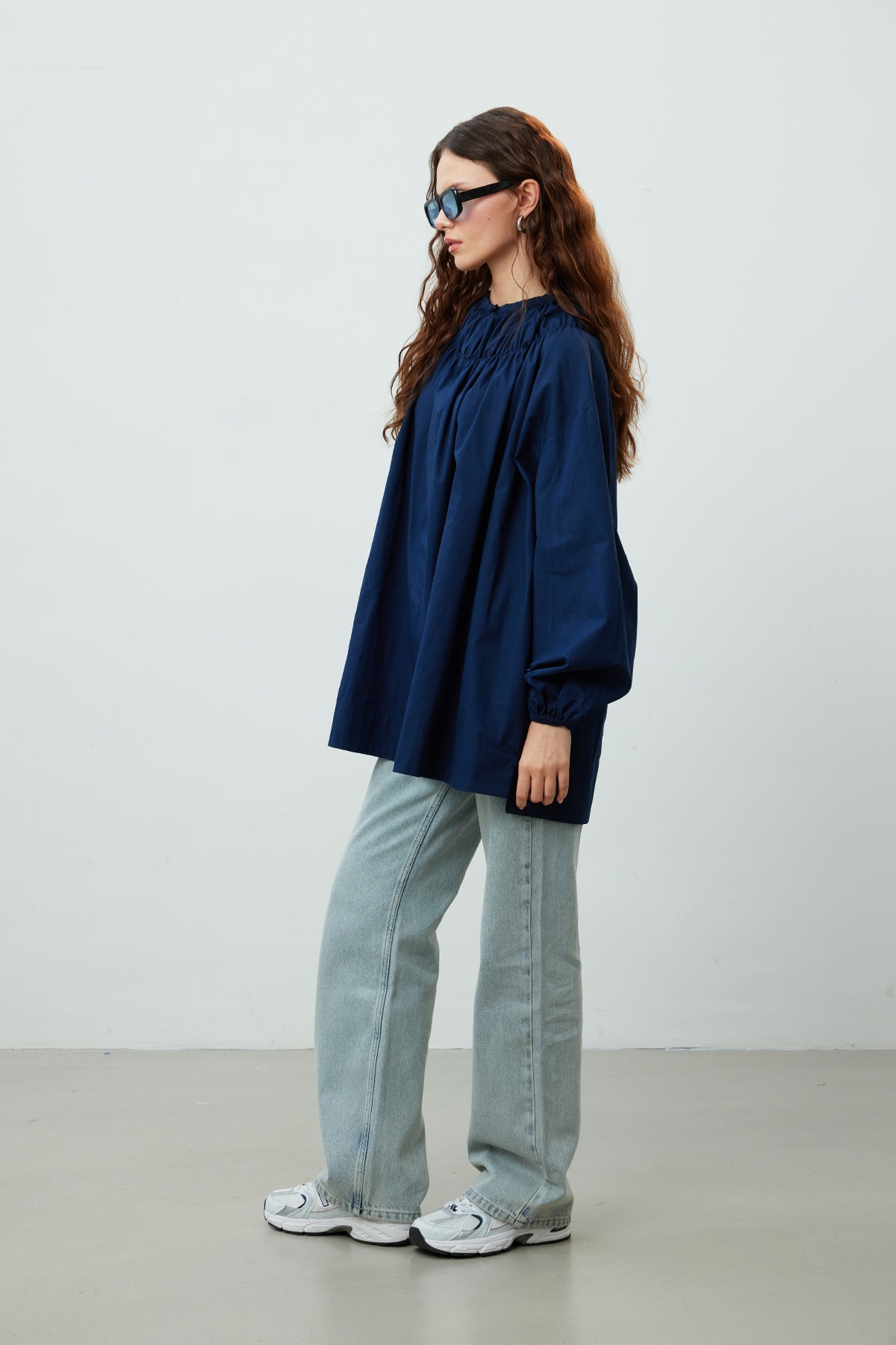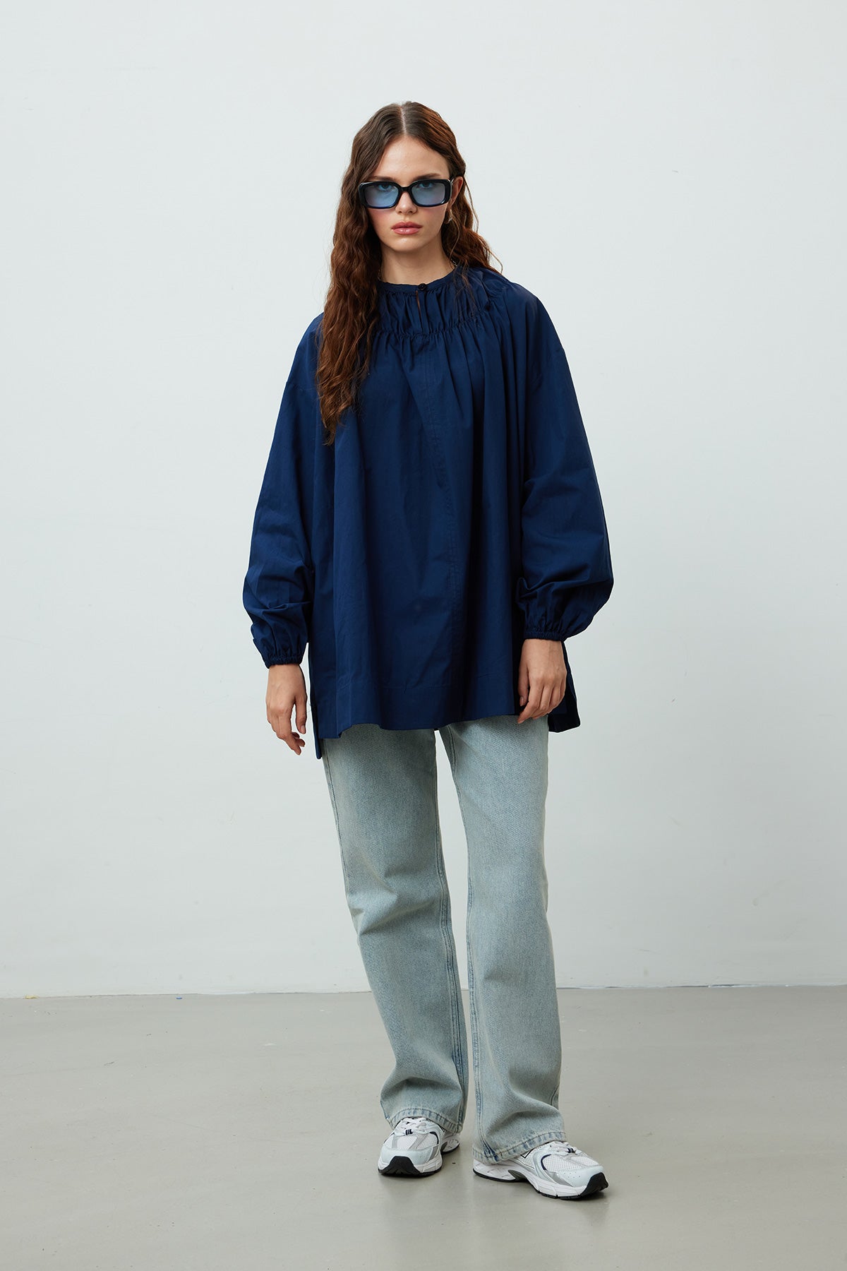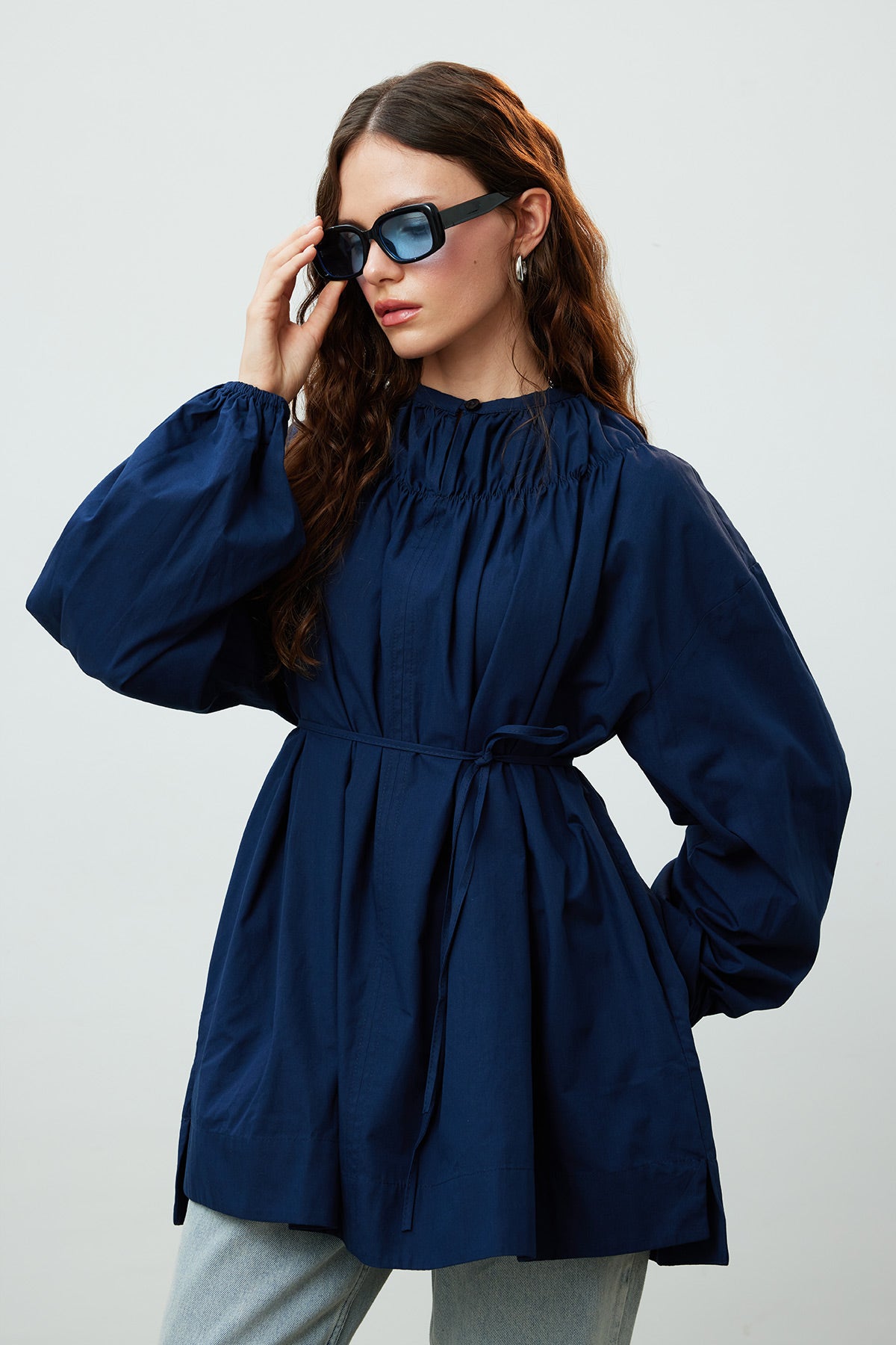 This tunic features a round neckline enhanced with an elastic shirred collar, providing a subtle gathered texture that adds depth and interest to the simple silhouette. The front button closure adds a touch of sophistication, allowing for easy wear and a hint of allure. Accompanied by a belt, this tunic offers versatility in styling, enabling you to cinch the waist for a more defined silhouette or wear it loose for a relaxed fit. Made from soft cotton fabric, it promises breathability and comfort, making it perfect for all-day wear.