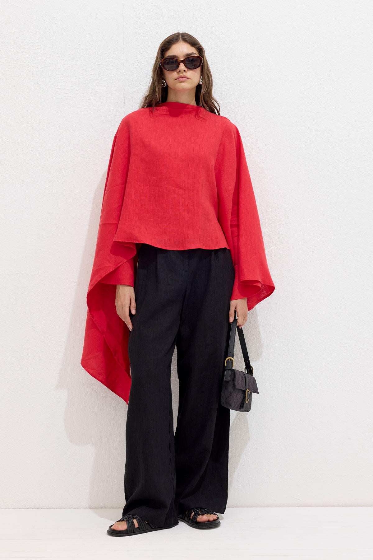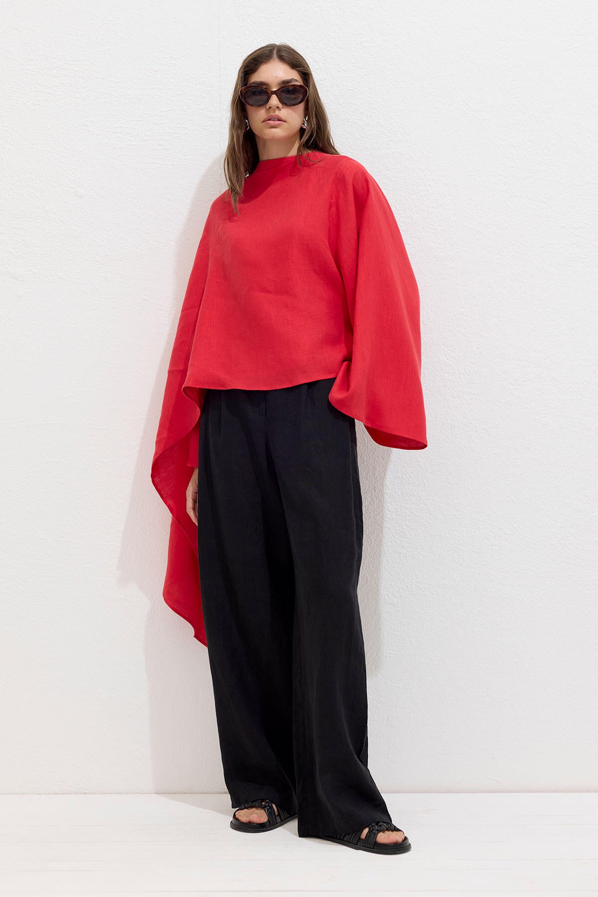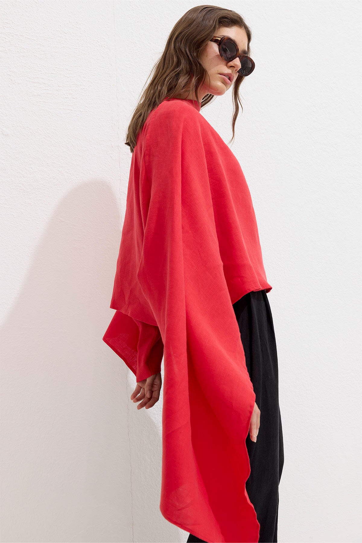 Asymmetric Linen Cape Blouse Red