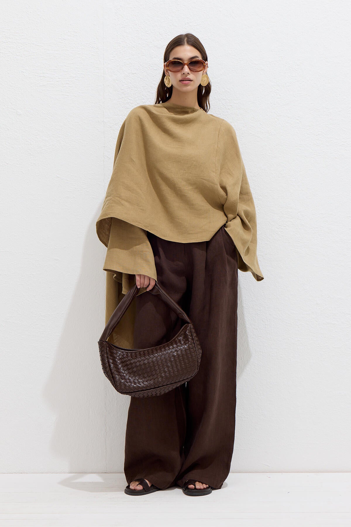 Long-sleeved shirt featuring a shawl collar and concealed button closure. Made from 100% linen.