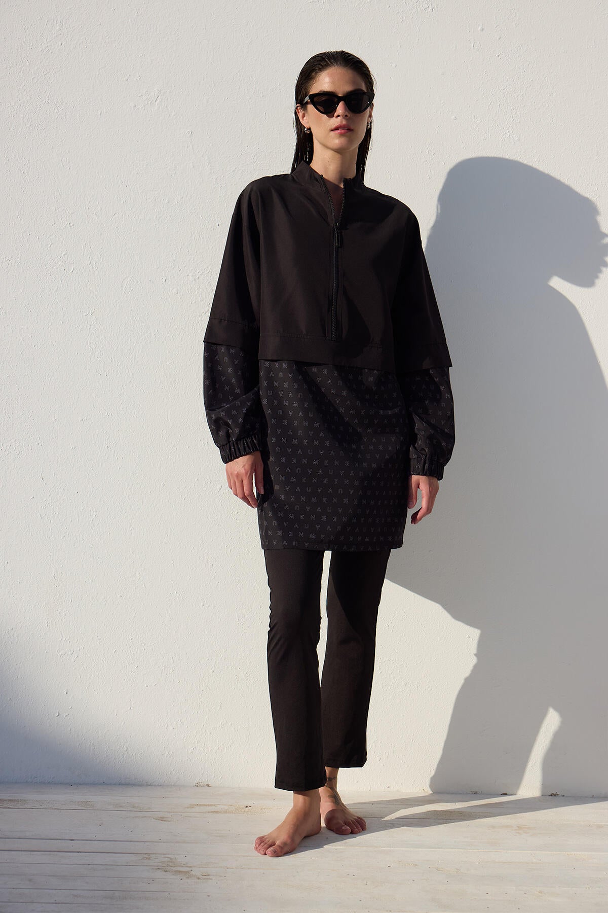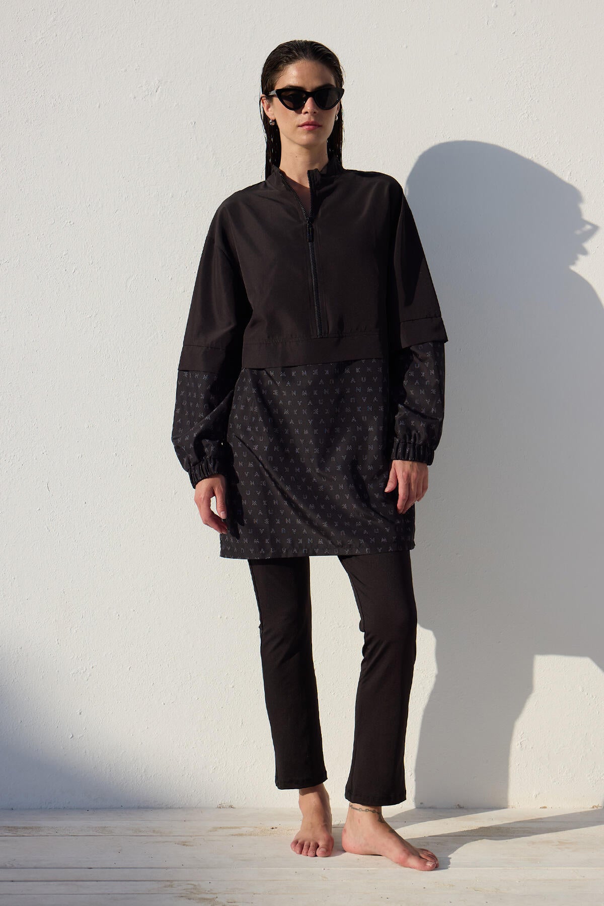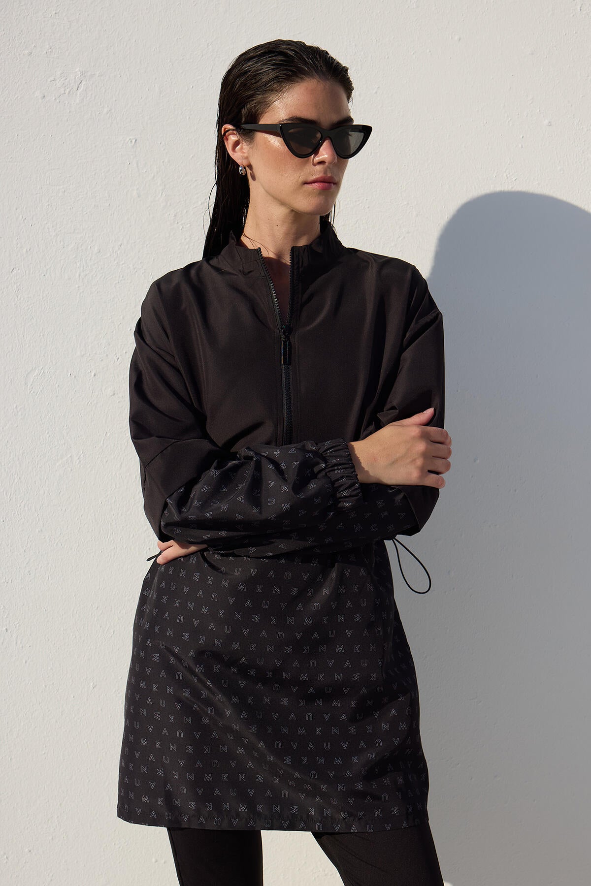 This is a single-piece product without a set, featuring a high collar, zip closure, and elasticated cuffs. It is made from a special water-repellent and quick-drying fabric.