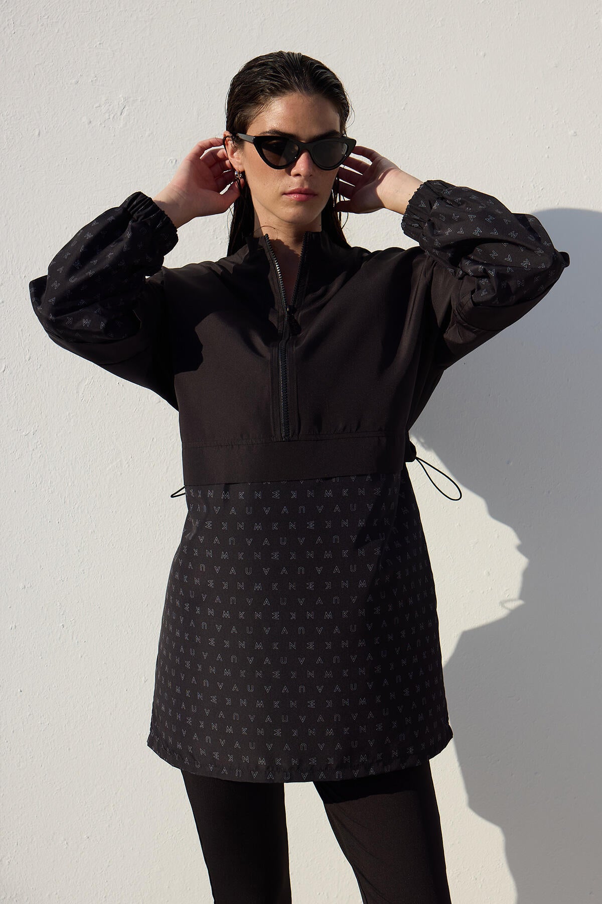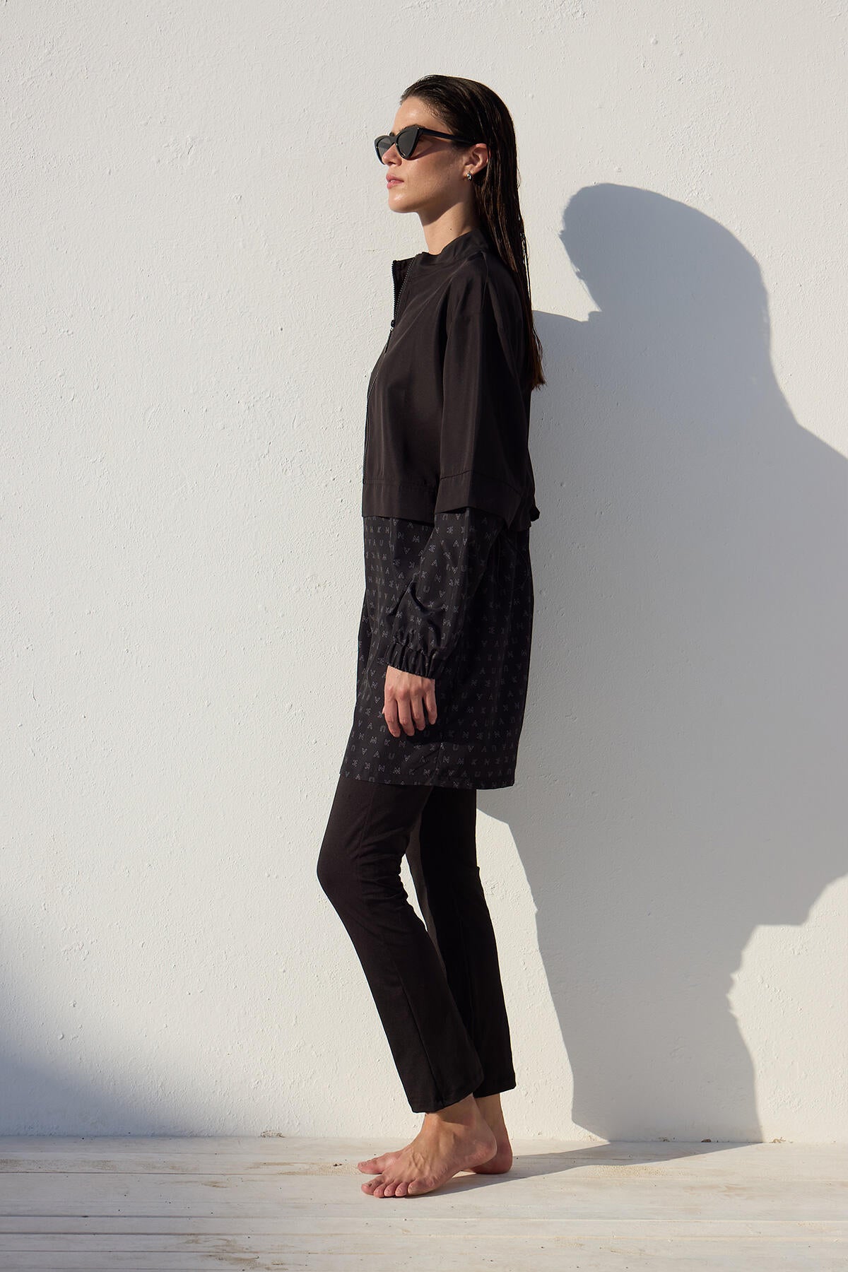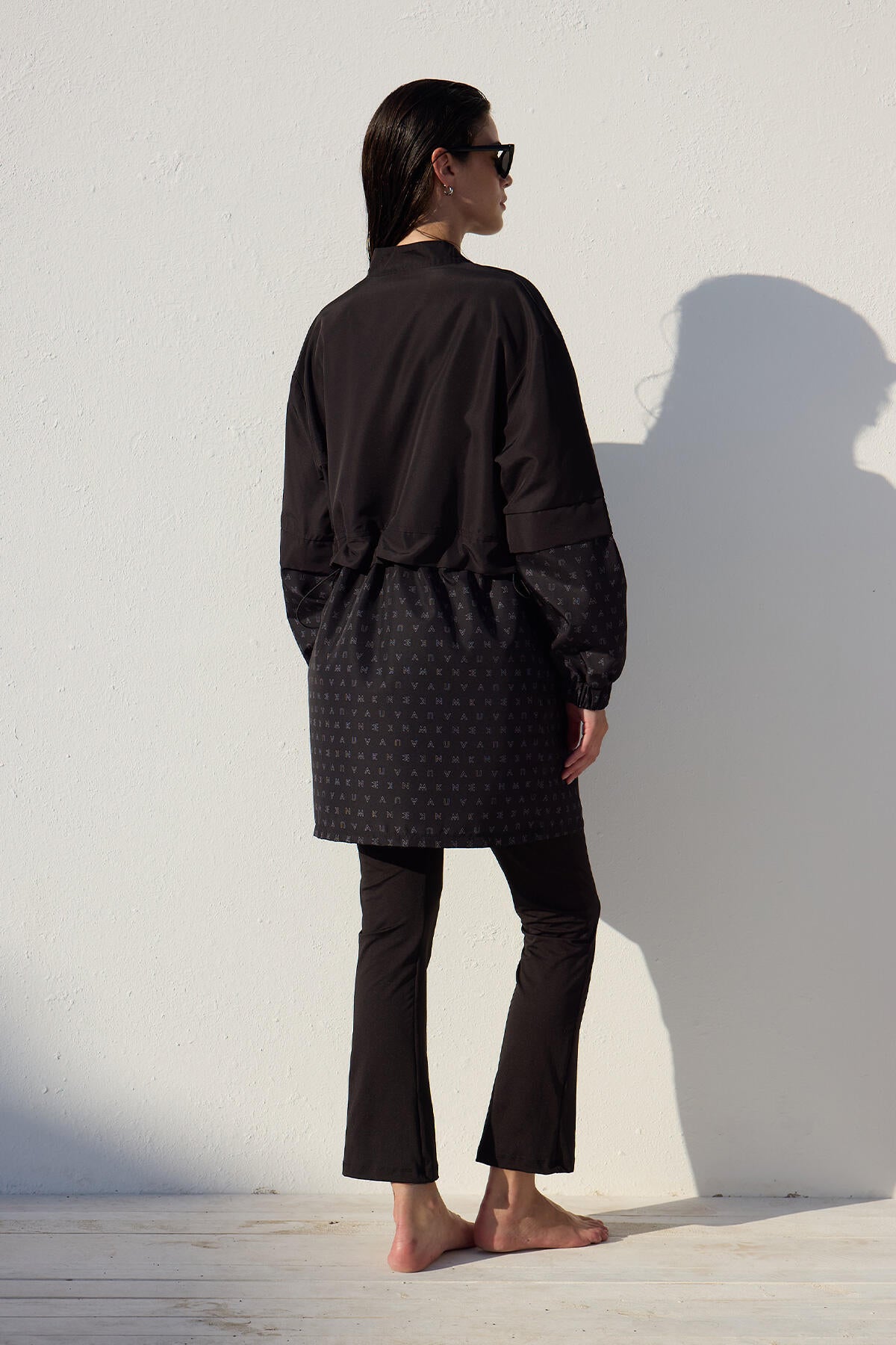 This is a single-piece product without a set, featuring a high collar, zip closure, and elasticated cuffs. It is made from a special water-repellent and quick-drying fabric.