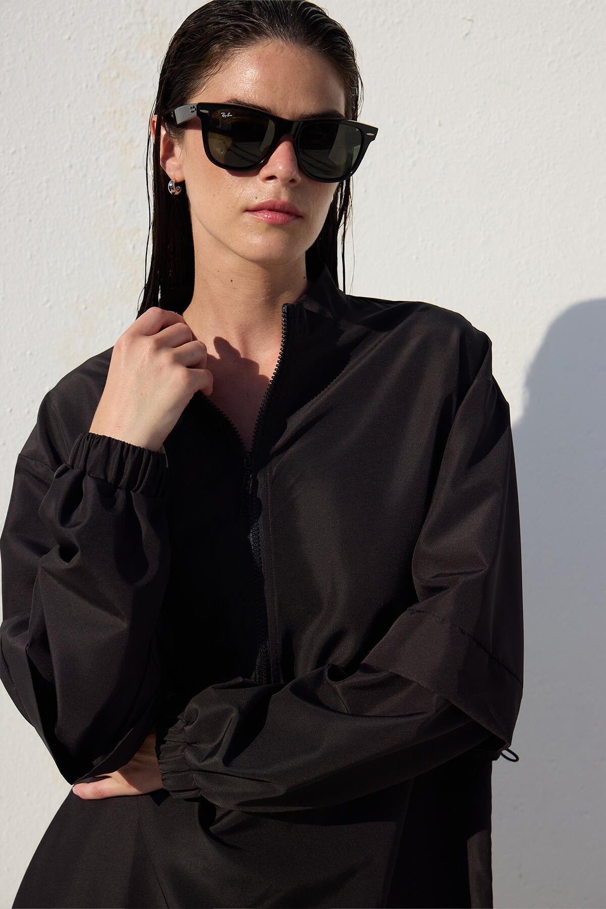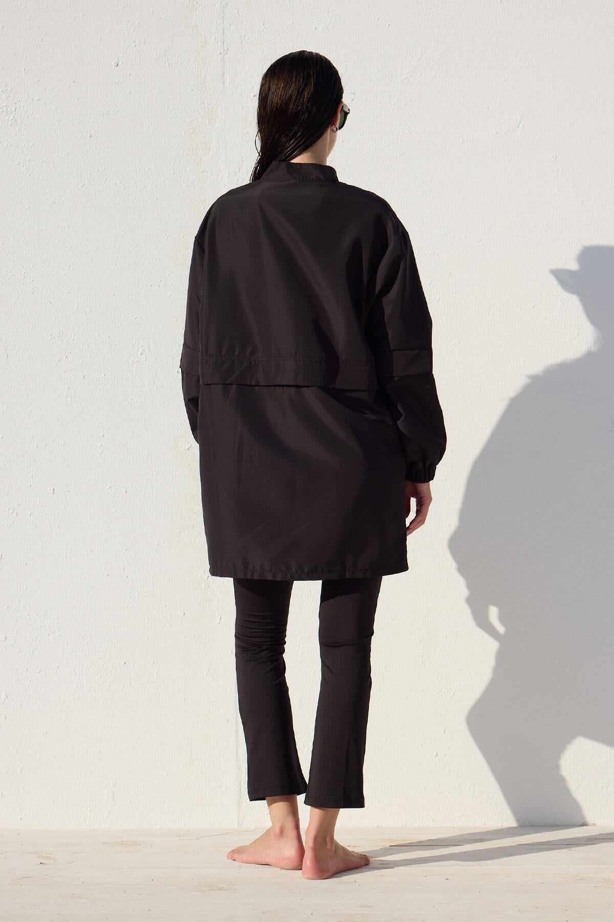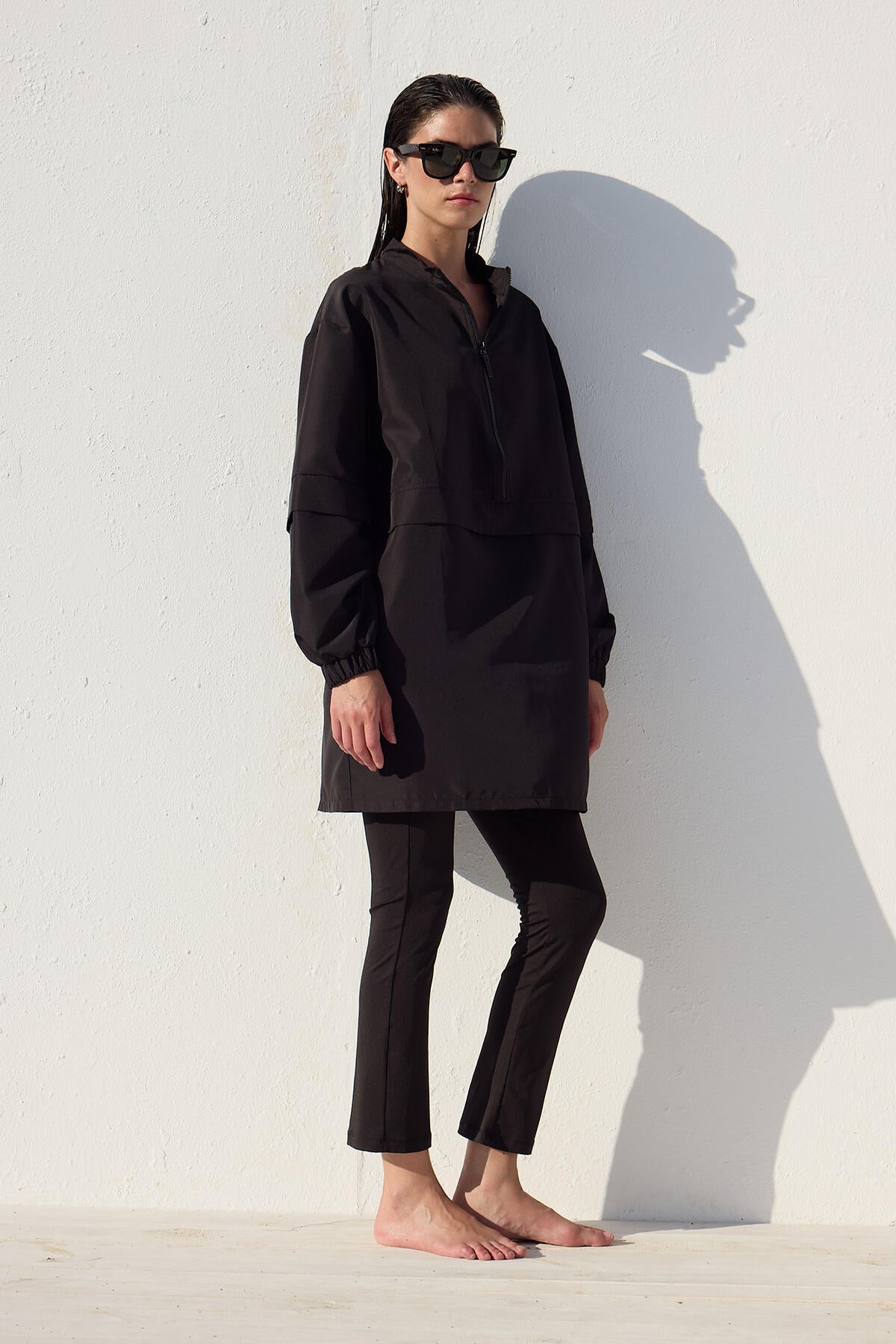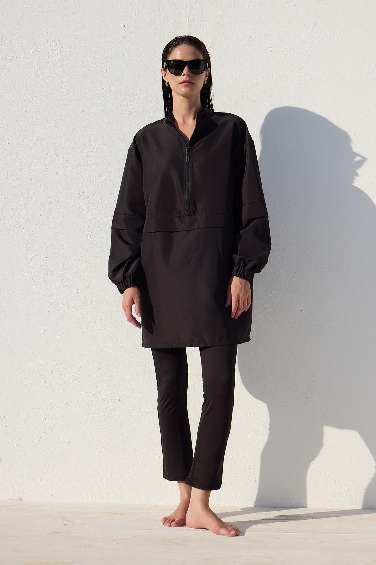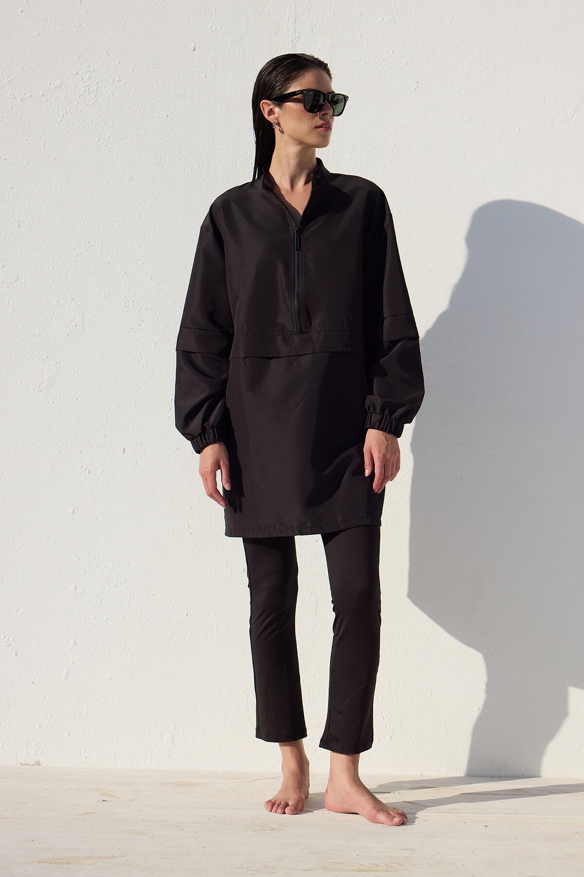 This is a single-piece product without a set, featuring a high collar, zip closure, and elasticated cuffs. It is made from a special water-repellent and quick-drying fabric.