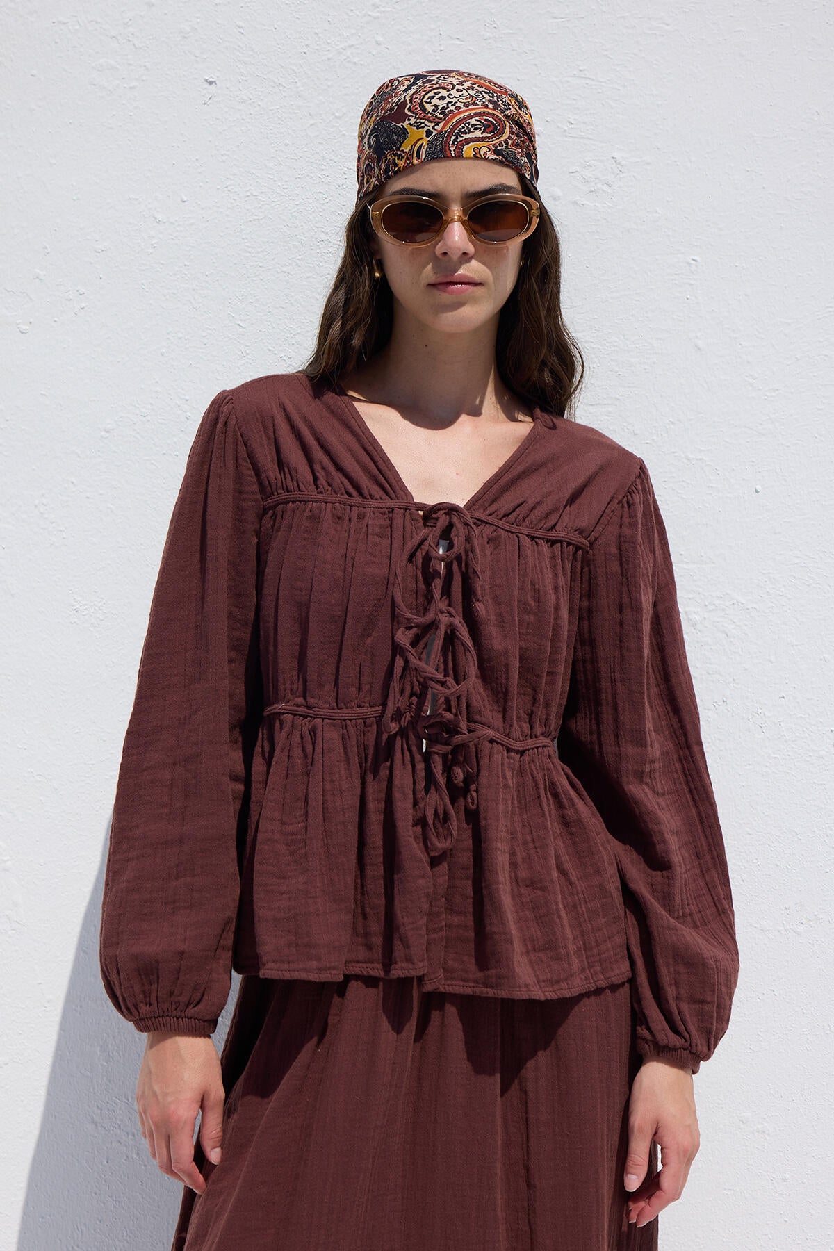 This fitted blouse features gathered details, a tie closure, and long sleeves. Made from muslin fabric.