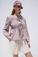 This fitted blouse features gathered details, a tie closure, and long sleeves. Made from muslin fabric.