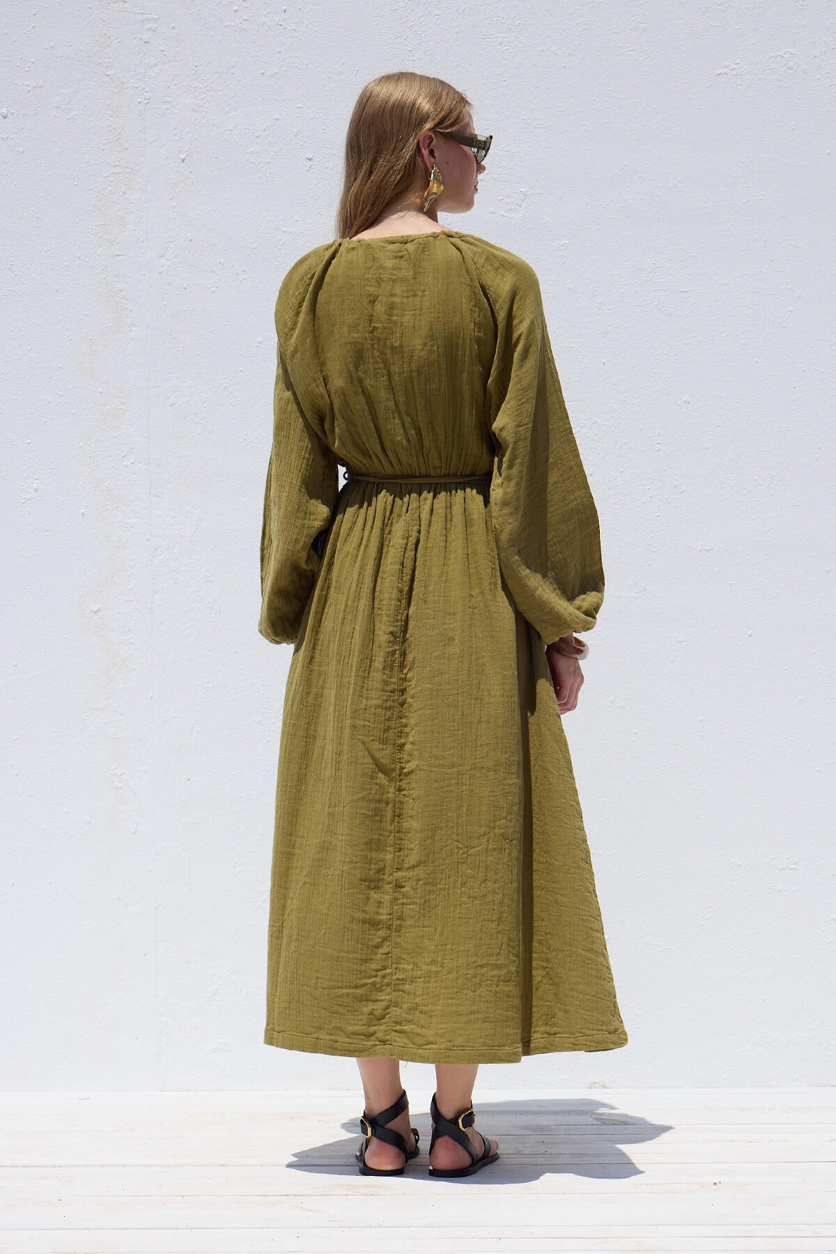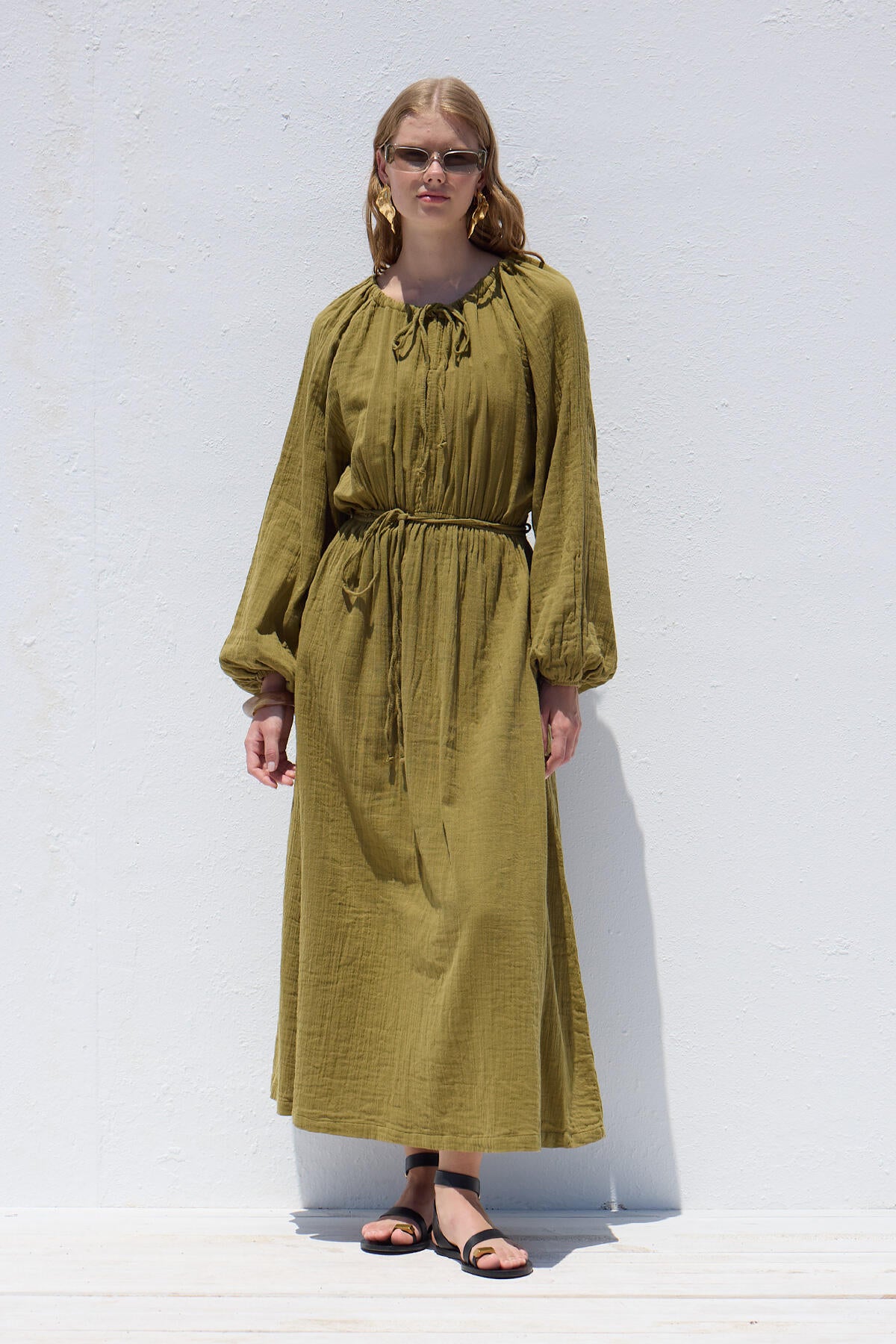 This dress features an adjustable drawstring neckline, raglan balloon sleeves, full length, and ruching details. It is unlined and made from muslin fabric.