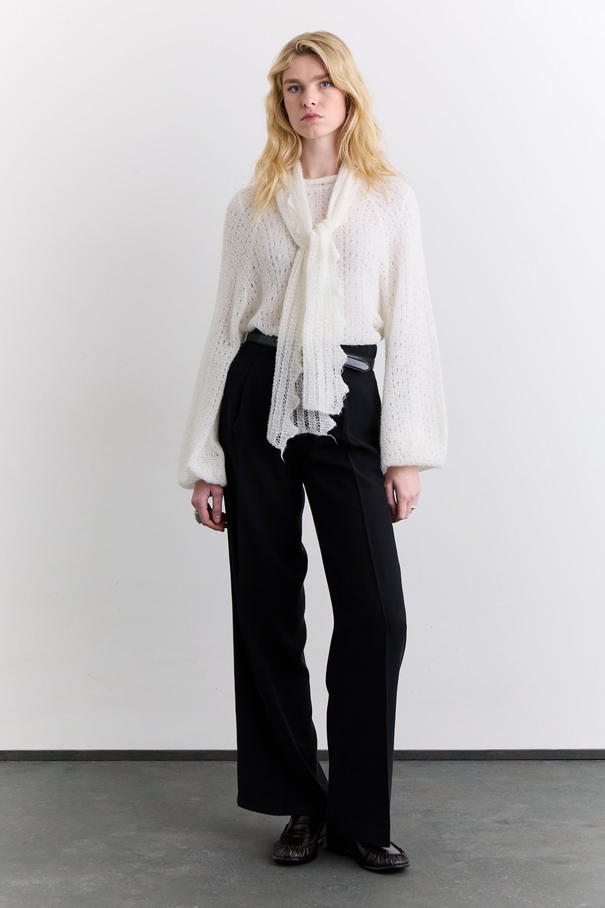 Tie Neck Pointelle Sweater Ecru