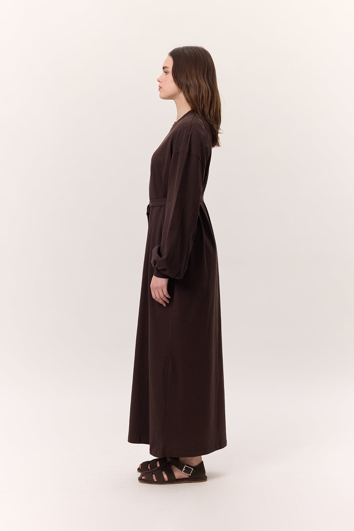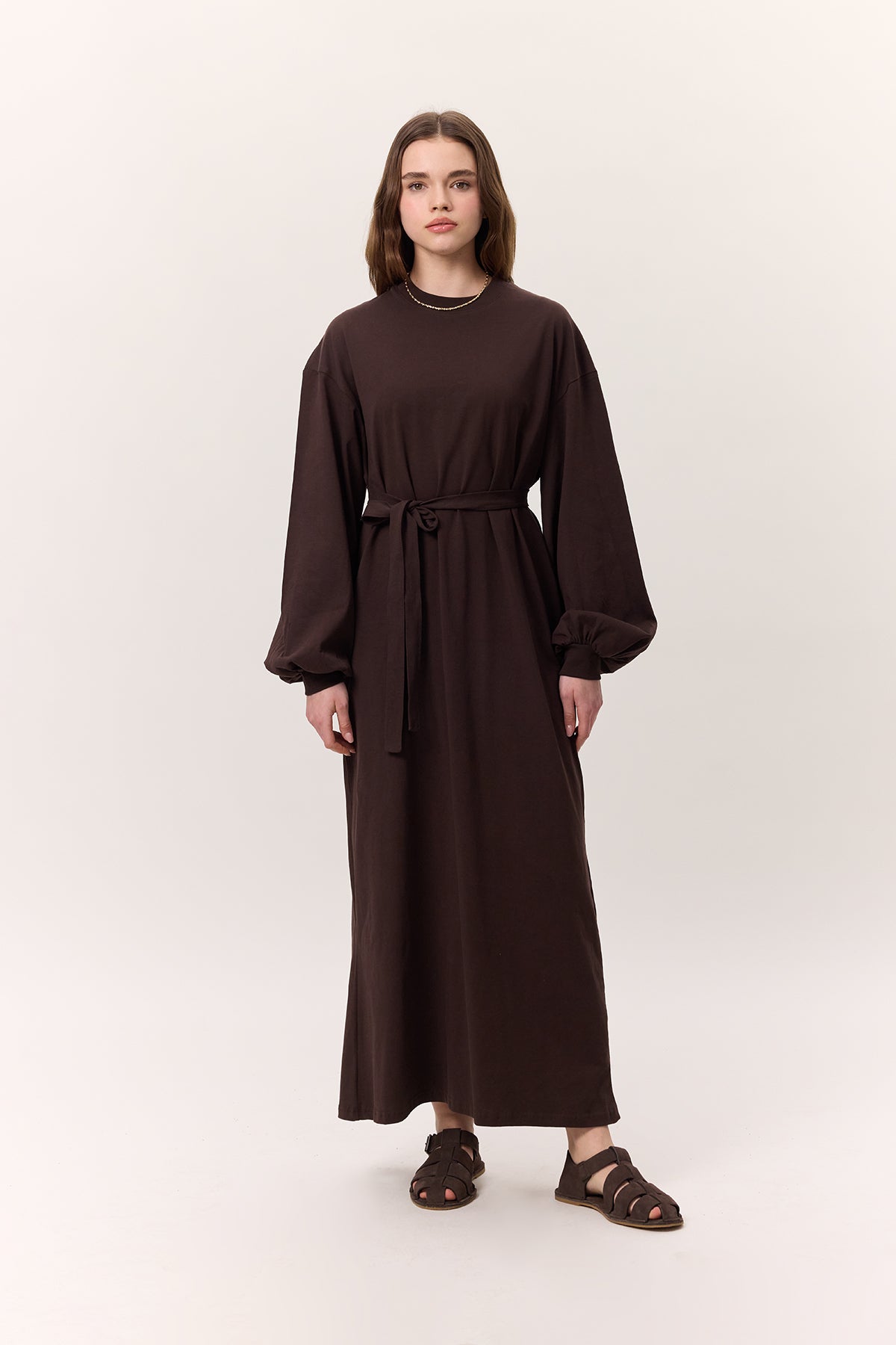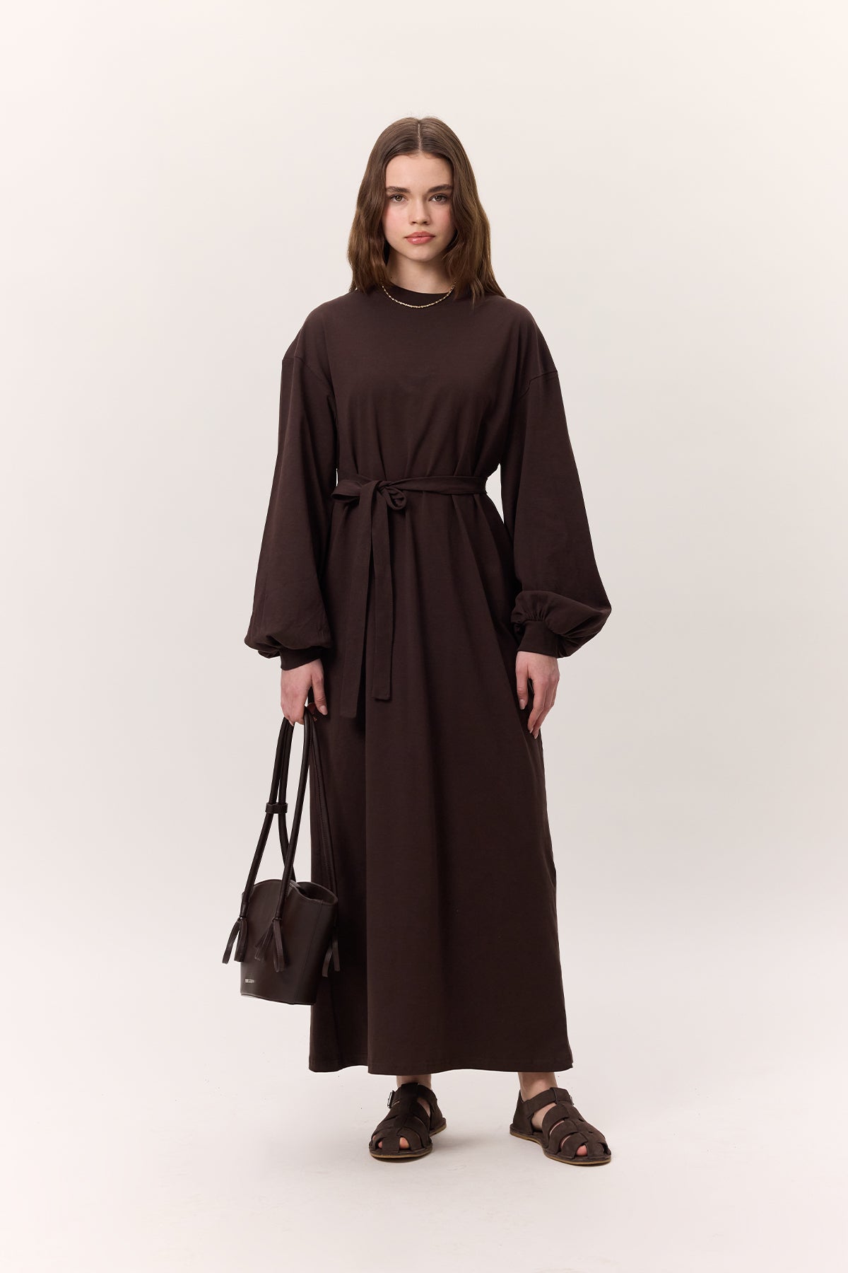 Balloon-Sleeve Long Dress Dark Brown