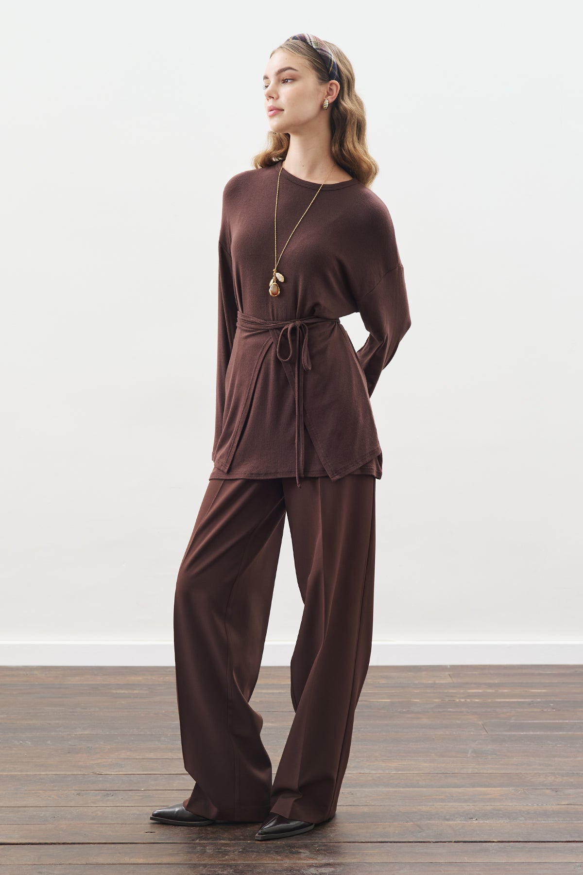 Yuvarlak yaka, uzun kol,etekli bağlamalı,tunik boy, normal kalıp.