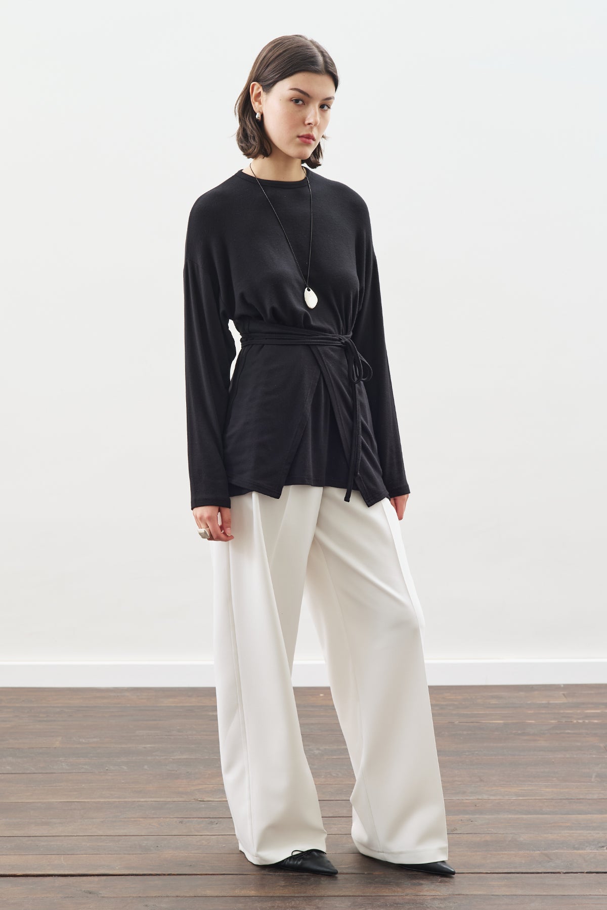 Yuvarlak yaka, uzun kol,etekli bağlamalı,tunik boy, normal kalıp.