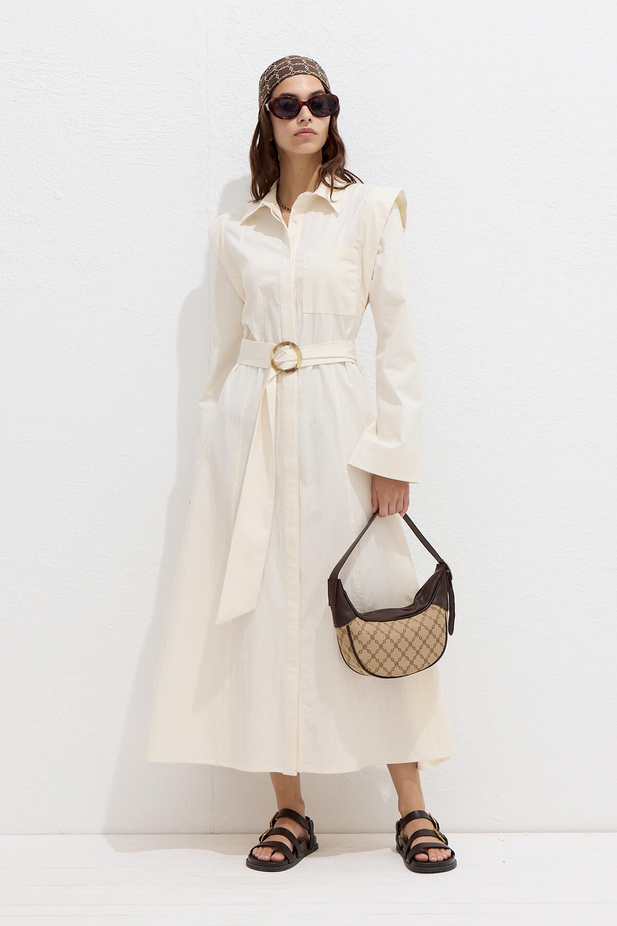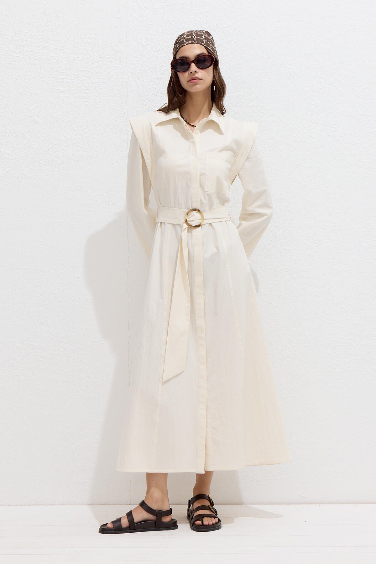 Shirt collar dress featuring a button-up front, self-fabric belt, shoulder detail accents, and long sleeves. Unlined for a lightweight feel.