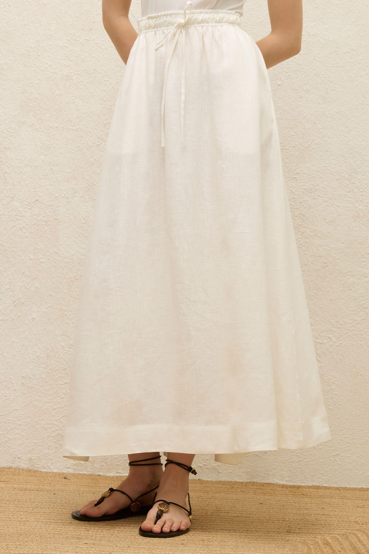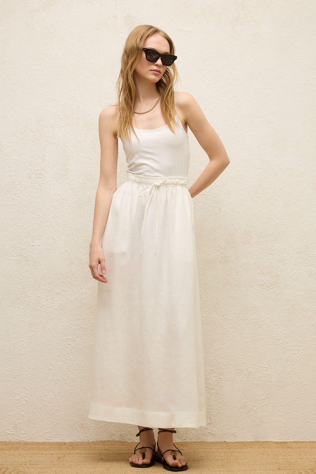 These full-length pants feature an elastic waistband with adjustable drawstrings, side pockets, and a wide flared cut. Made from 100% linen fabric.