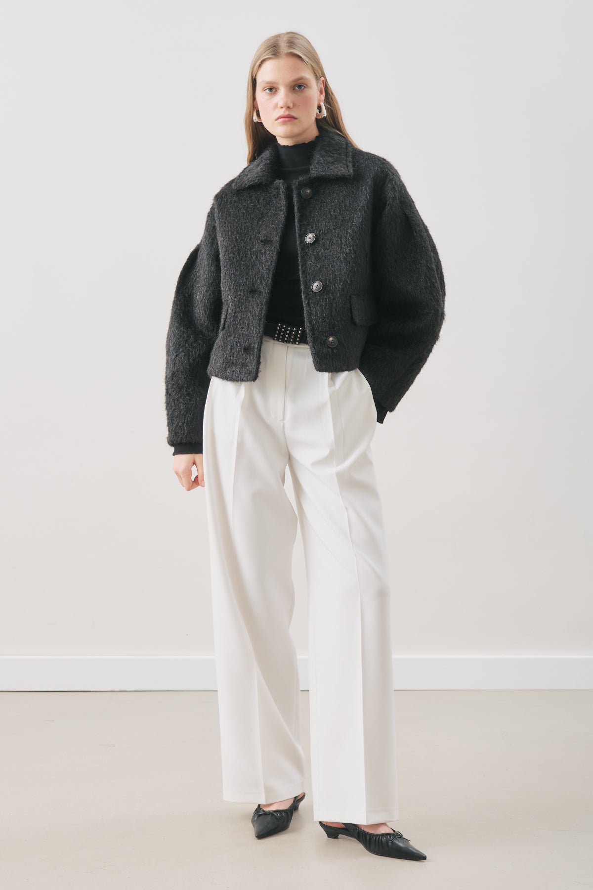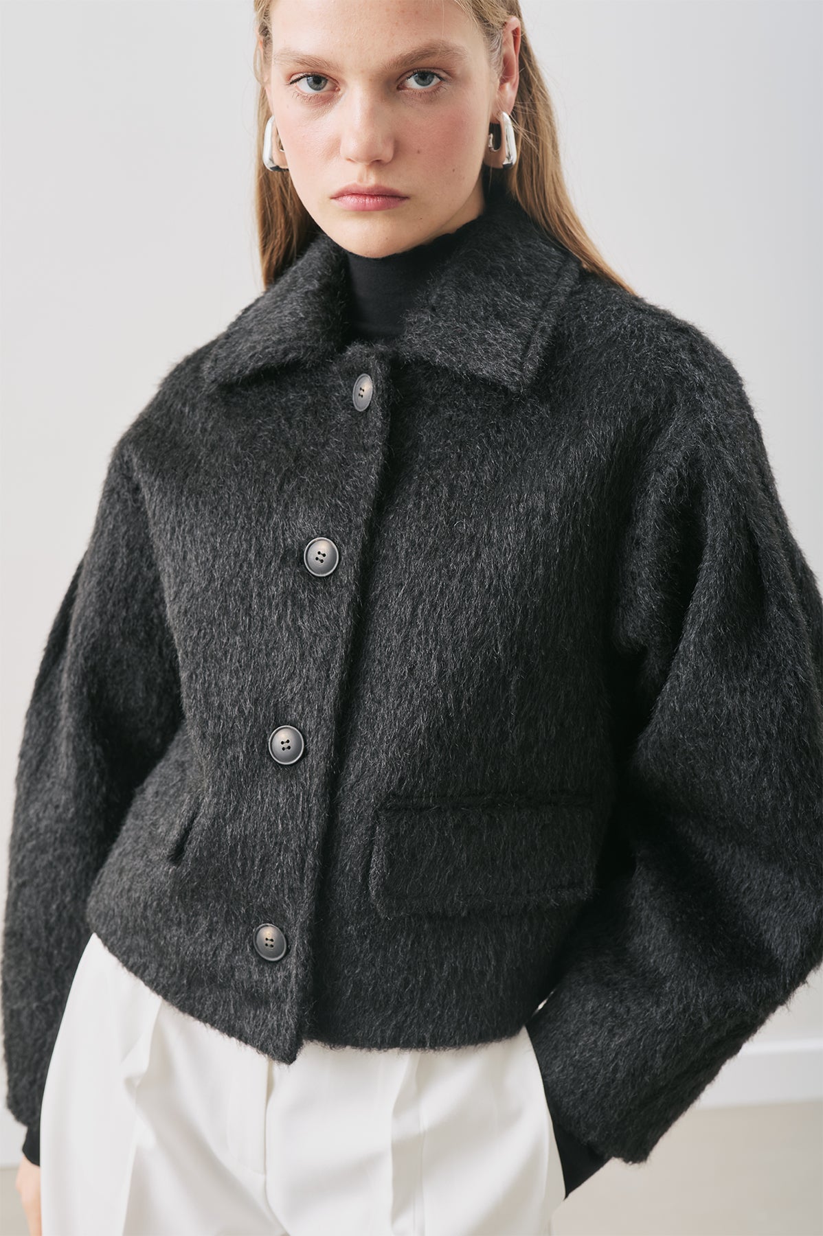 Normal kalıp,gömlek yaka,uzun kol, kolda pile ve cep detaylı,crop boy,düğme kapamalı.