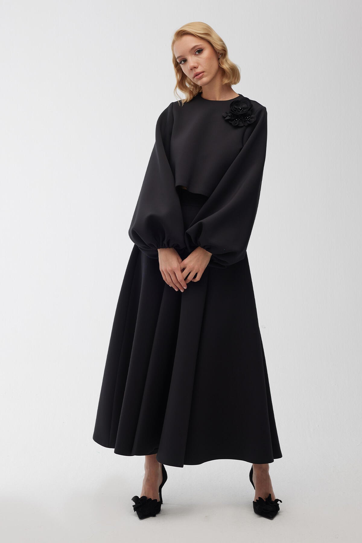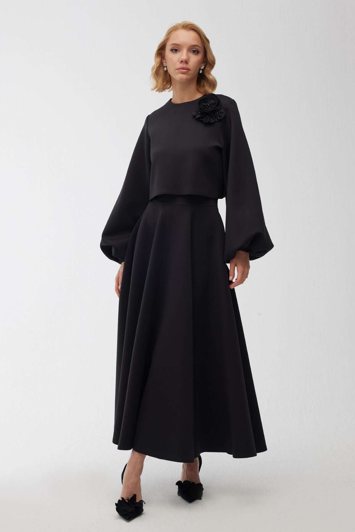 Brooch Detailed Balloon Sleeve Blouse Black