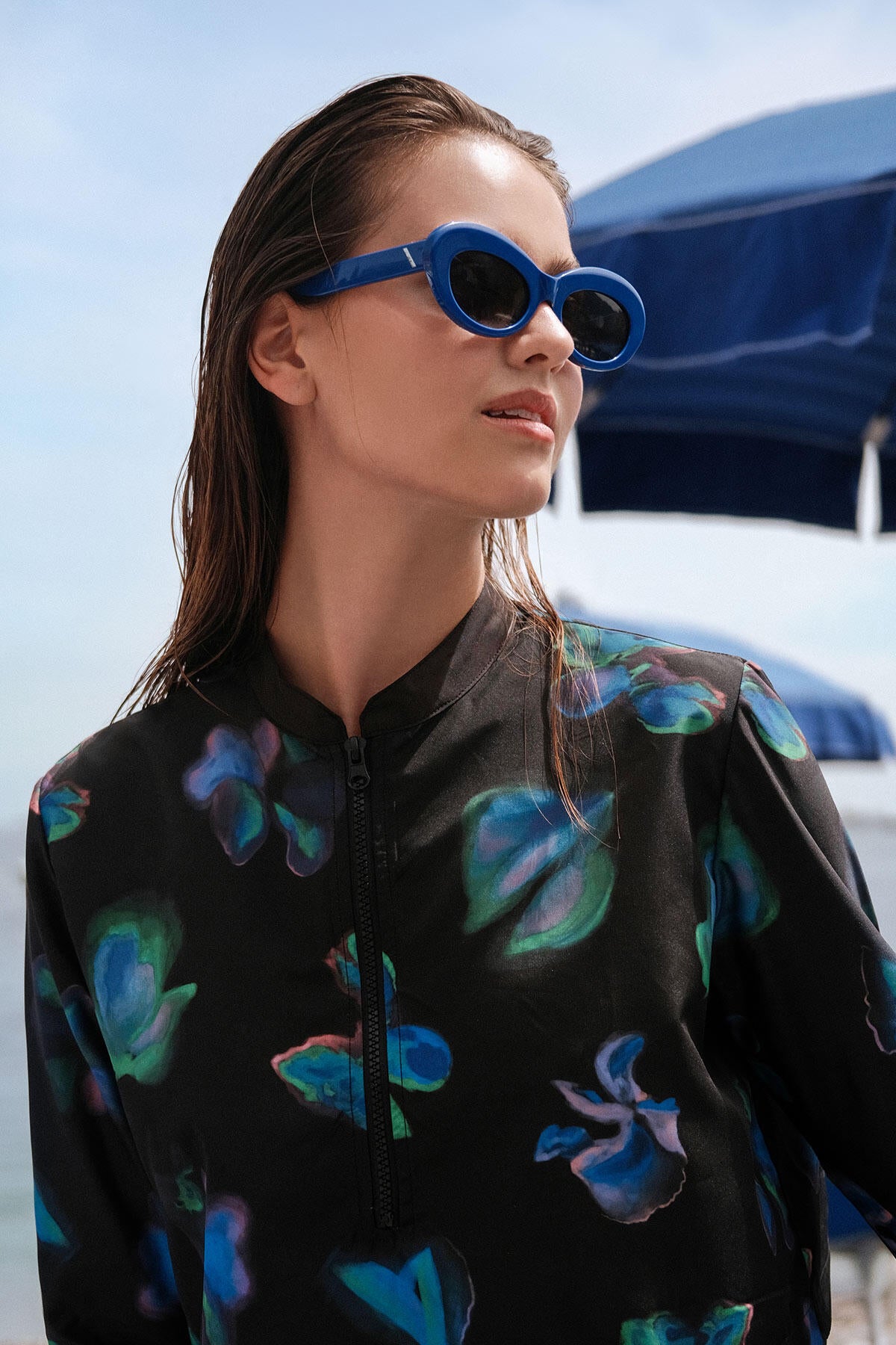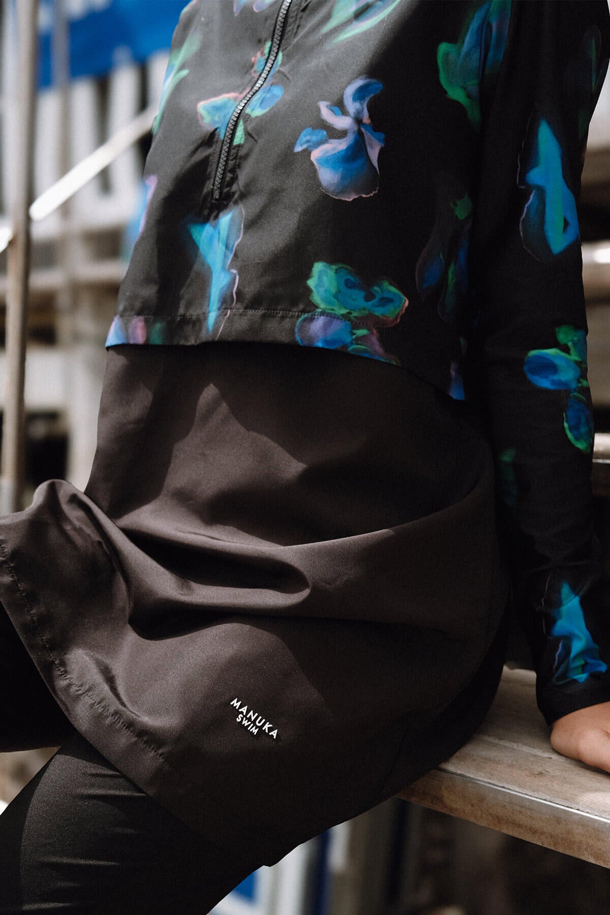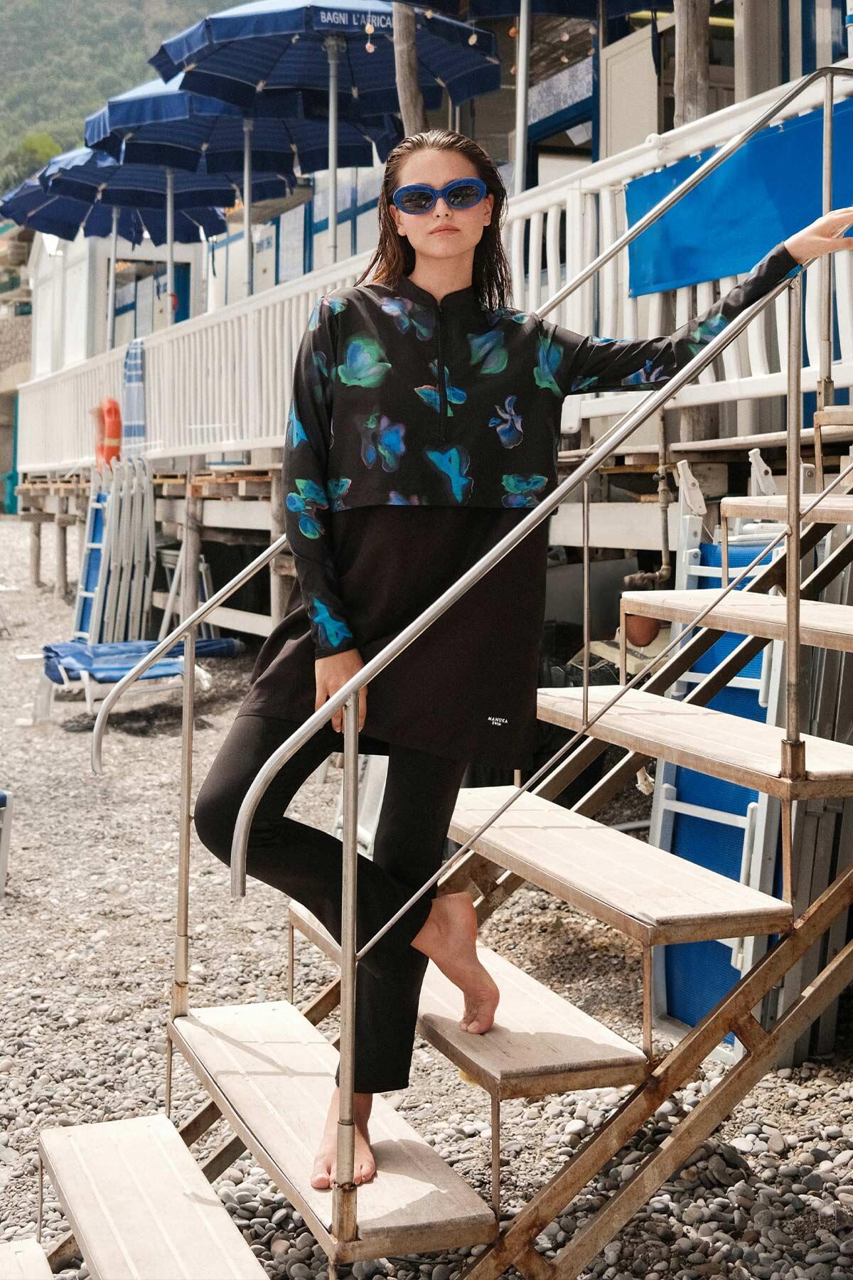 High-neck with zip closure, featuring a printed upper body, sleeves made from stretchy swimwear fabric, and a body crafted from fast-drying woven swimwear fabric. It includes an elastic waistband and stopper for a secure fit.