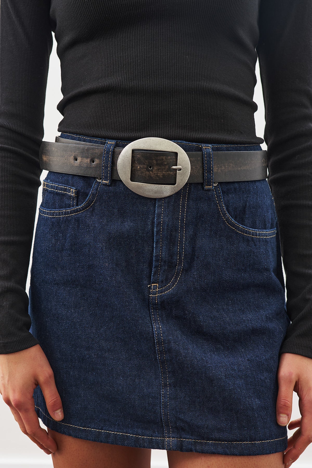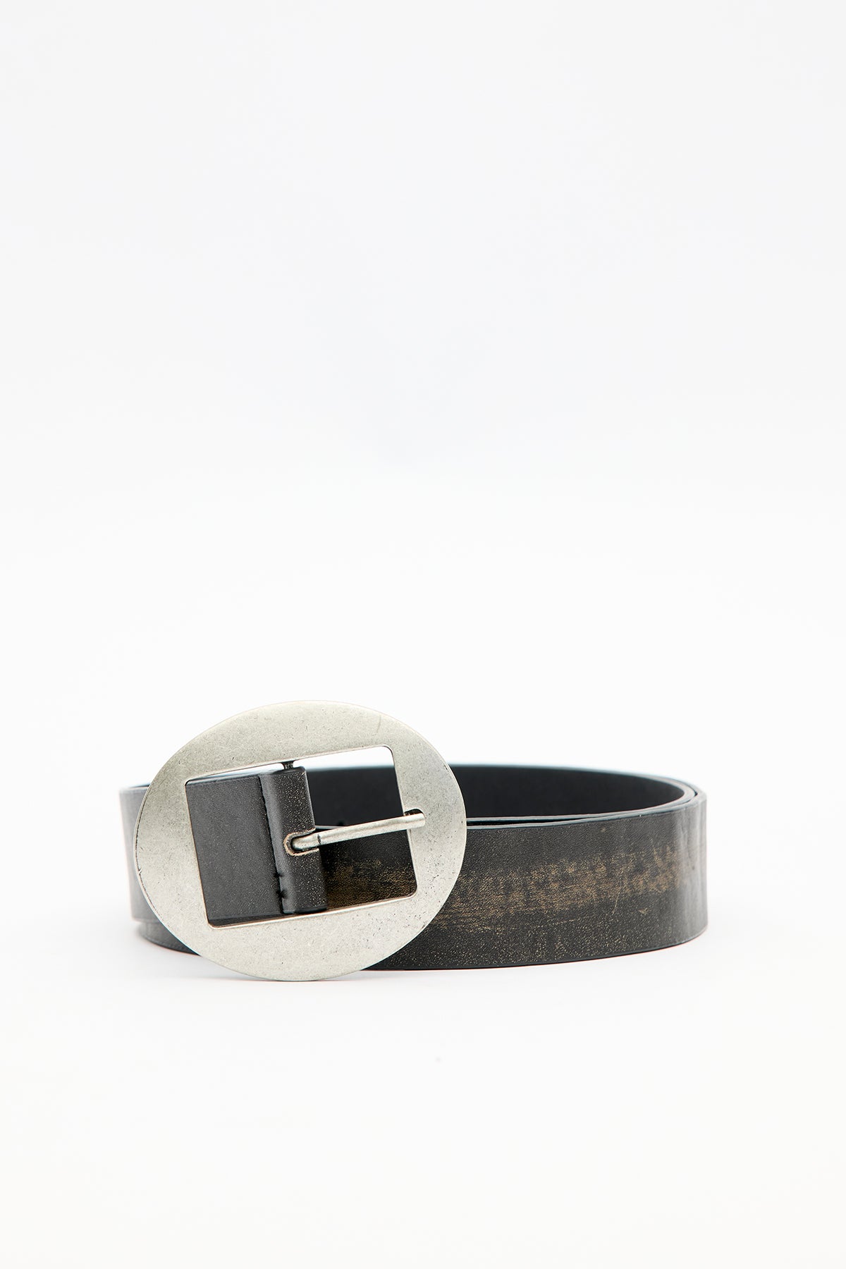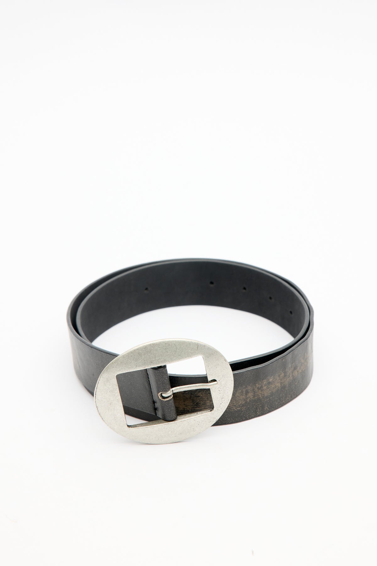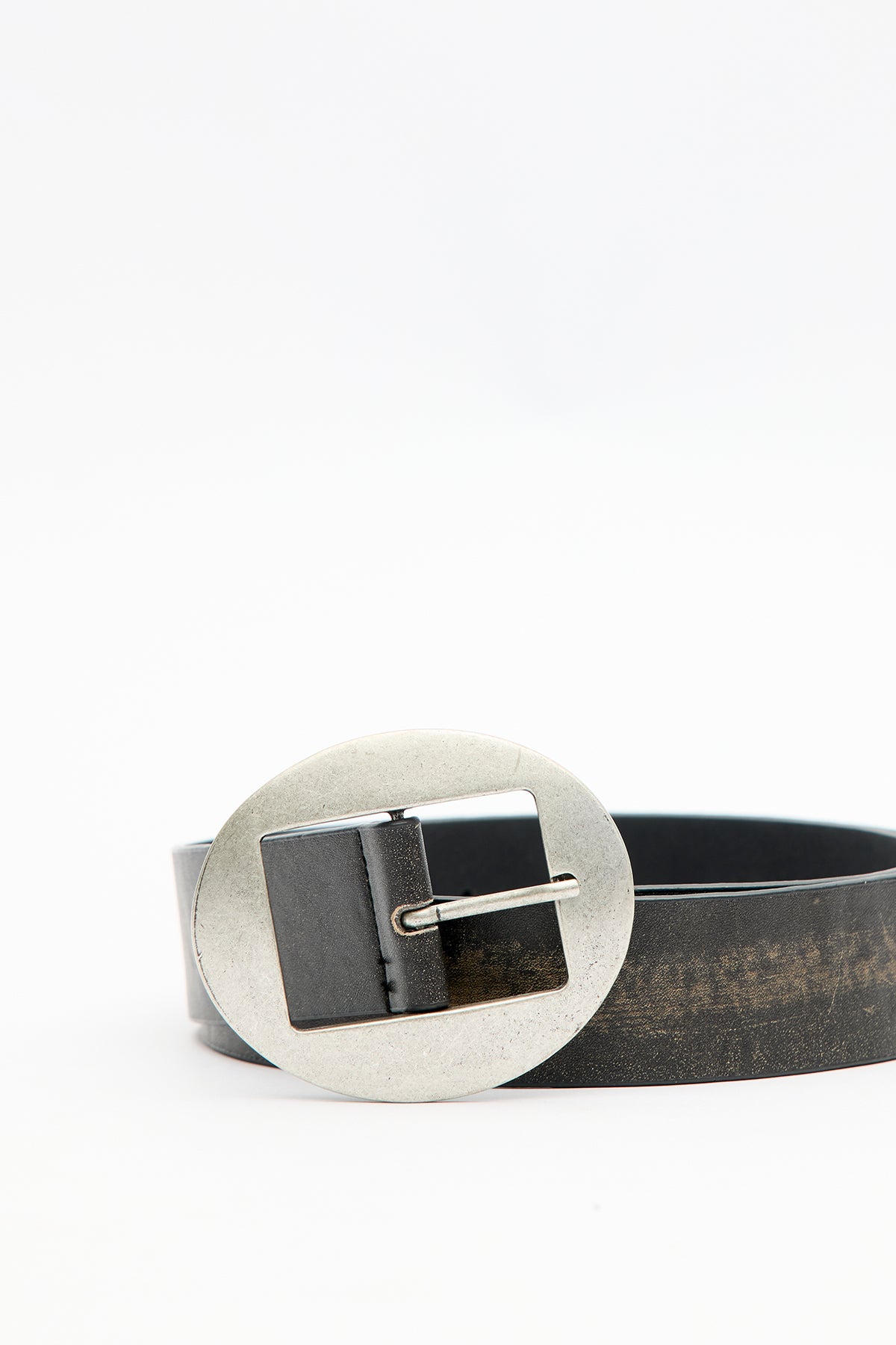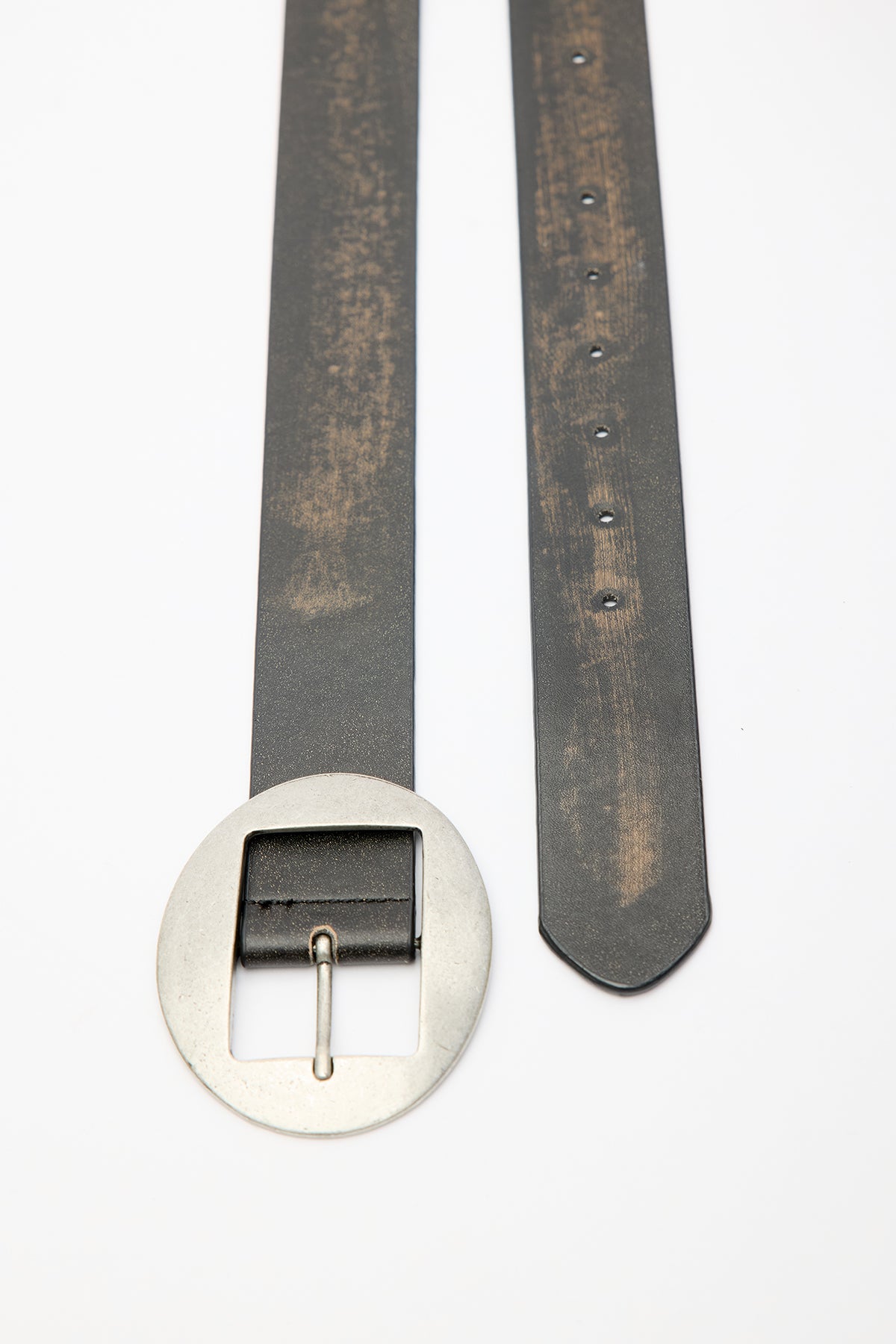 Oval antik nikel kaplamalı tokalı kemer, ayarlanabilir eskitme deri.