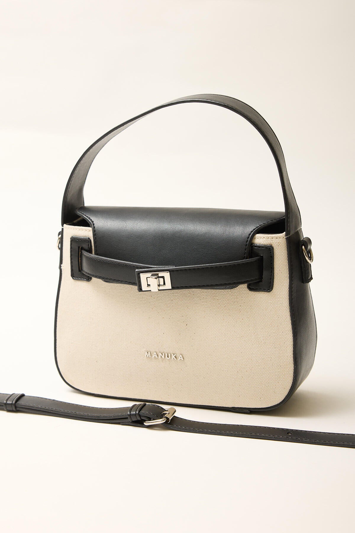 This chic accessory, adorned with the distinct Manuka logo, features a dedicated phone compartment, a wallet-like section with a zipper on the side, and a cardholder detail on the back. It is encased in a sleek faux leather finish and lined for added durability.