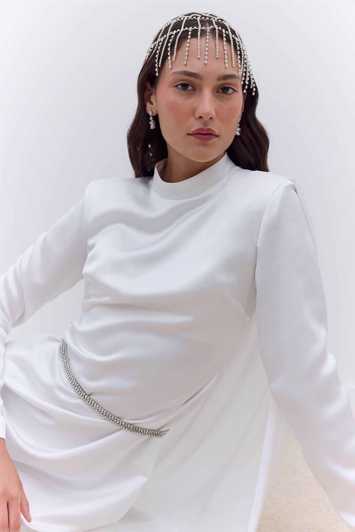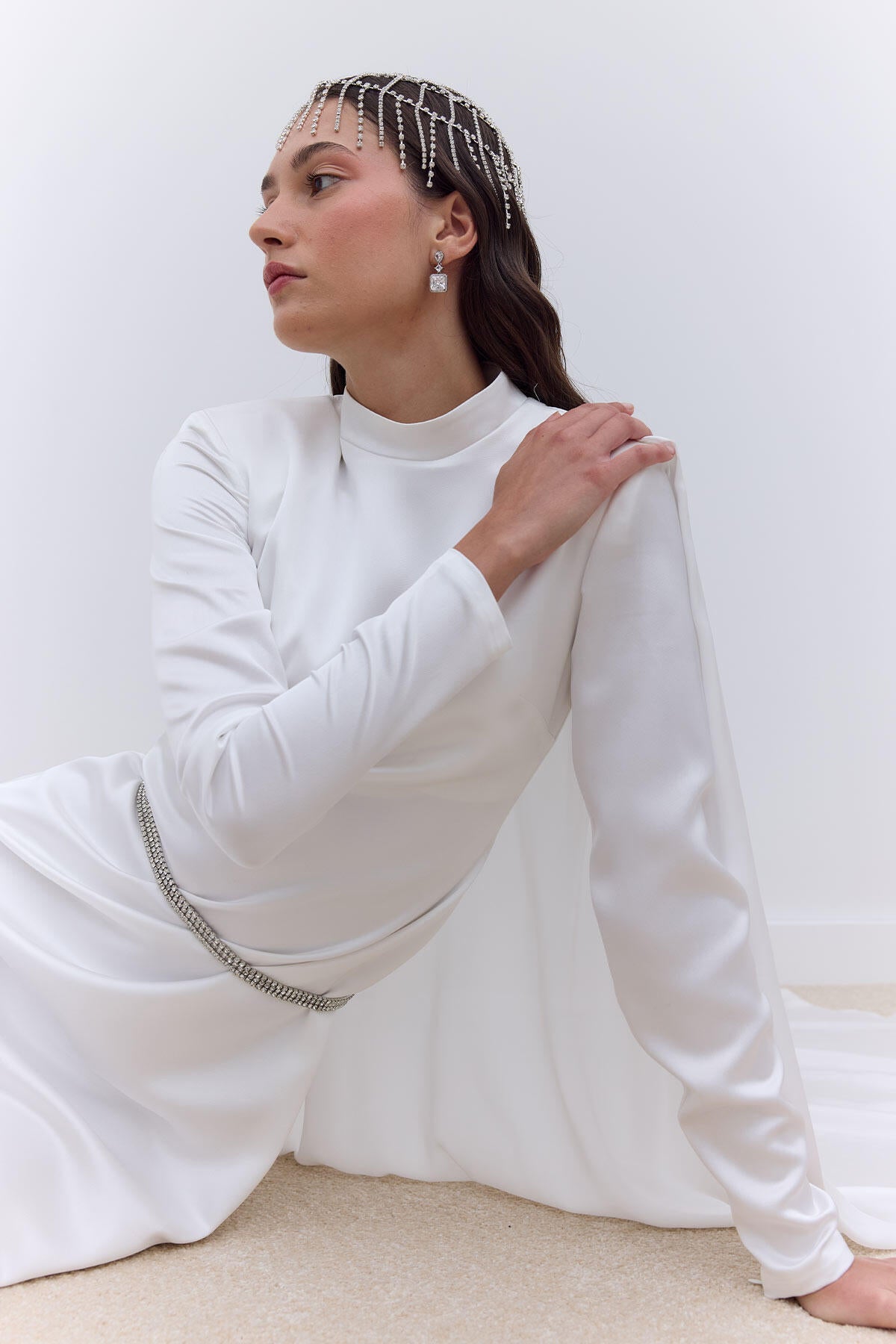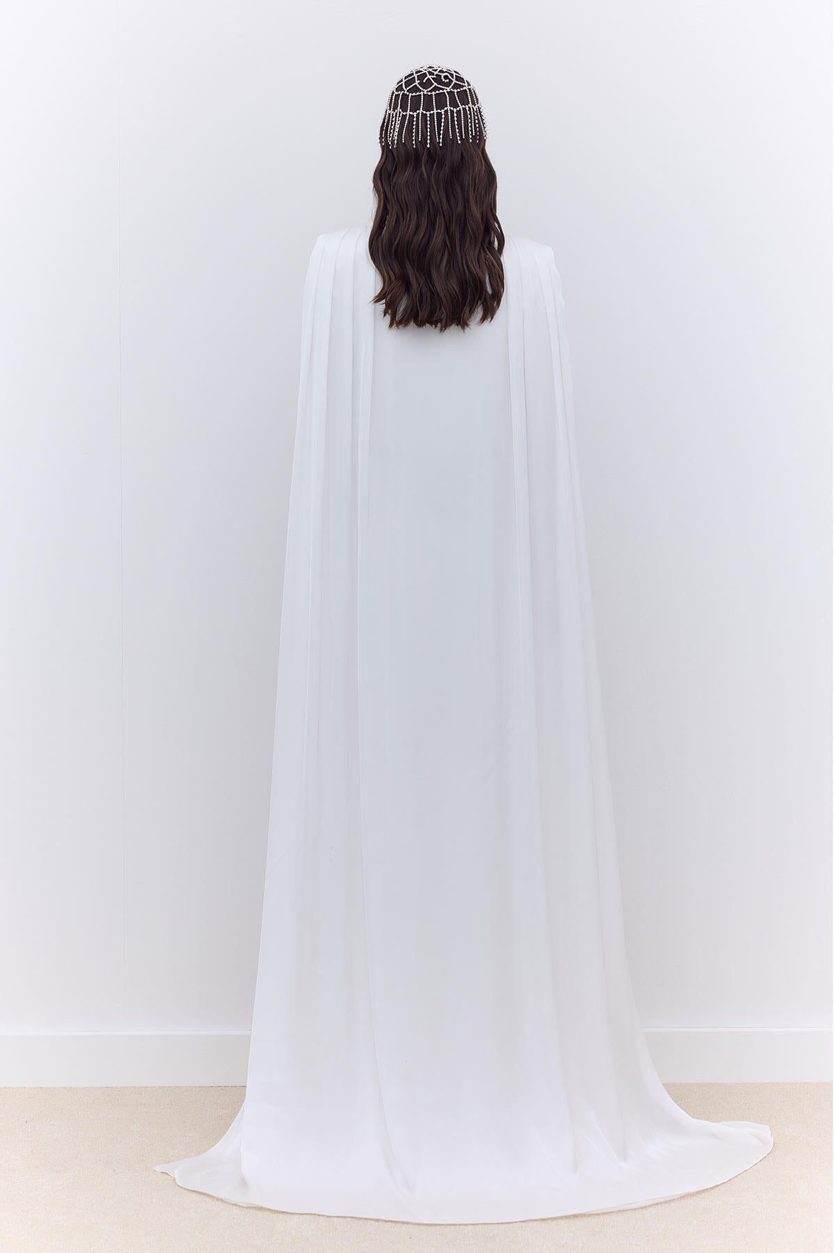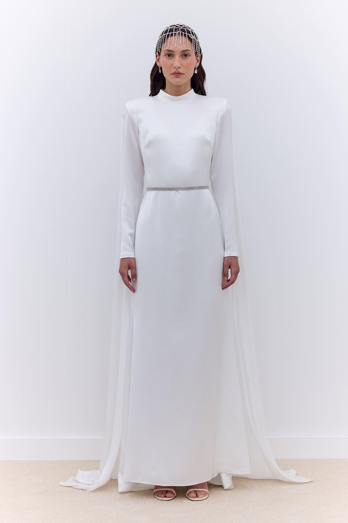 A sophisticated dress crafted from satin fabric, featuring a high neckline and a cape detail. The sleeves have concealed zippers, the shoulders are padded, and the dress is fully lined.