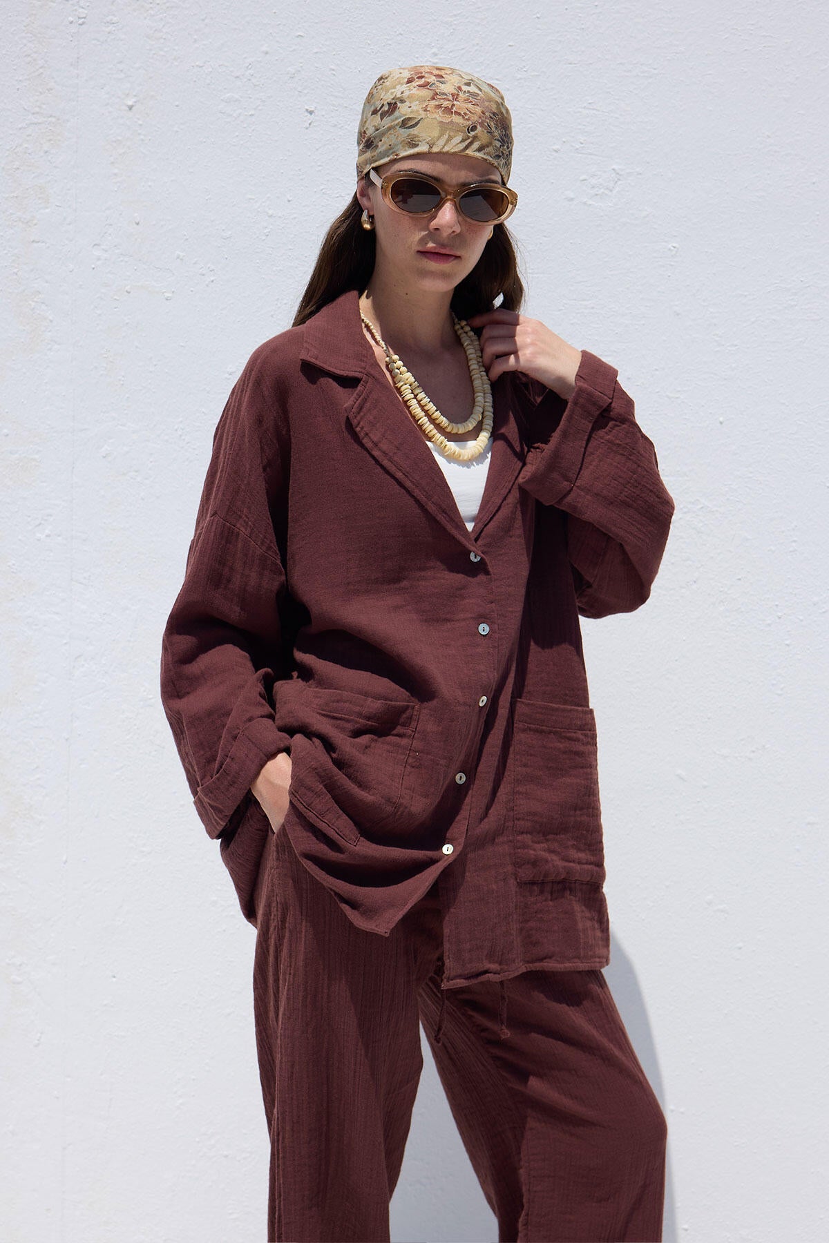Shirt collar, button closure, dropped shoulders, cuff folding detail, double pockets. Made from muslin fabric.