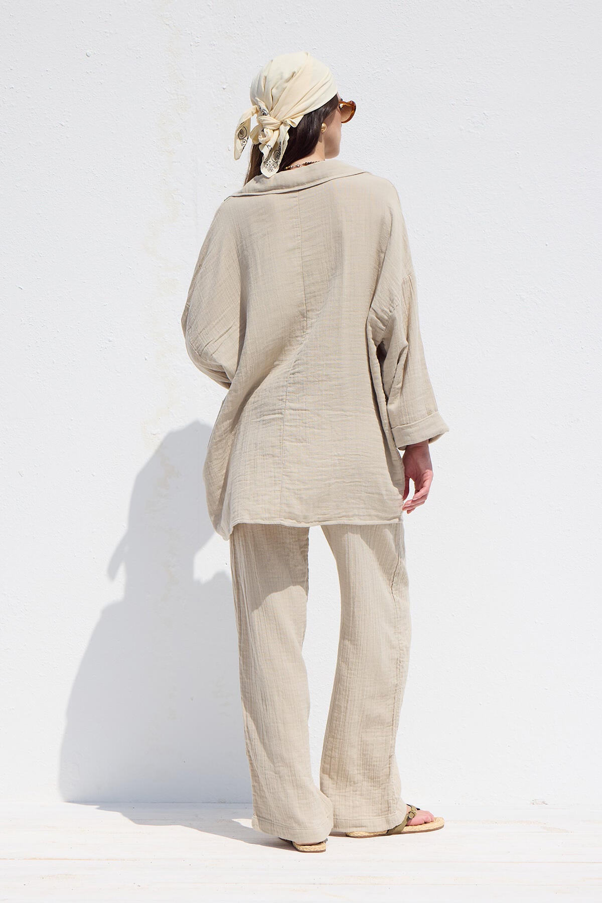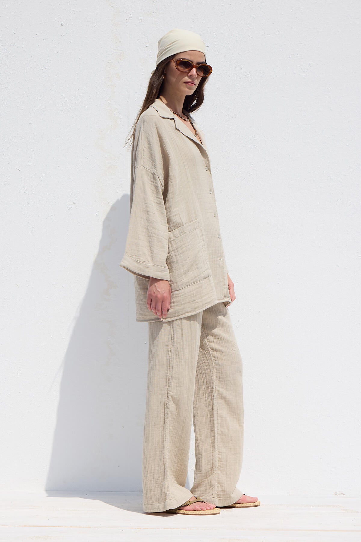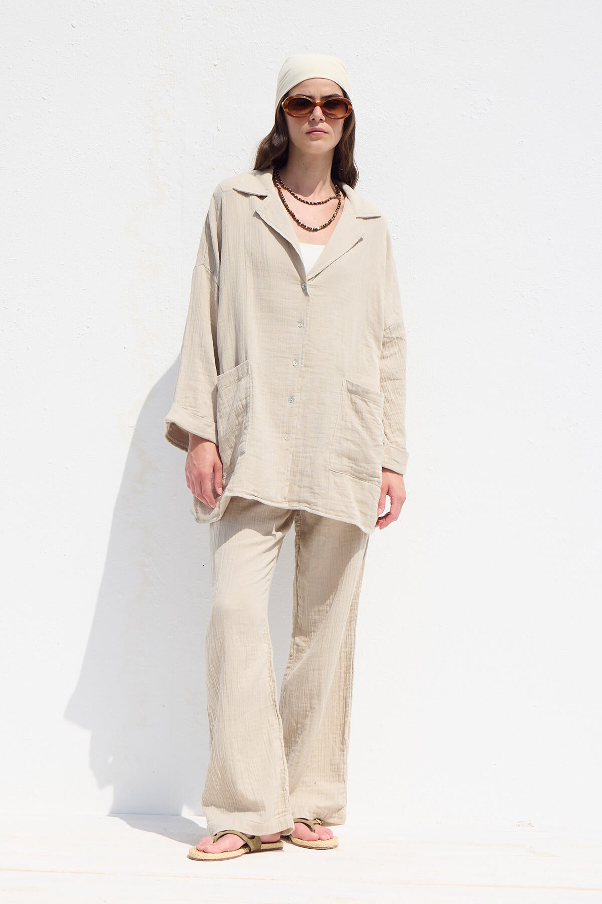 Shirt collar, button closure, dropped shoulders, cuff folding detail, double pockets. Made from muslin fabric.