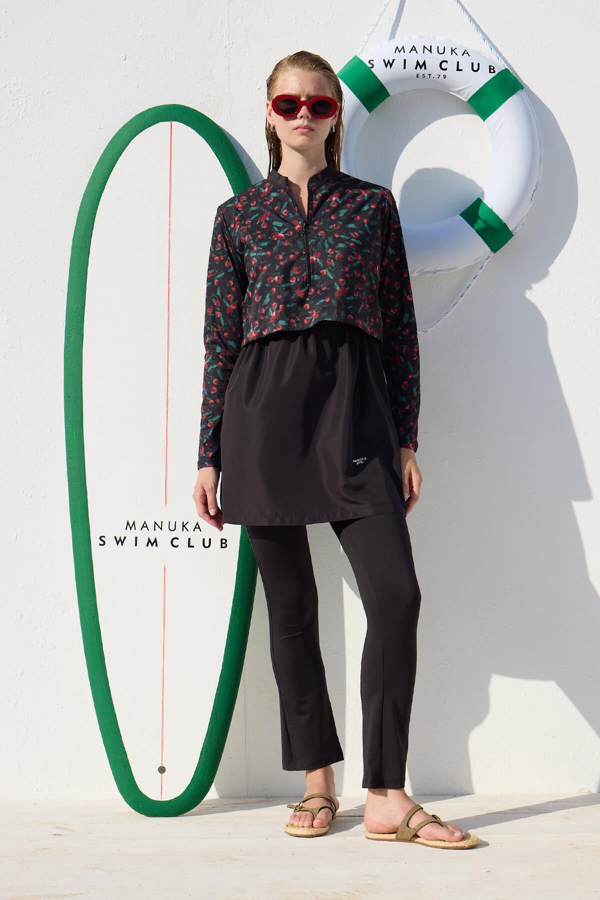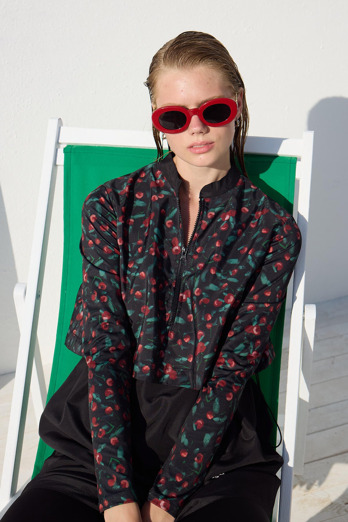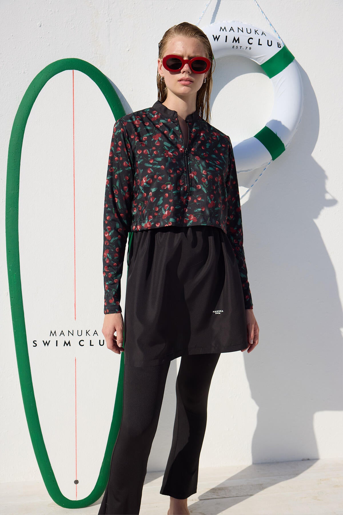 High-neck with zip closure, featuring a printed upper body, sleeves made from stretchy swimwear fabric, and a body crafted from fast-drying woven swimwear fabric. It includes an elastic waistband and stopper for a secure fit.