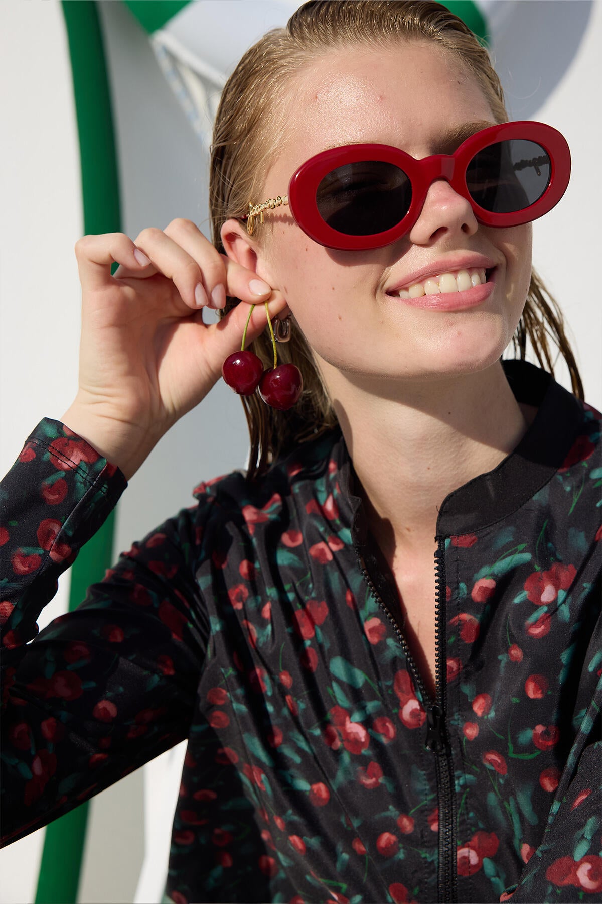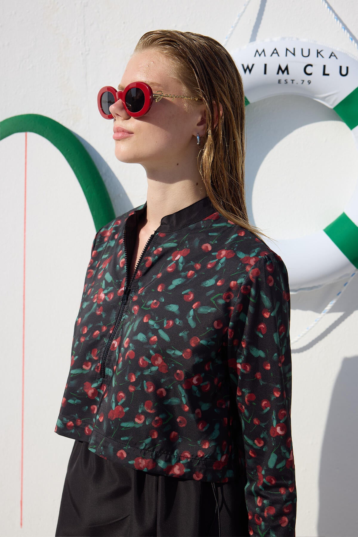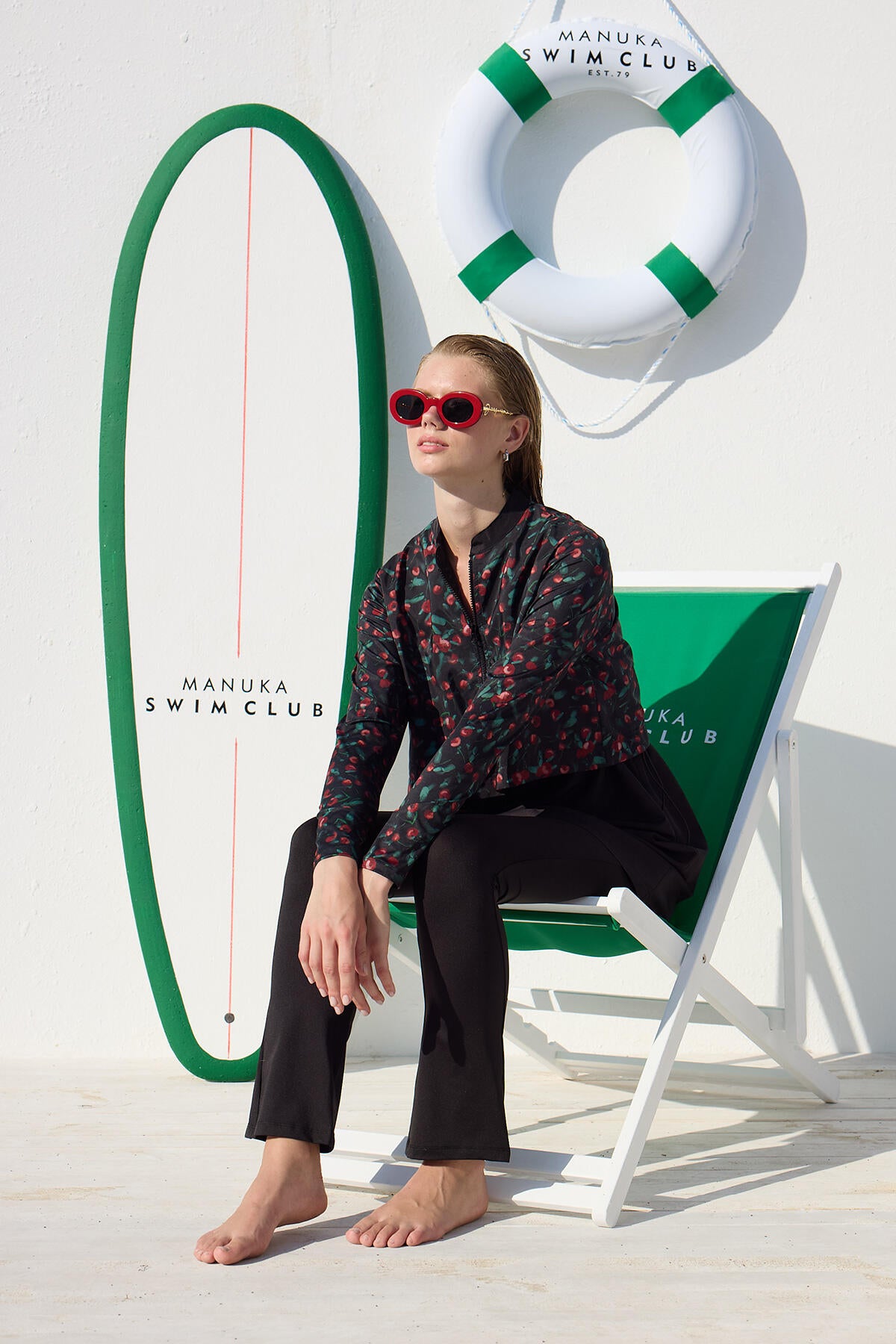 High-neck with zip closure, featuring a printed upper body, sleeves made from stretchy swimwear fabric, and a body crafted from fast-drying woven swimwear fabric. It includes an elastic waistband and stopper for a secure fit.