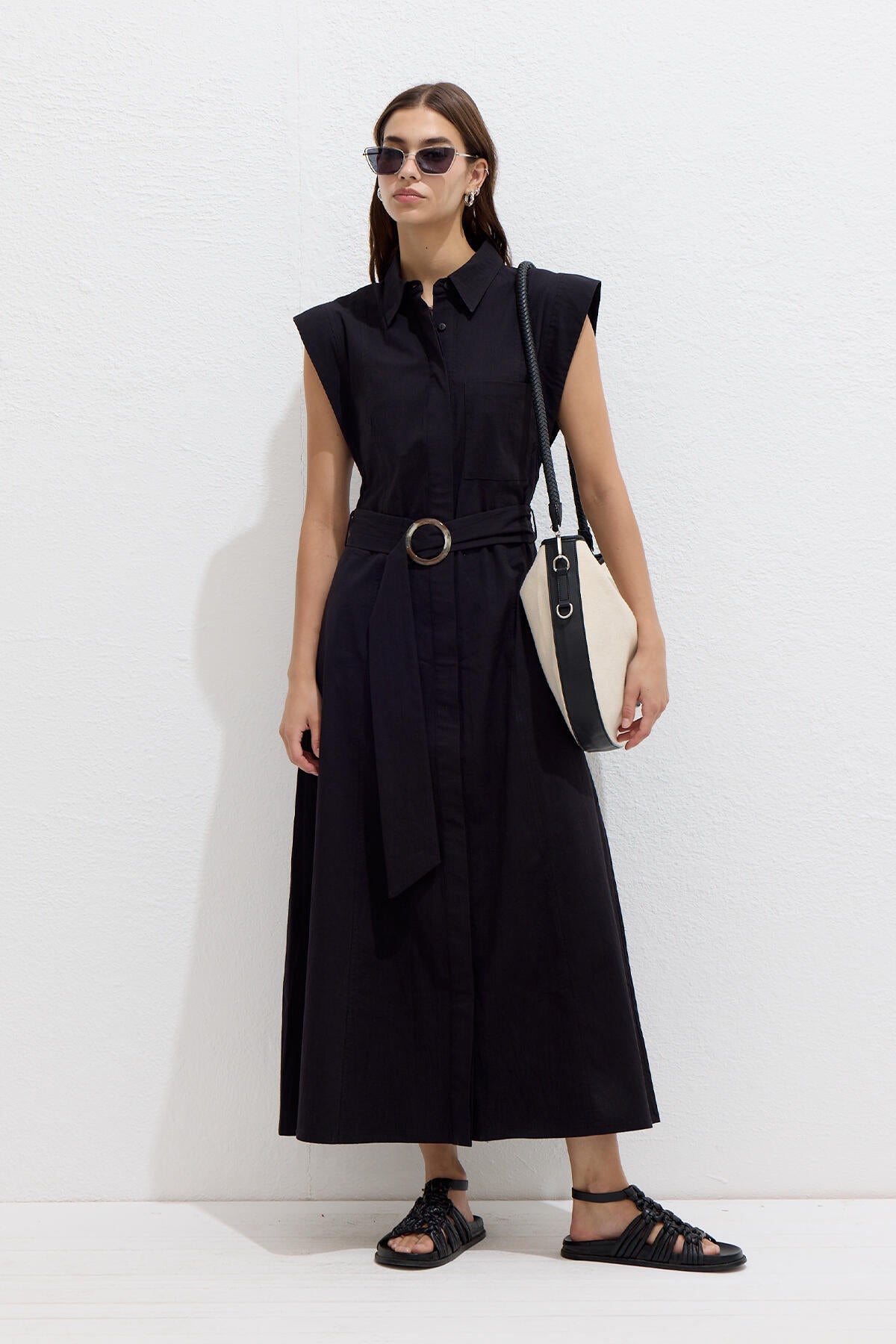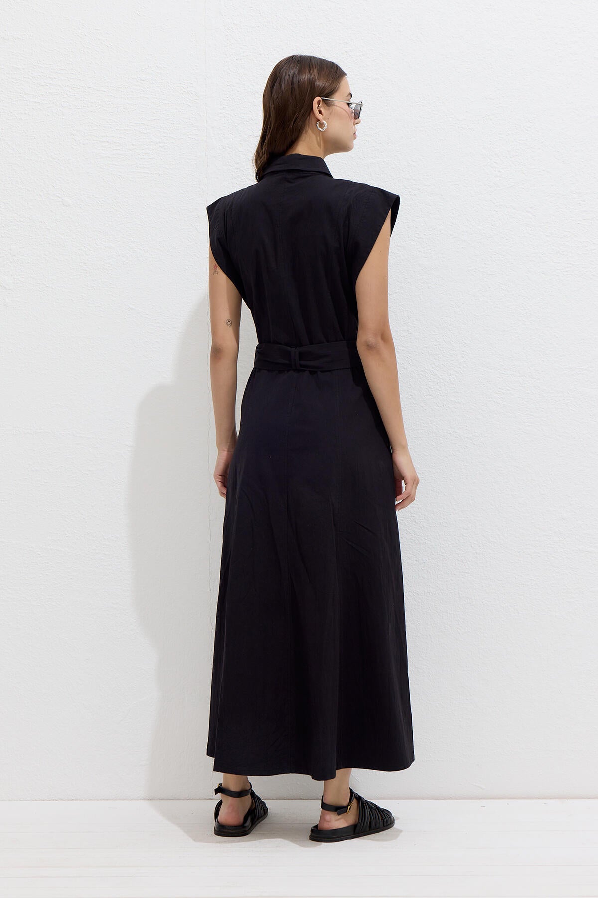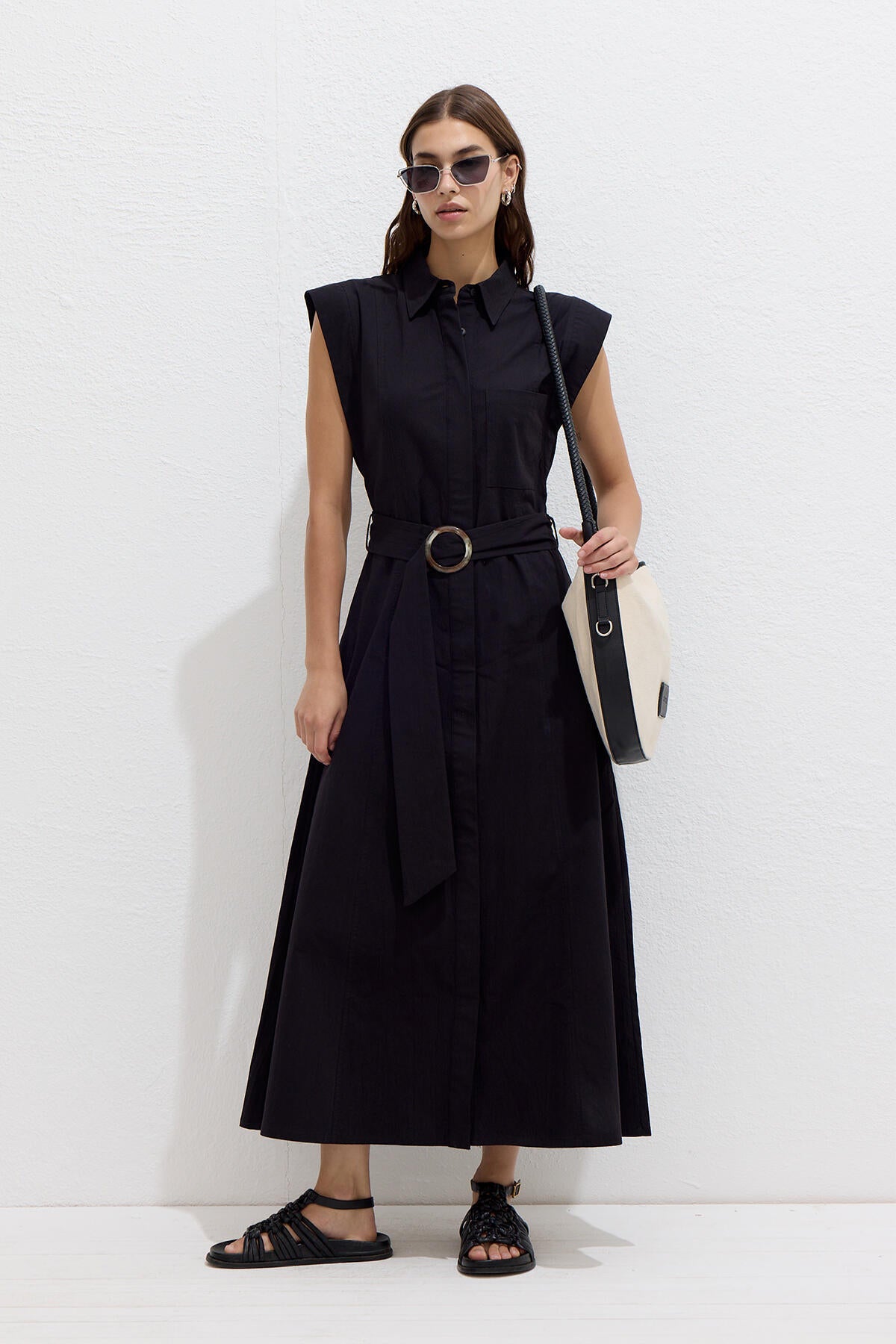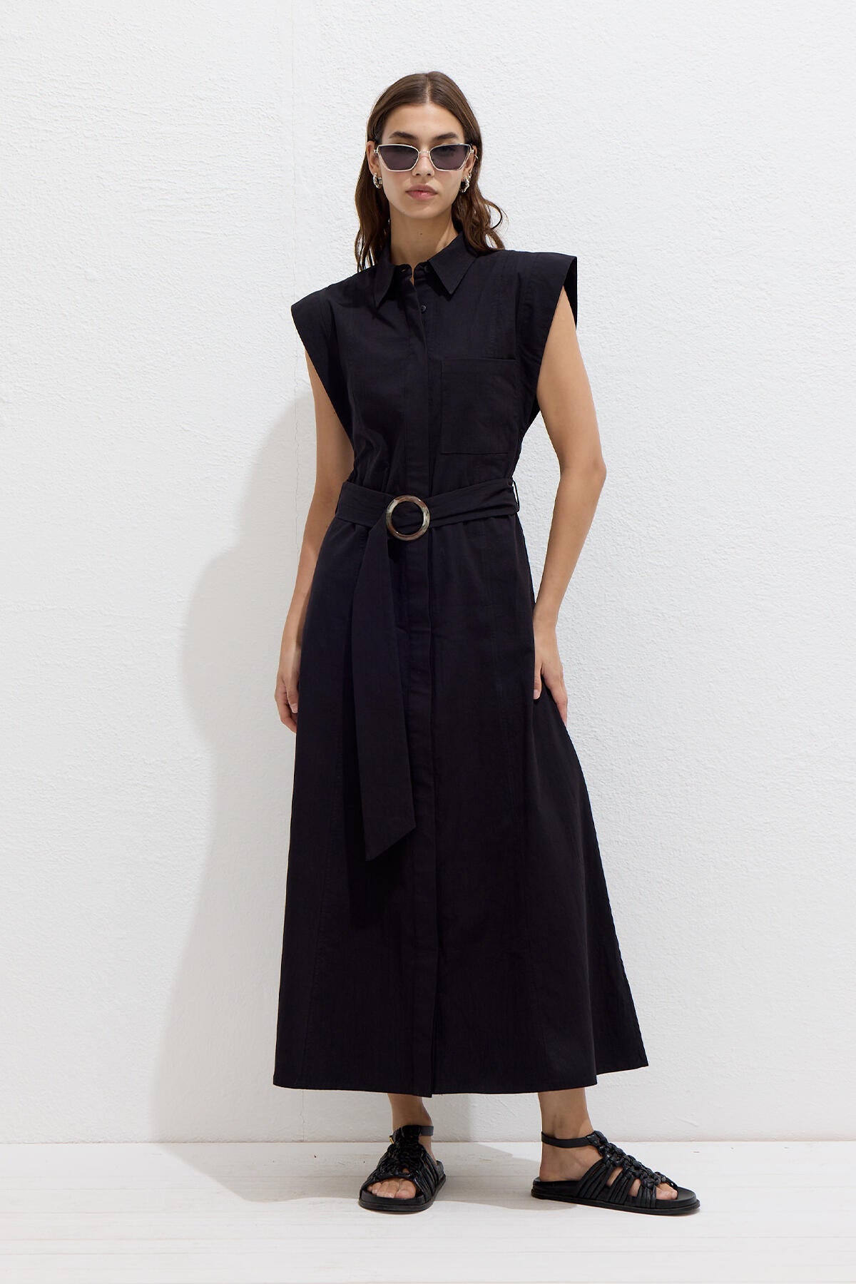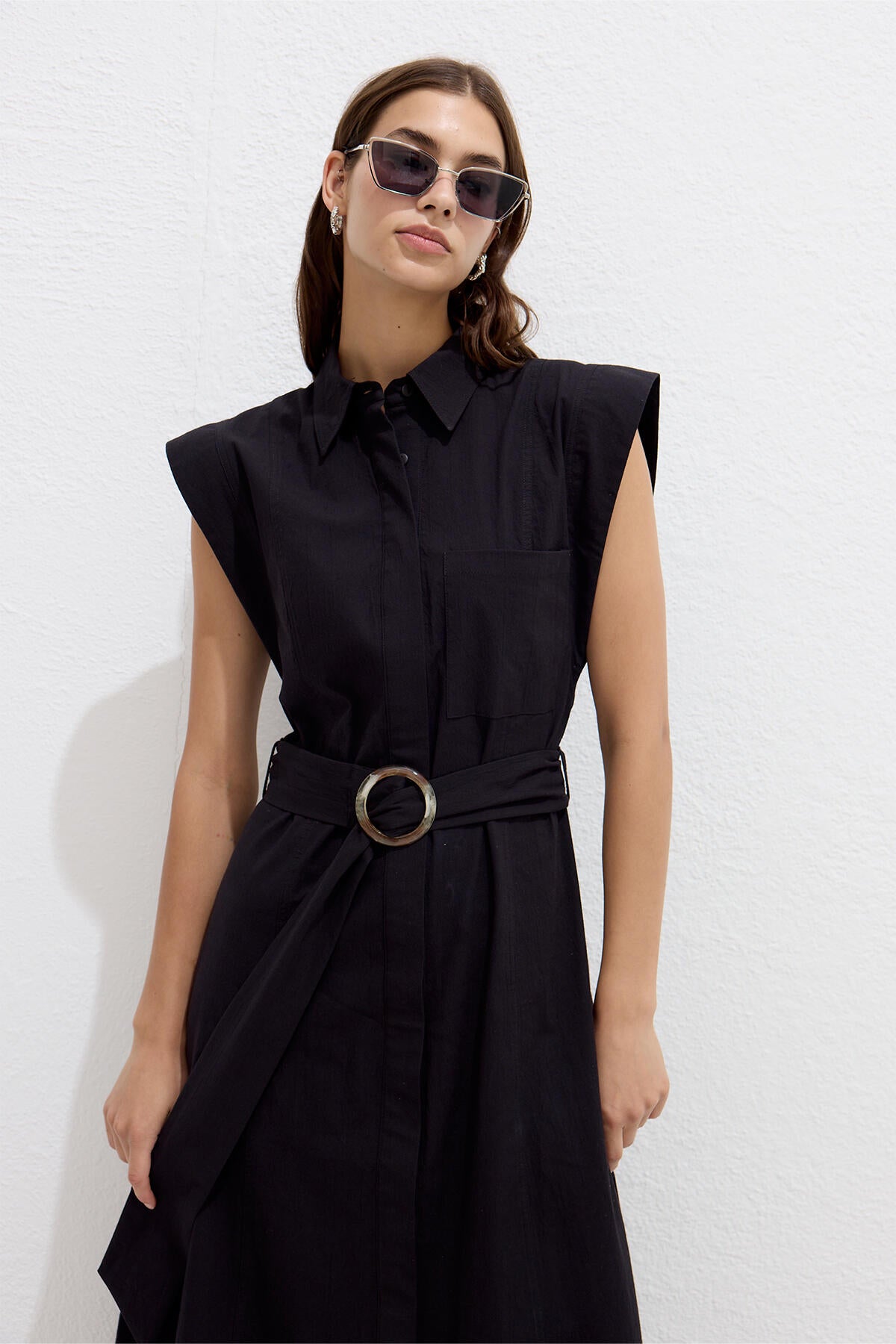 This dress features a shirt collar, button closure, self-fabric belt, and shoulder epaulet details. It is unlined and made from specially textured fabric.