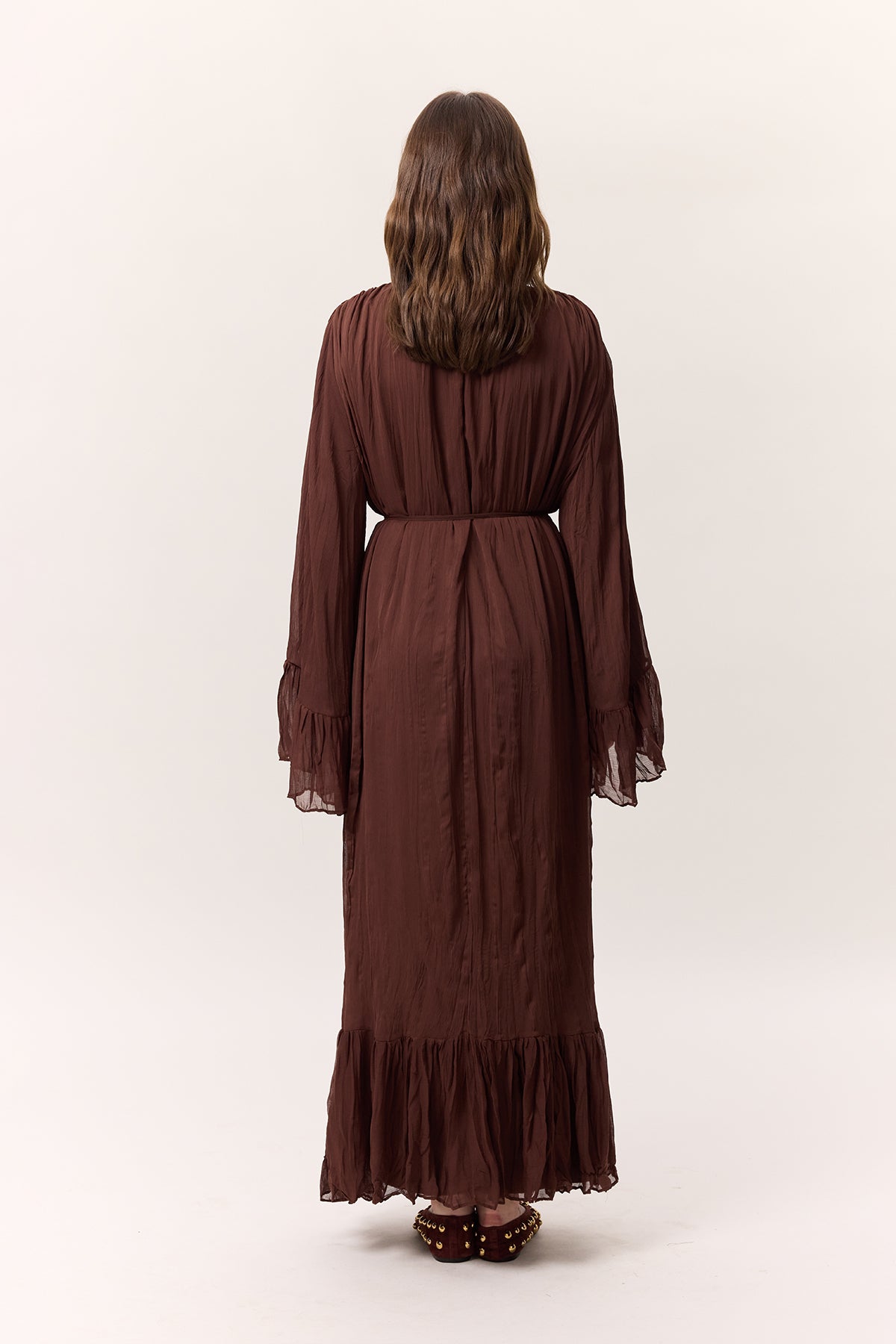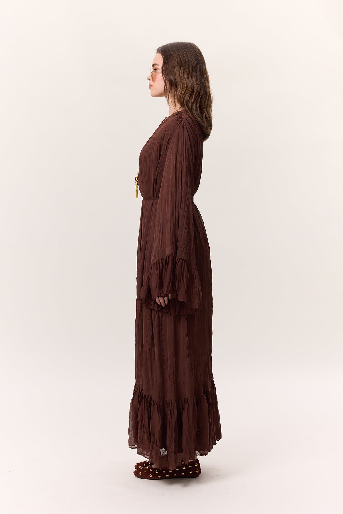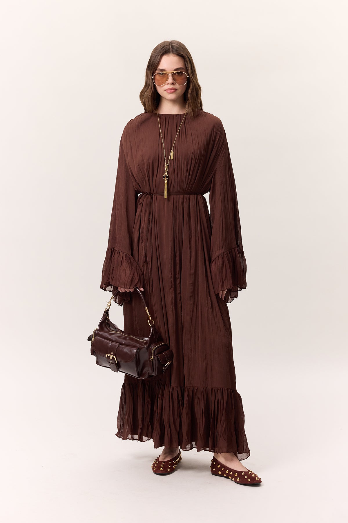 Crushed Pleated Tiered Maxi Dress Brown