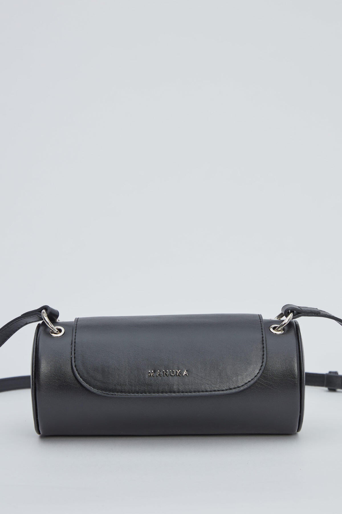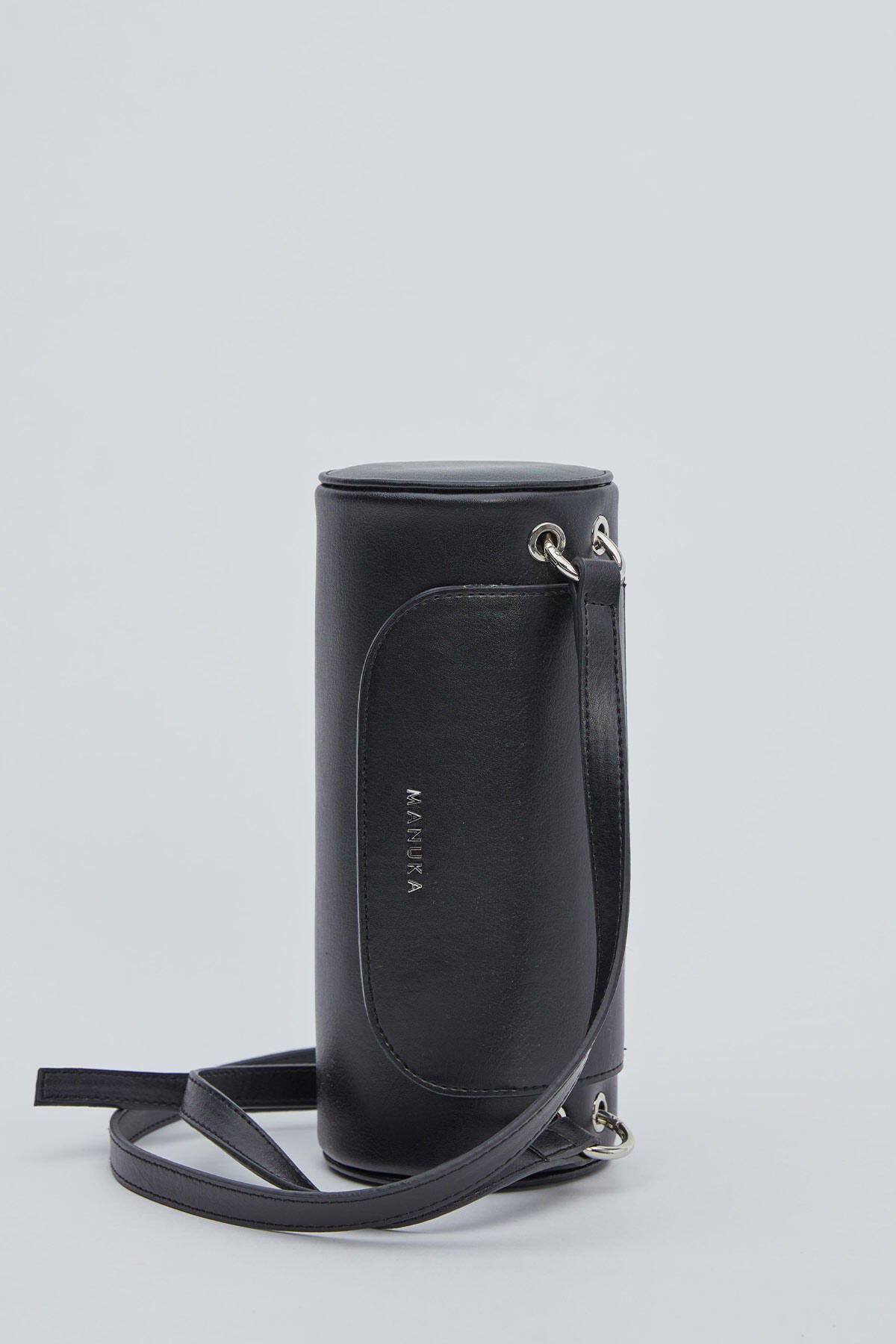 Cylinder-shaped and crafted from sleek faux leather, this bag features a metal logo detail for a touch of sophistication. It secures with a magnetic clip closure and comes with an adjustable long strap for customizable wear.