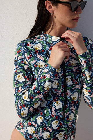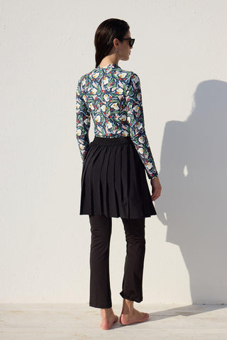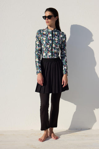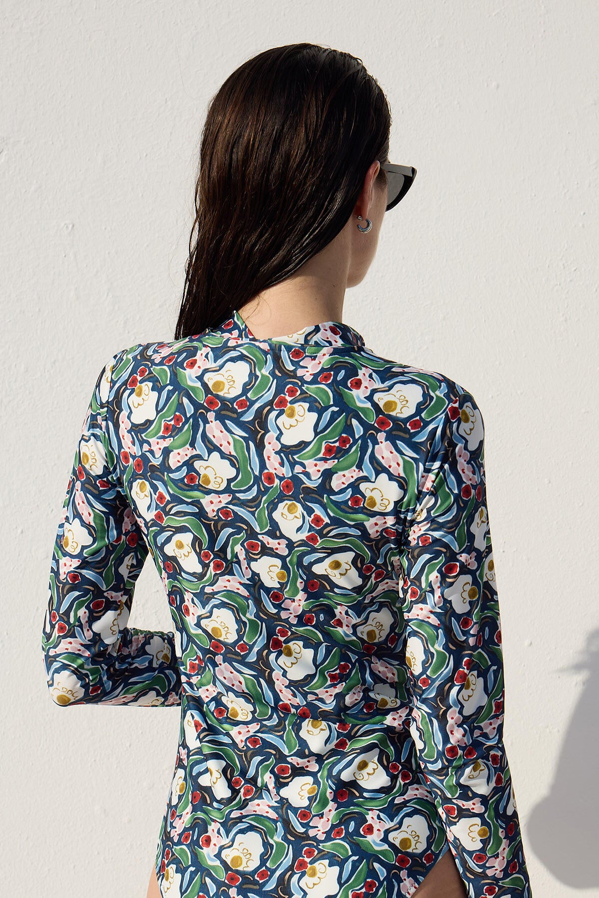 Crafted from flexible swimwear fabric with a composition of 90% polyester and 10% elastane, this swimsuit offers both comfort and stretch for a flattering fit. The high neckline and front zipper closure ensure a secure and stylish look, while the padded cups provide support and shape to the bust. Designed with a vibrant pattern, it adds a pop of color to your poolside ensemble (only includes the upper part of the swimsuit).
