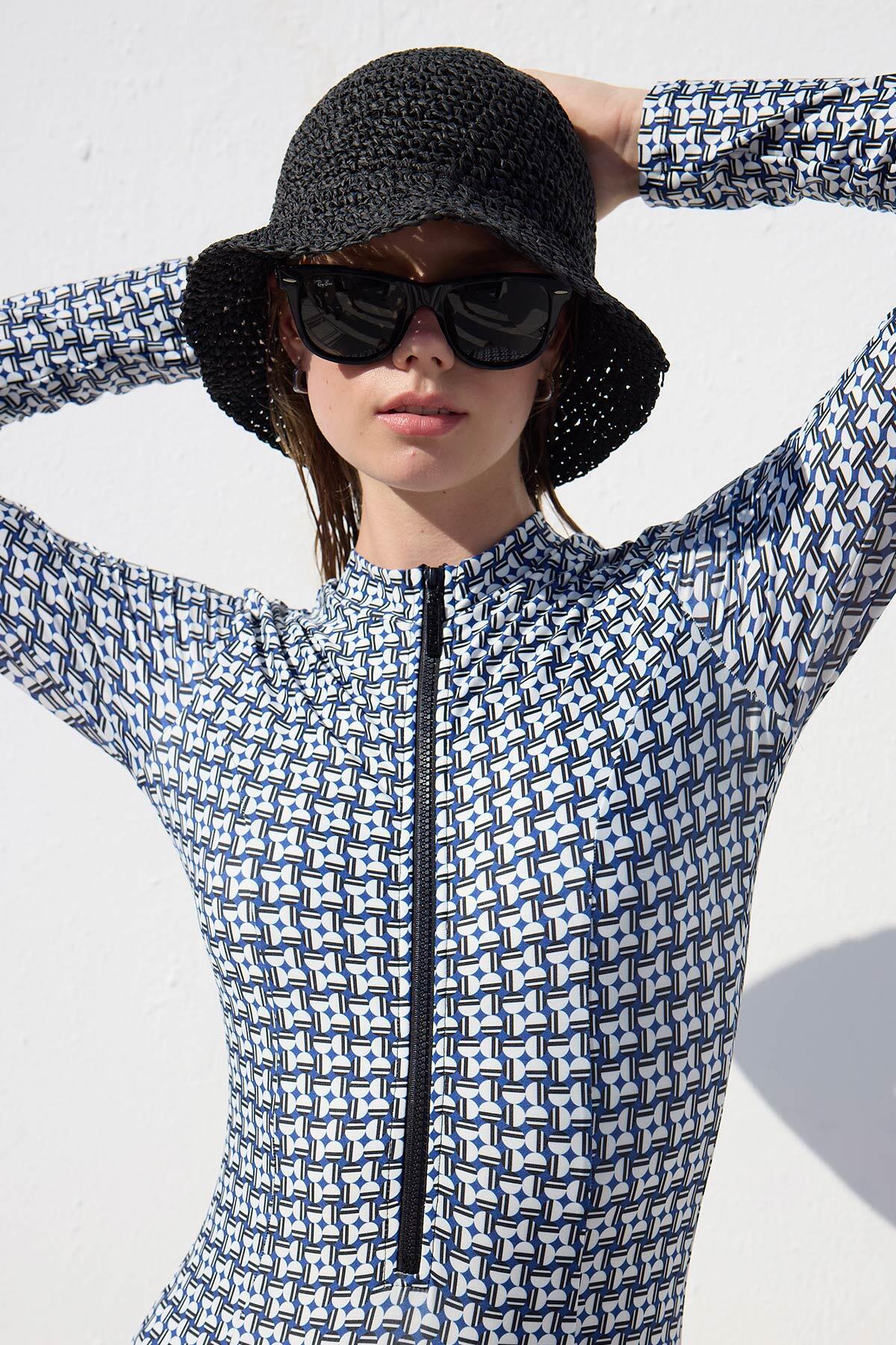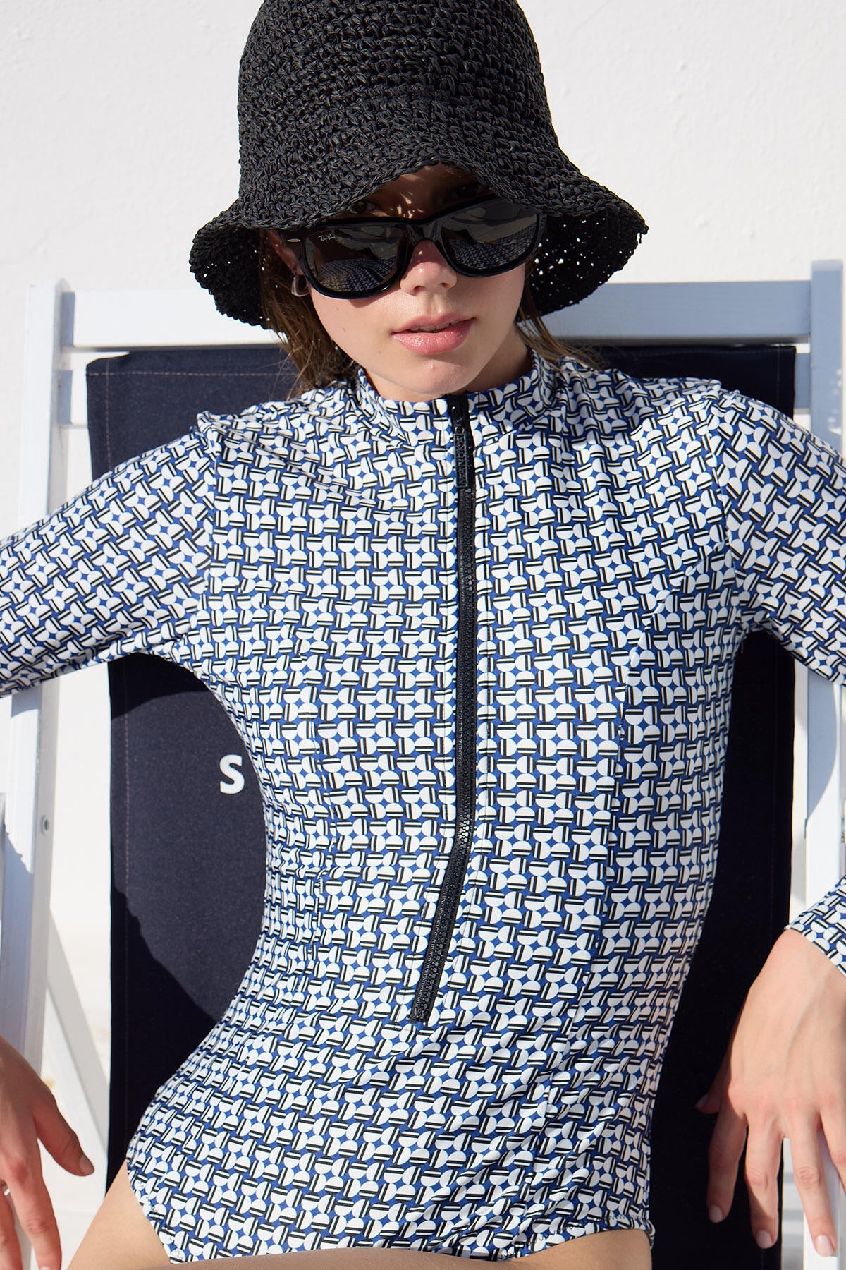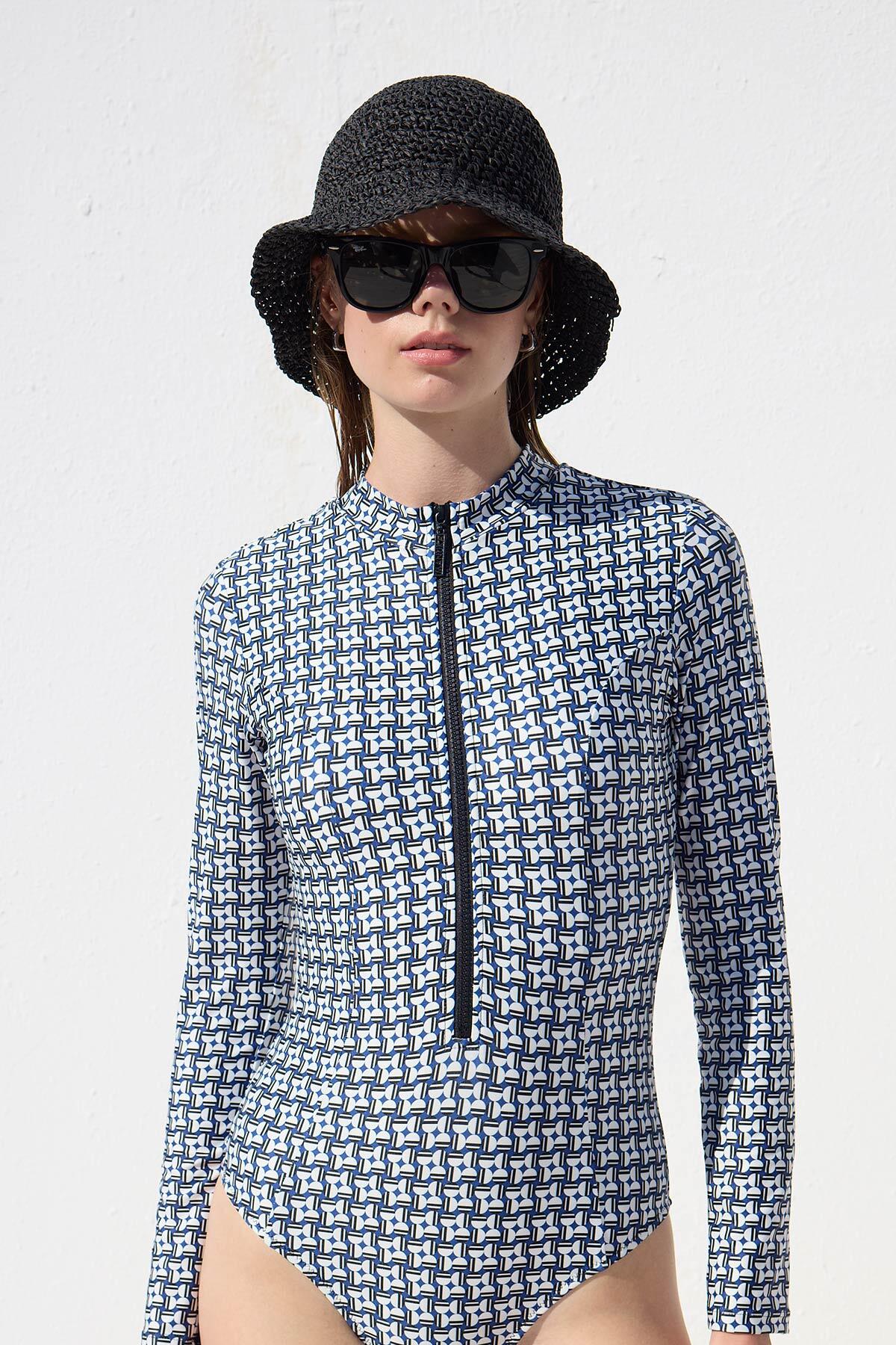Crafted from flexible swimwear fabric with a composition of 90% polyester and 10% elastane, this swimsuit offers both comfort and stretch for a flattering fit. The high neckline and front zipper closure ensure a secure and stylish look, while the padded cups provide support and shape to the bust. Designed with a vibrant pattern, it adds a pop of color to your poolside ensemble (only includes the upper part of the swimsuit).
