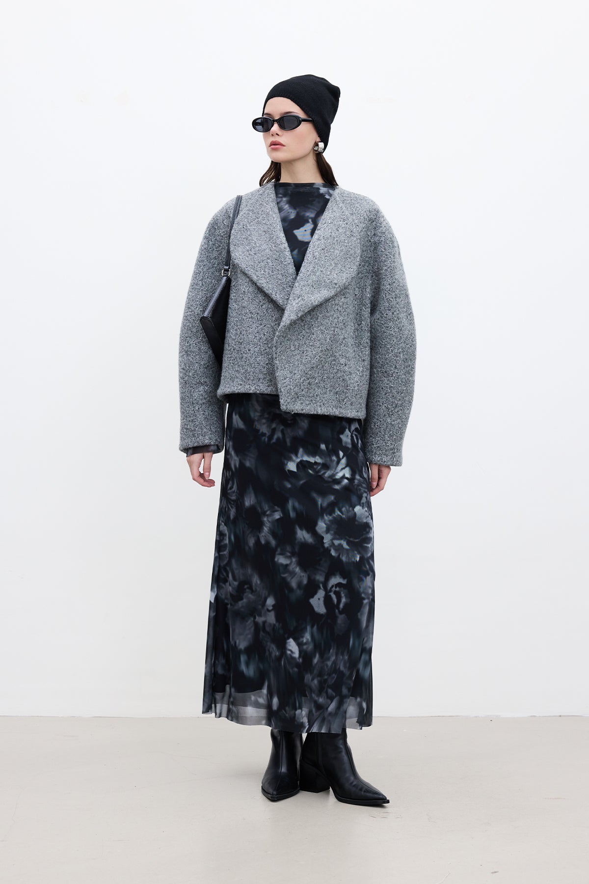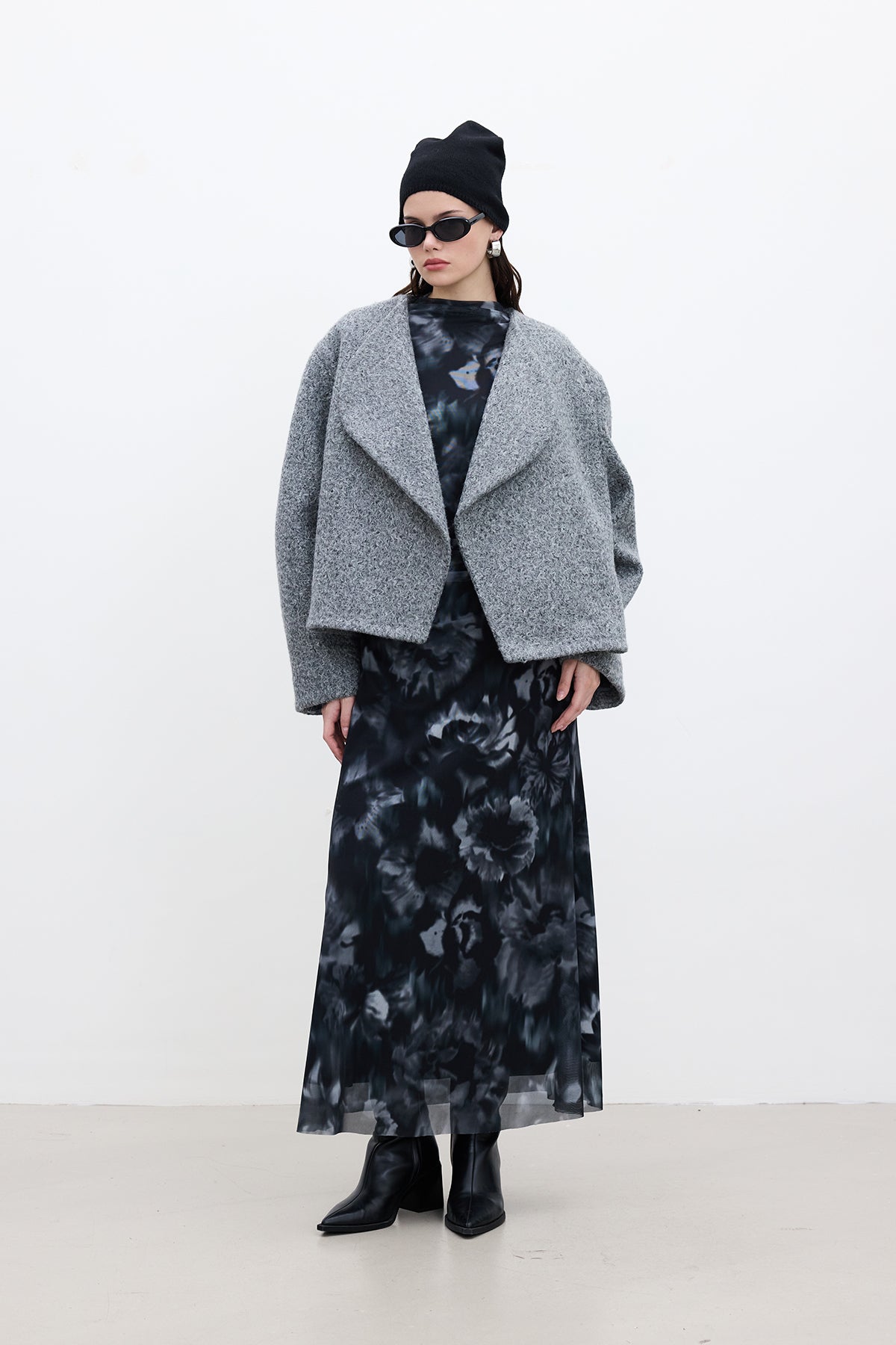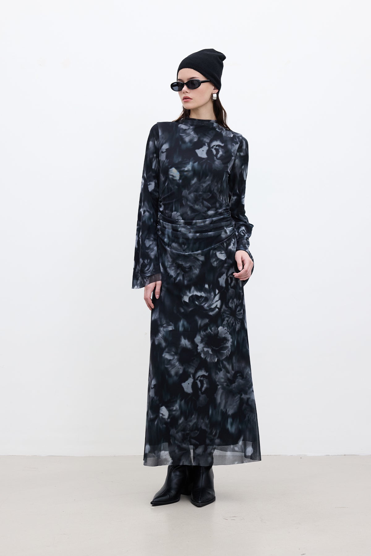 Patterned Wide-Sleeve Tulle Dress Black
