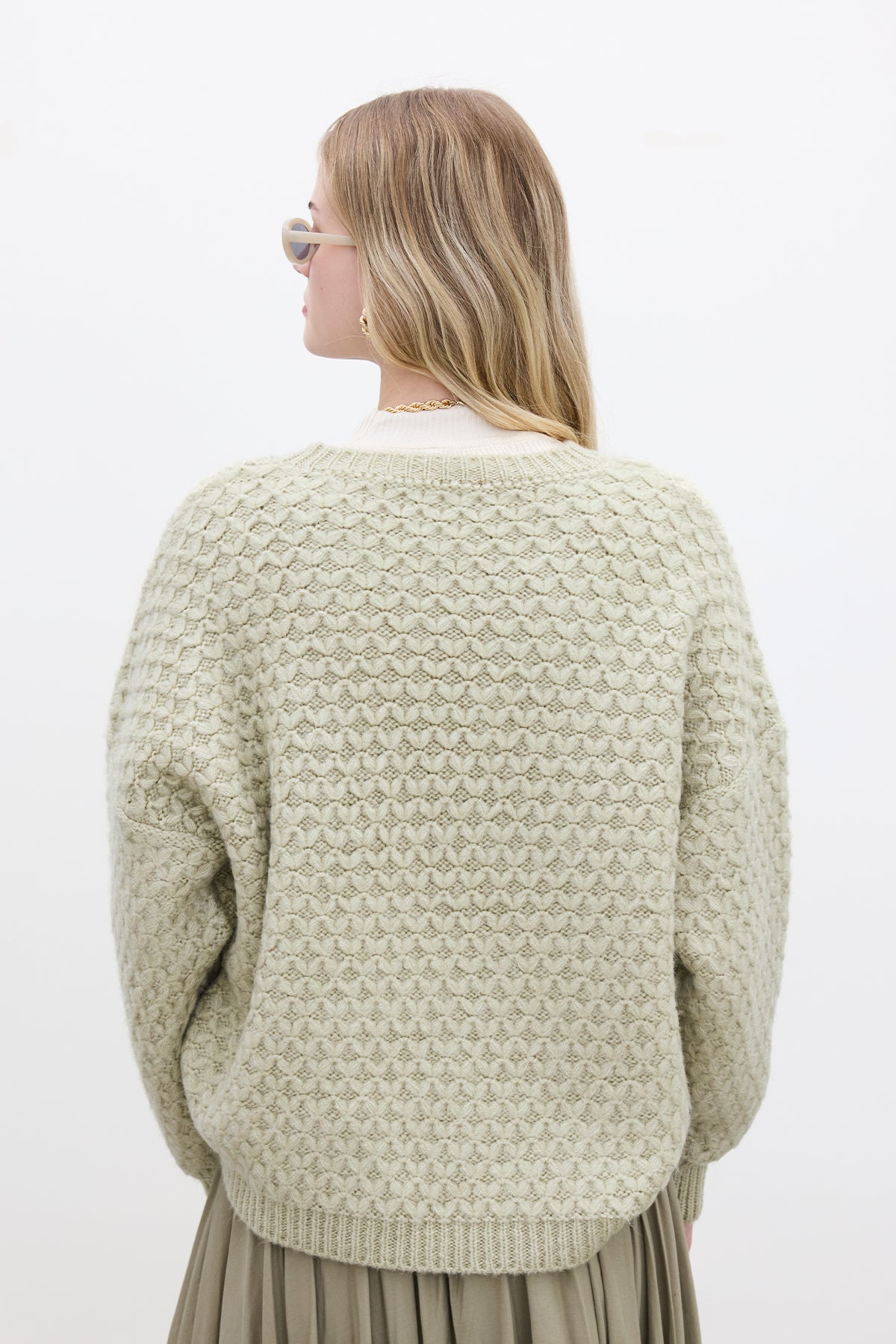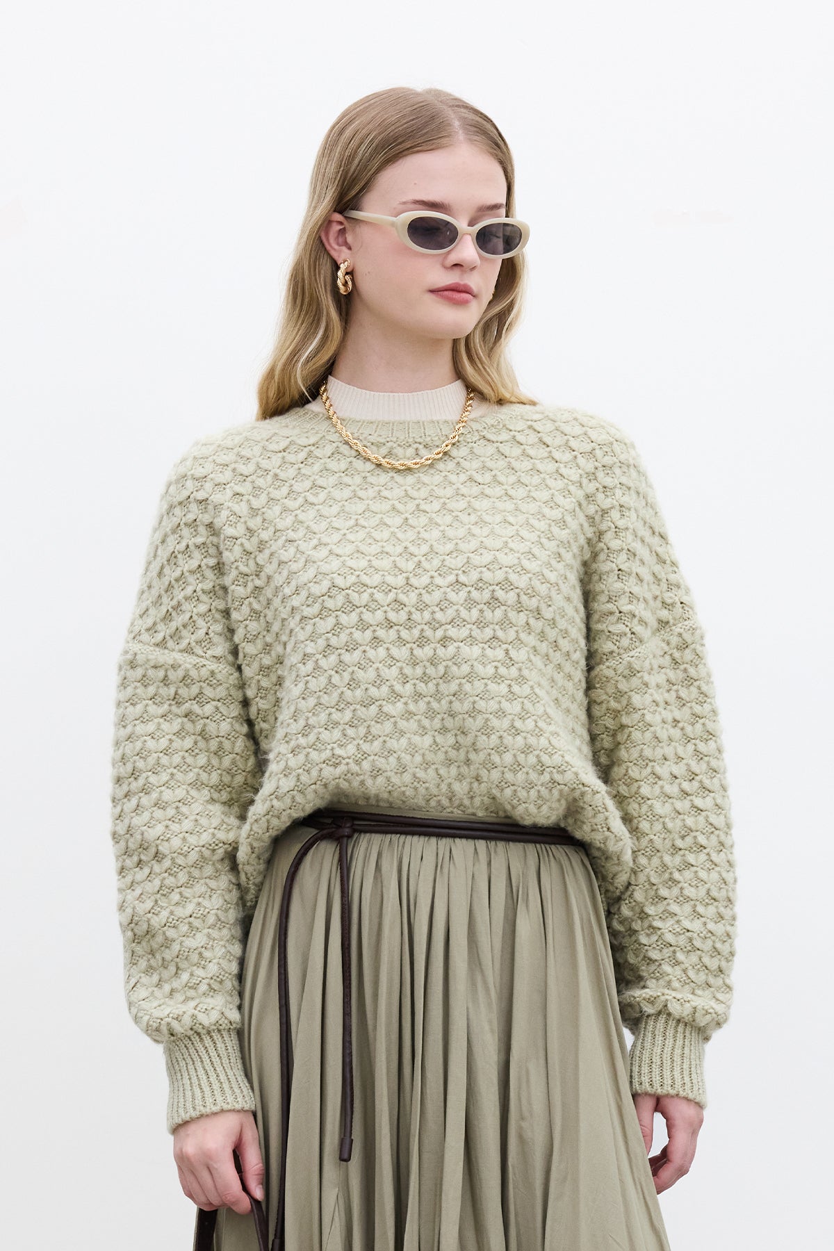 Crafted from intricately patterned knit fabric, this sweater is a stylish statement piece for cooler days. The crew neck adds a touch of sophistication, while the dropped shoulders and oversized silhouette offer a relaxed yet on-trend look. Designed with a unique patterned knit, it exudes contemporary charm and individuality.