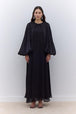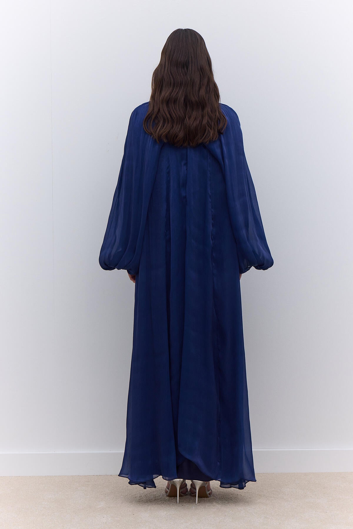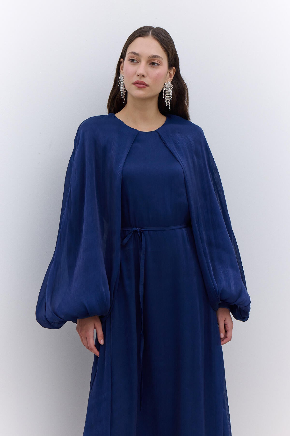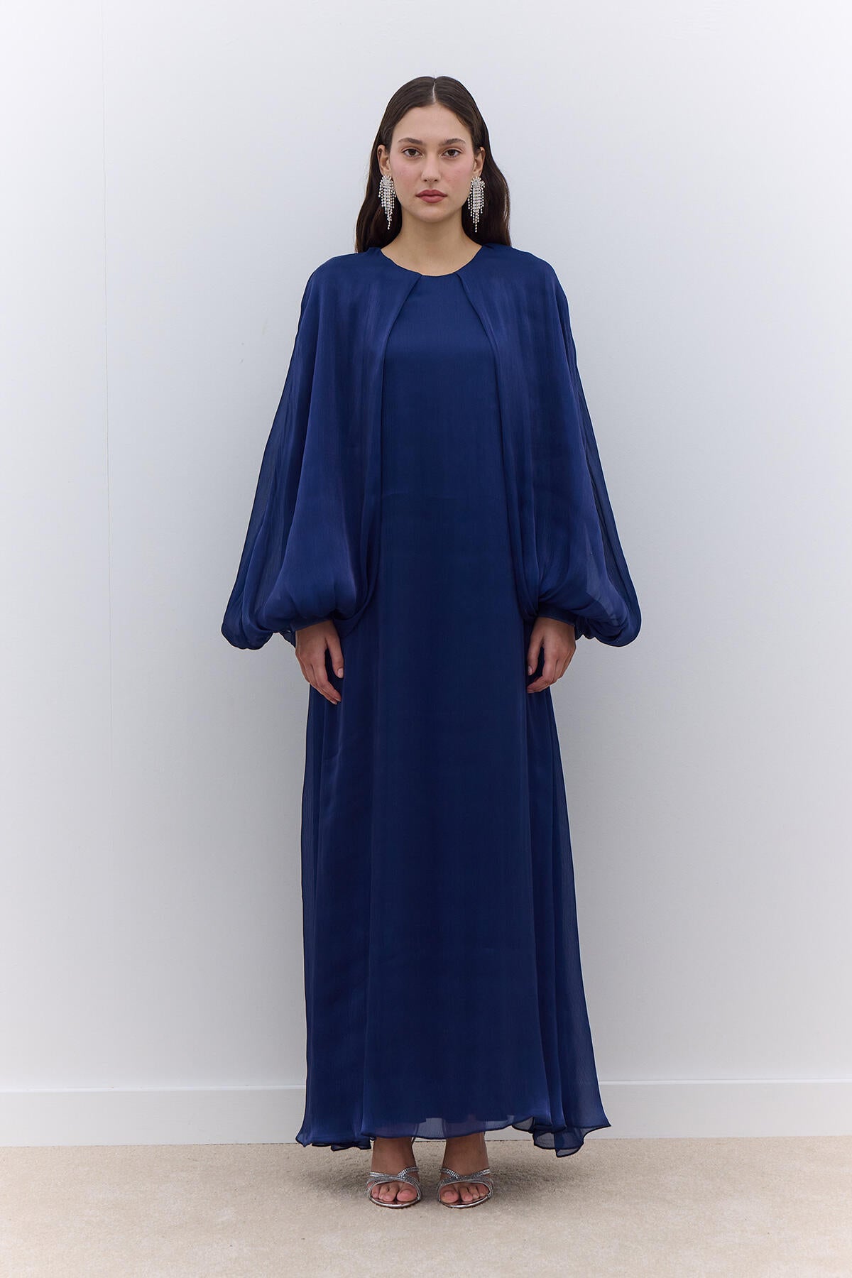 This elegant full-length dress features raglan balloon sleeves with buttoned cuffs, a waist belt, and a concealed zip closure. The dress is fully lined for added comfort and structure.