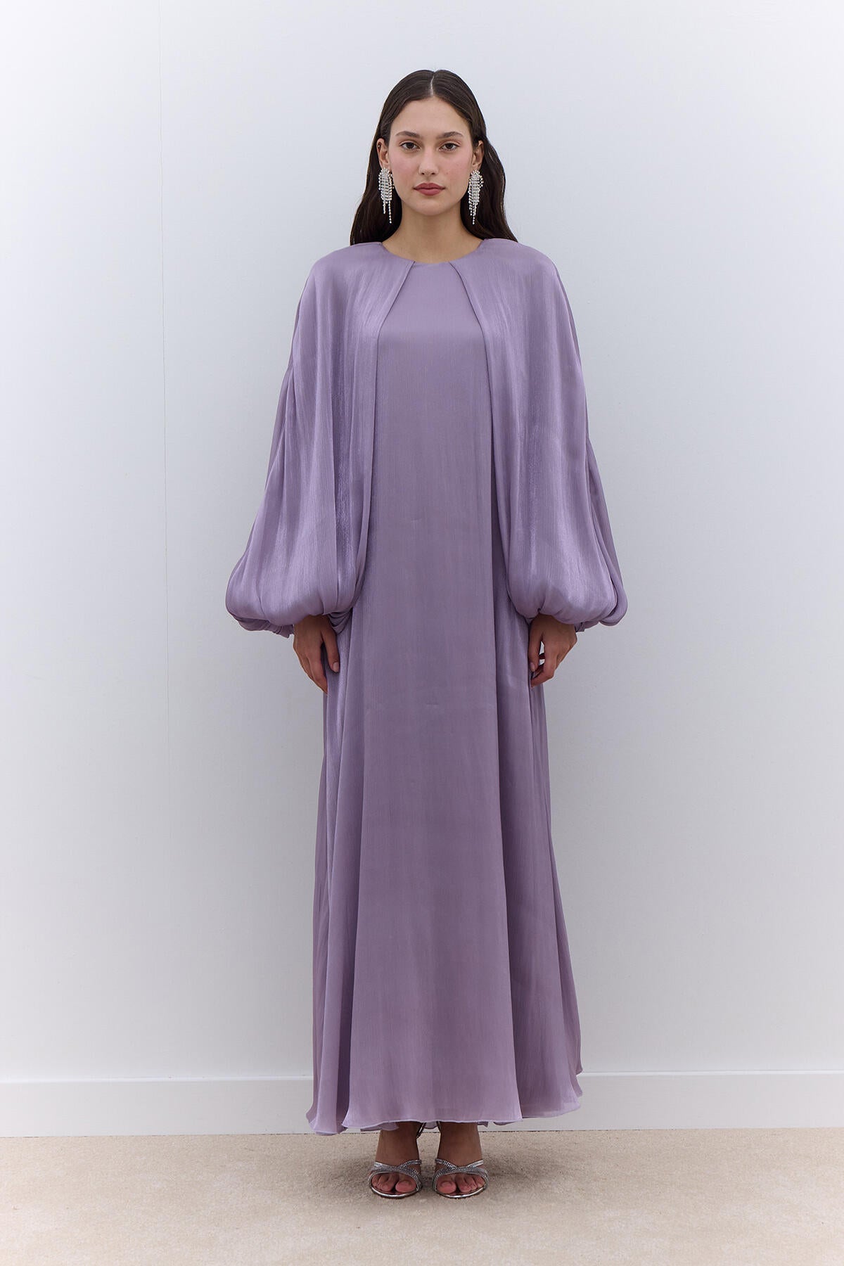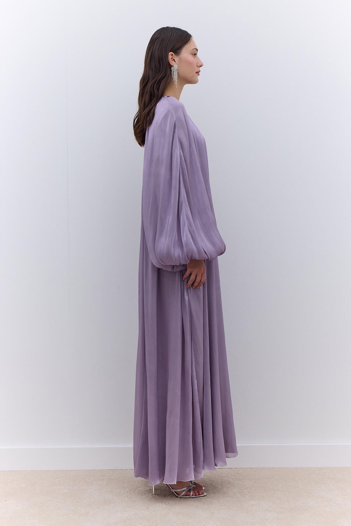 This elegant full-length dress features raglan balloon sleeves with buttoned cuffs, a waist belt, and a concealed zip closure. The dress is fully lined for added comfort and structure.