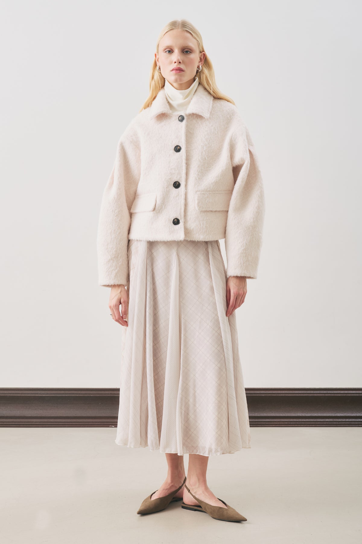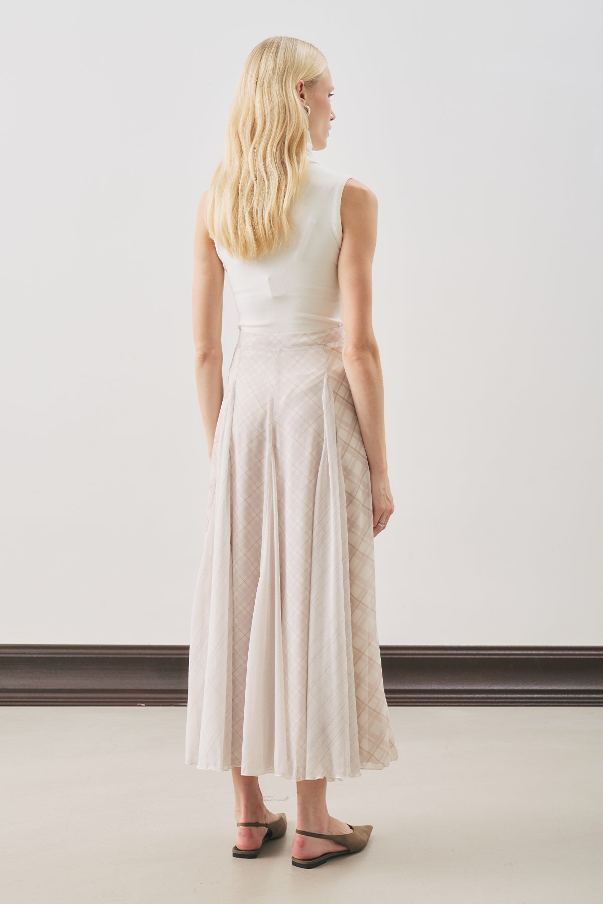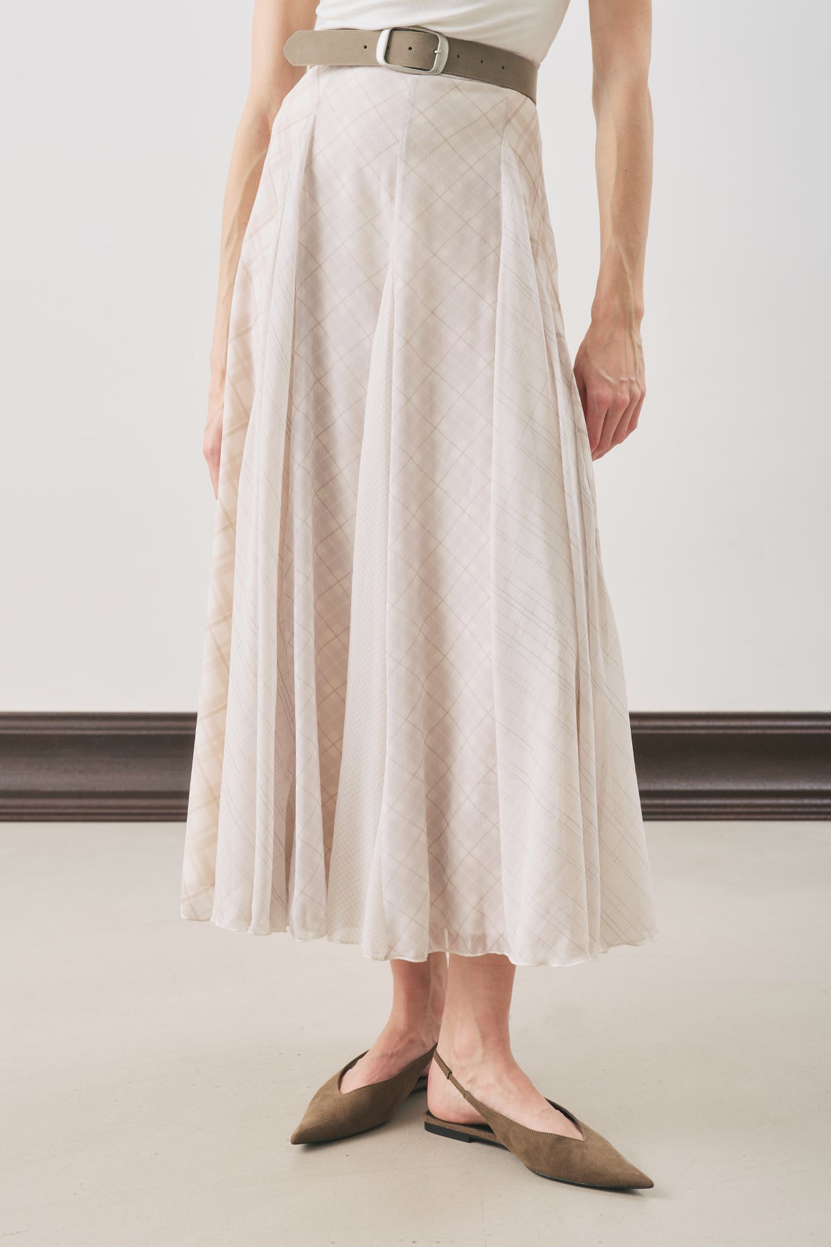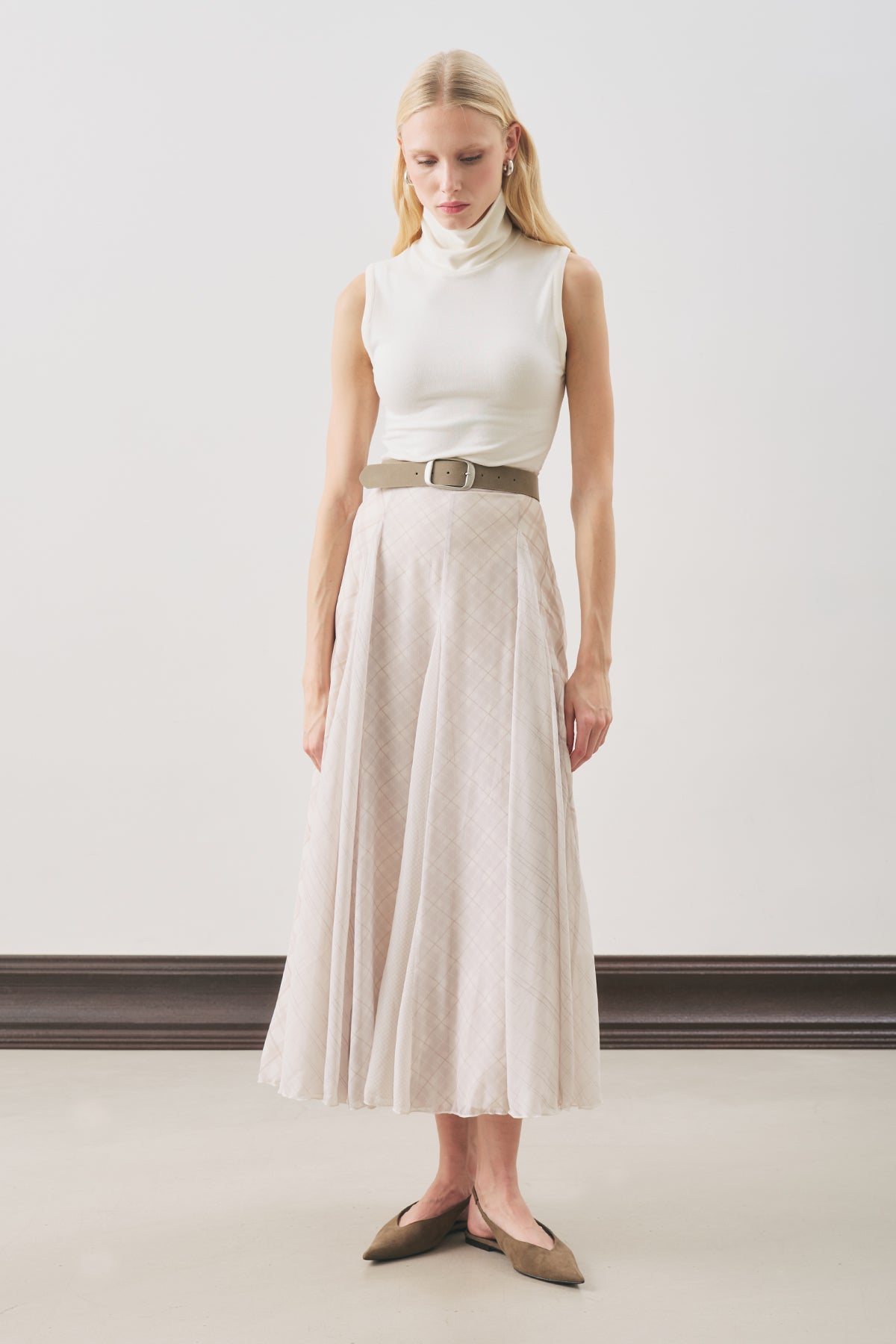 Kloş etek form,yüksek bel,kare desenli etek,tam boy,fermuar kapamalı.