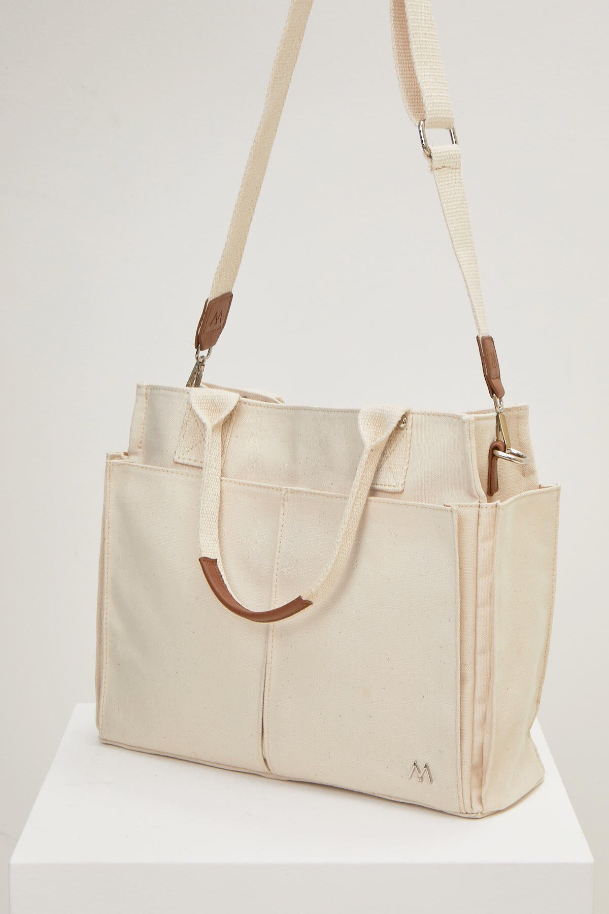 We've designed a multifunctional bag you can carry every day of the week, suitable for all aspects of your life. With the Everyday Bag, you can go to school, the gym, the market, the office, or on vacation. Made from thick canvas fabric, it is eco-friendly and easy to clean. It is suitable for many different uses, including school, office, market, gym, travel, and vacation. When placing your laptop in the bag, use the short handle instead of the long one to avoid the risk of the long handle breaking due to weight.