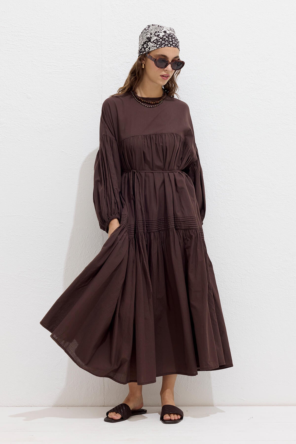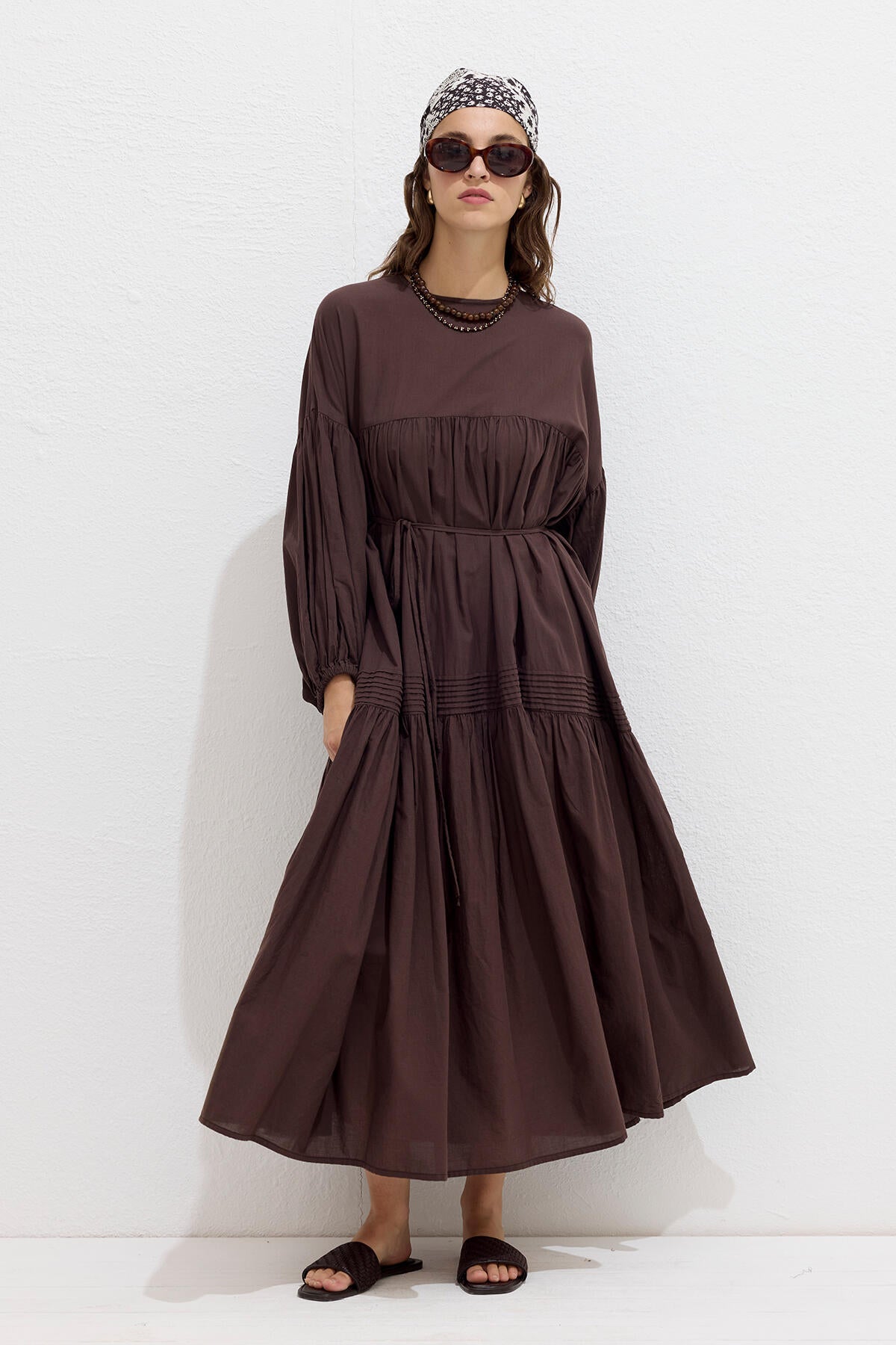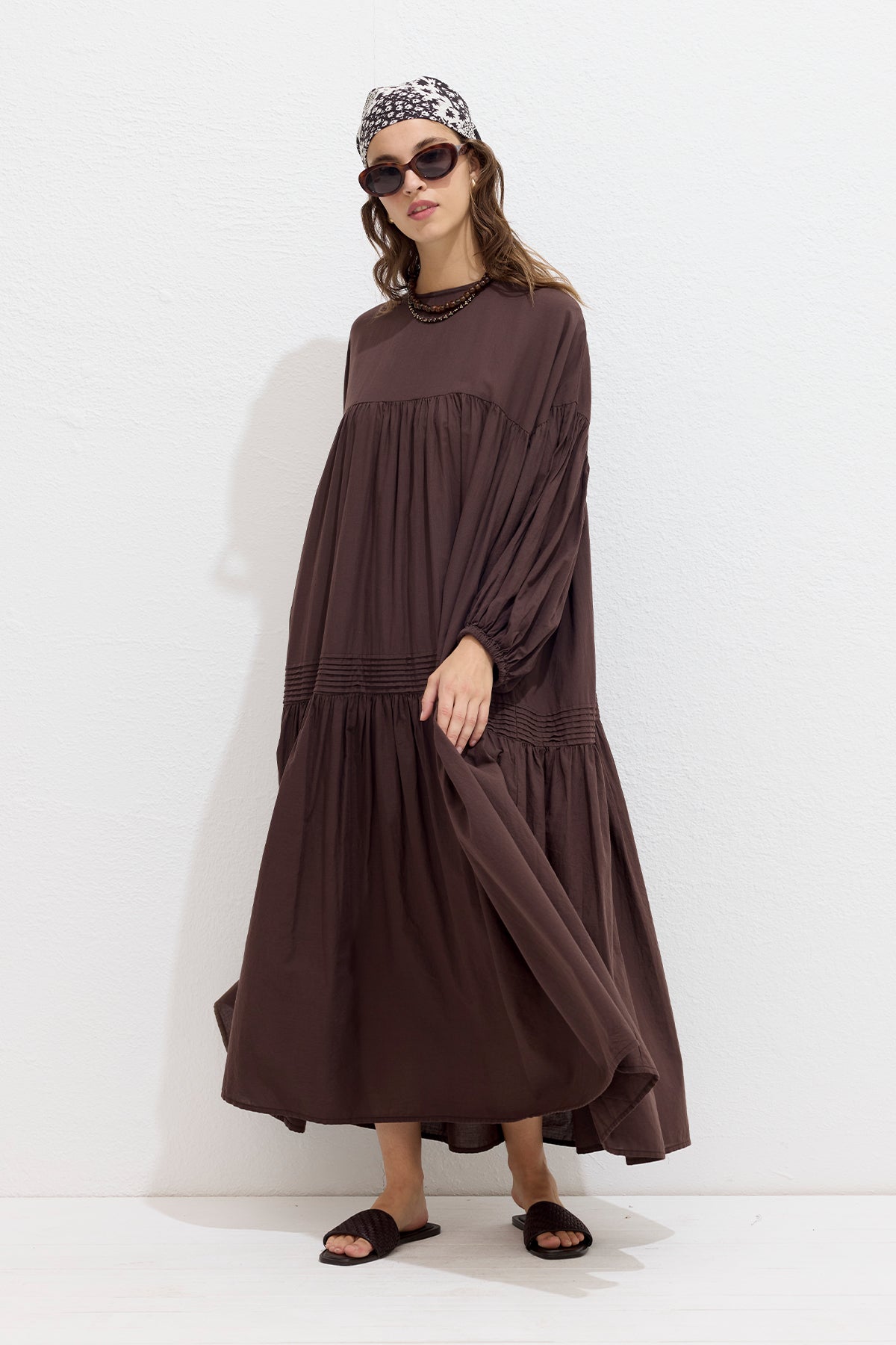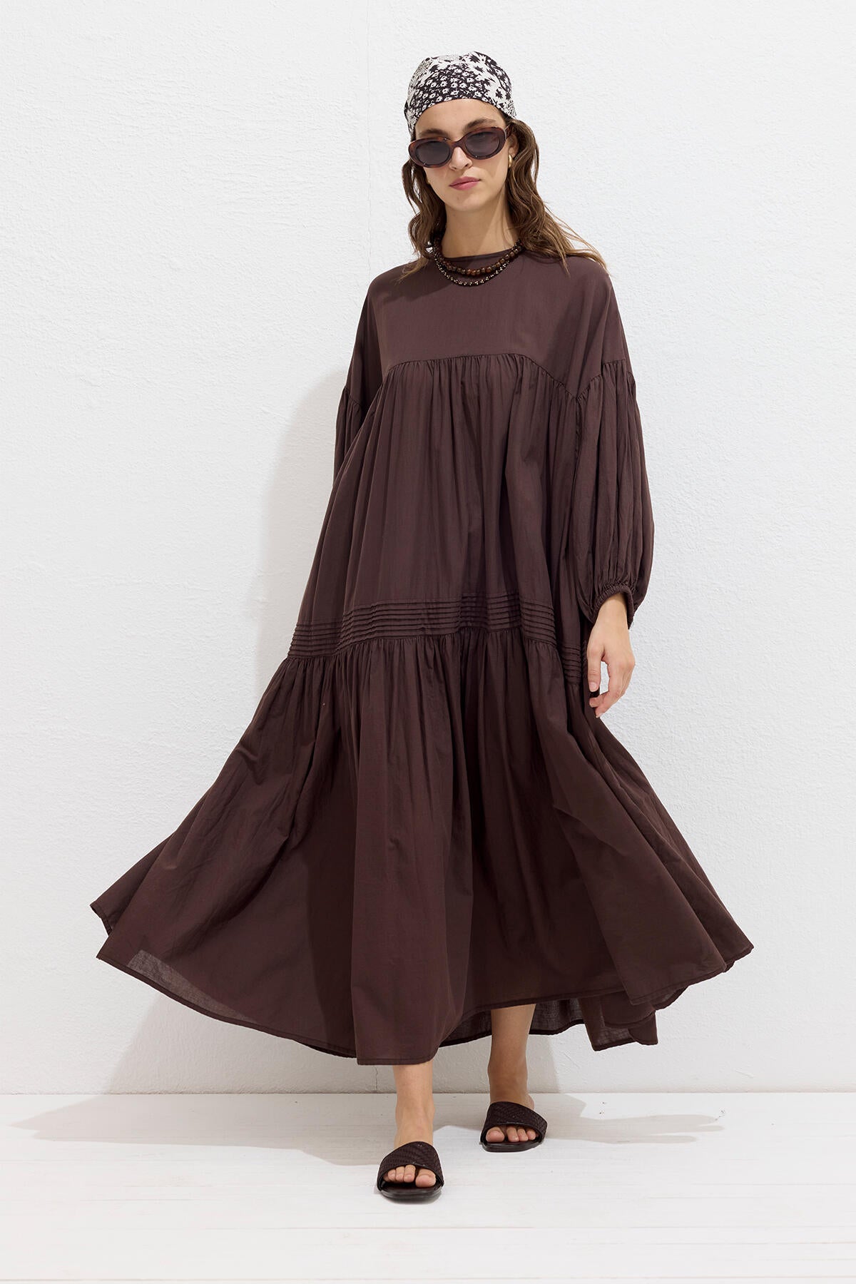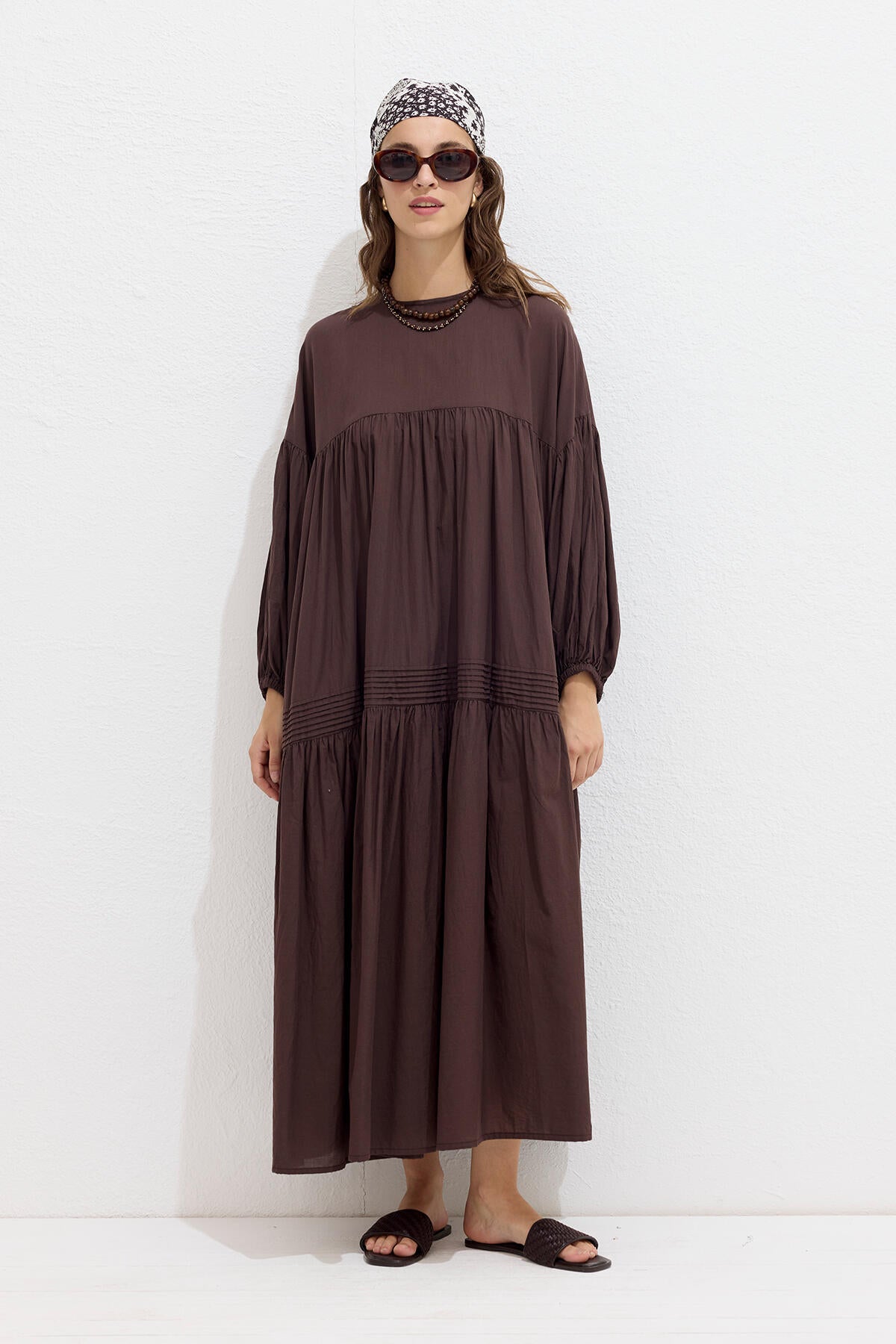 Gathered Oversized Voile Dress Brown