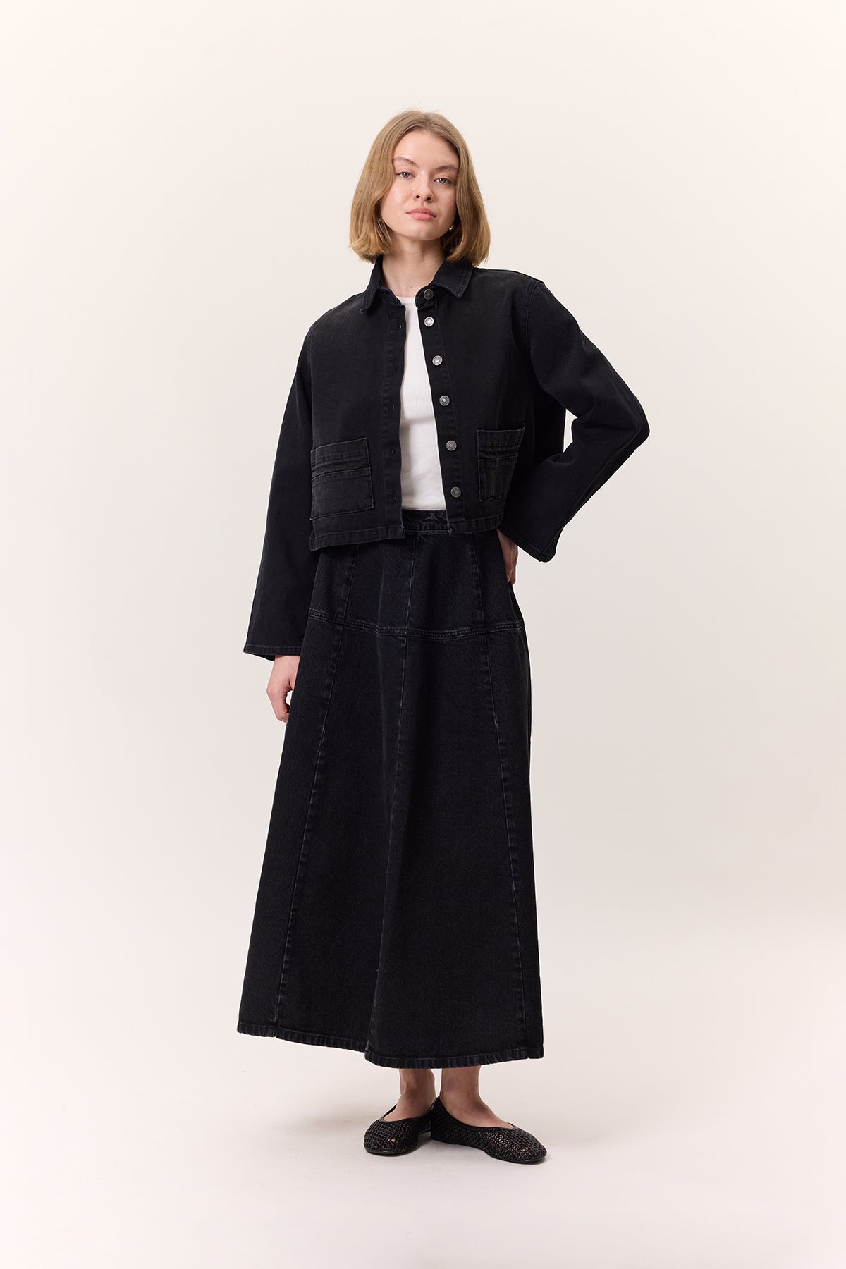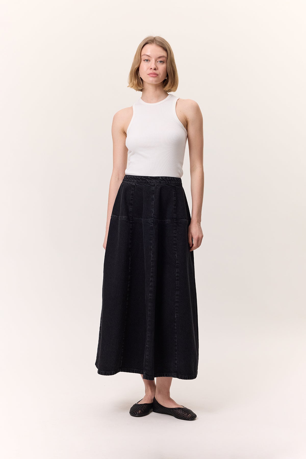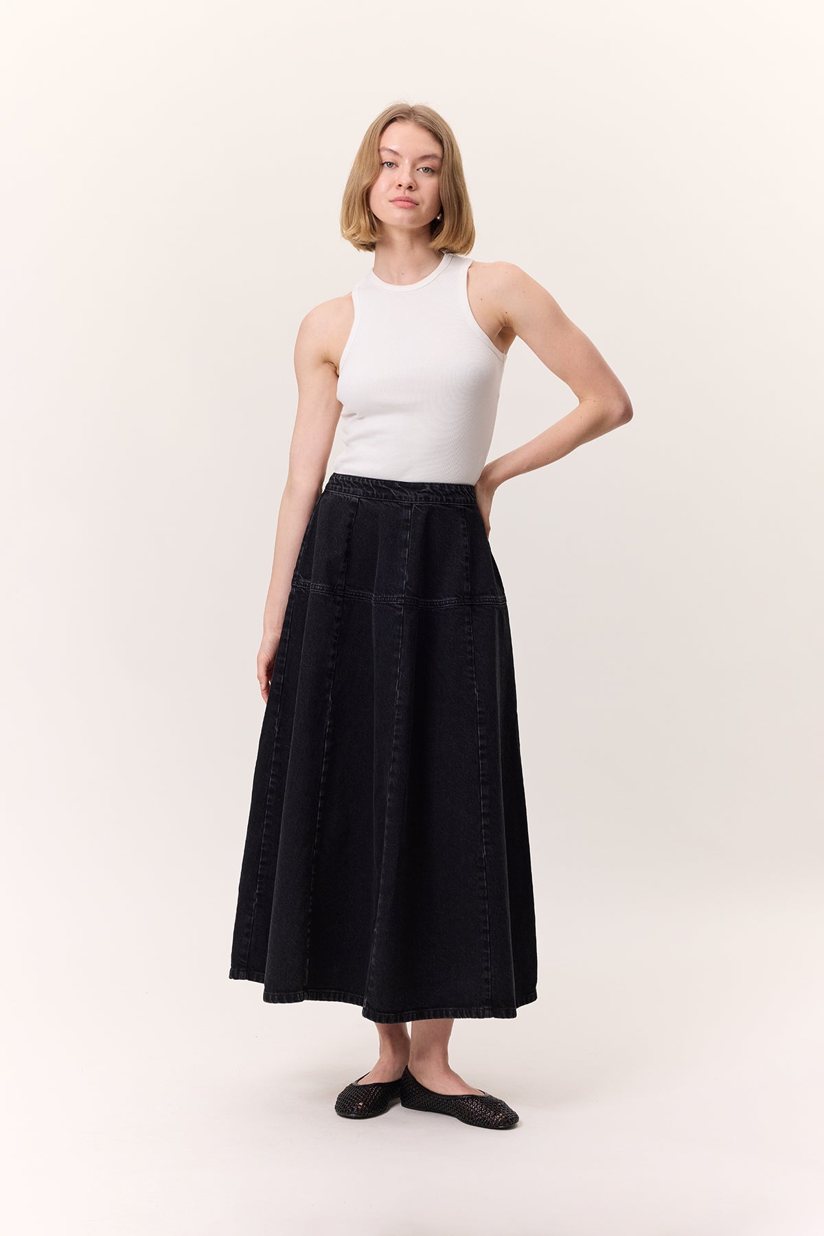Wide Gathered Denim Skirt Black
