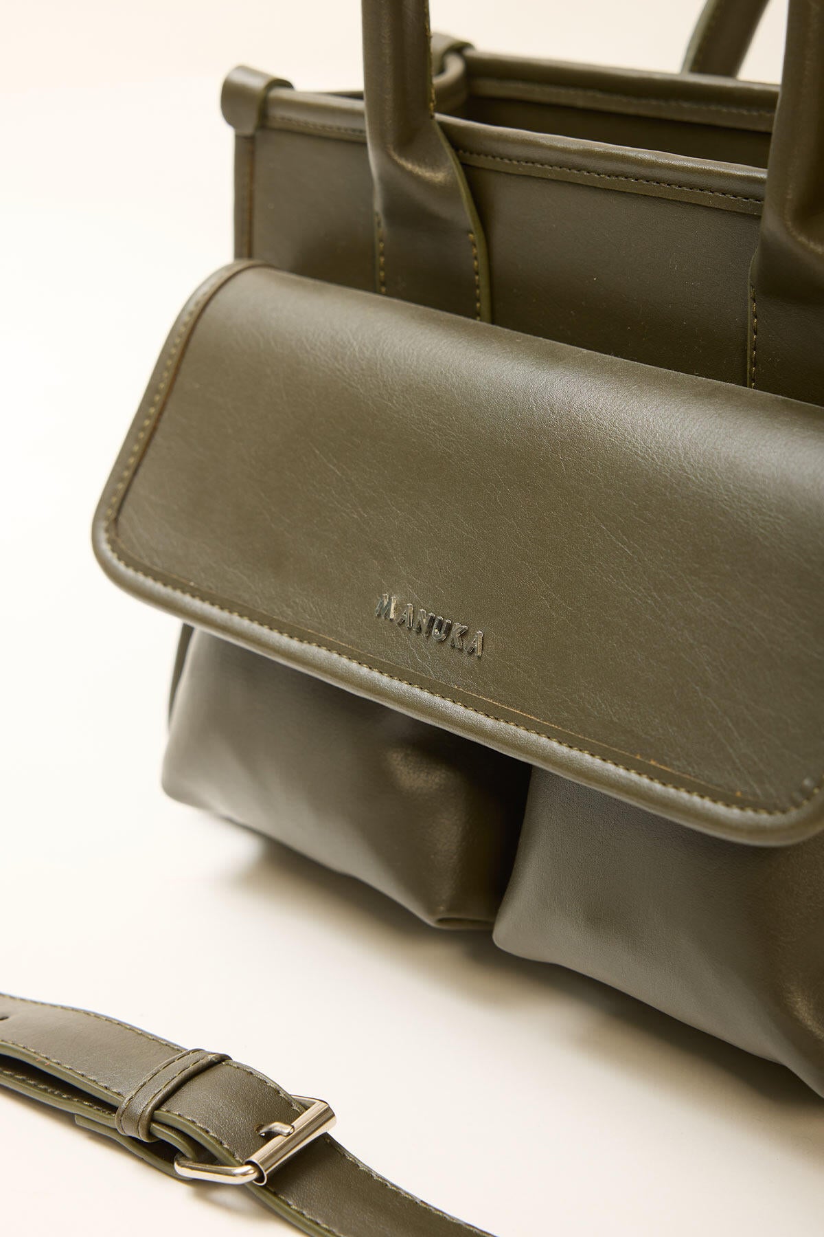 Crafted from high-quality faux leather, this bag boasts a luxurious look and feel without compromising on durability. The adjustable shoulder strap and additional top handle offer versatility in carrying options, allowing you to wear it comfortably on your shoulder or carry it by hand. Adorned with our signature Manuka logo, this bag exudes sophistication and elegance. The lined interior features a small pocket for keeping smaller items organized, while the two front gusseted pockets provide additional storage space for your essentials. With its convenient snap button closure, this bag keeps your belongings secure while adding a stylish touch to any outfit.