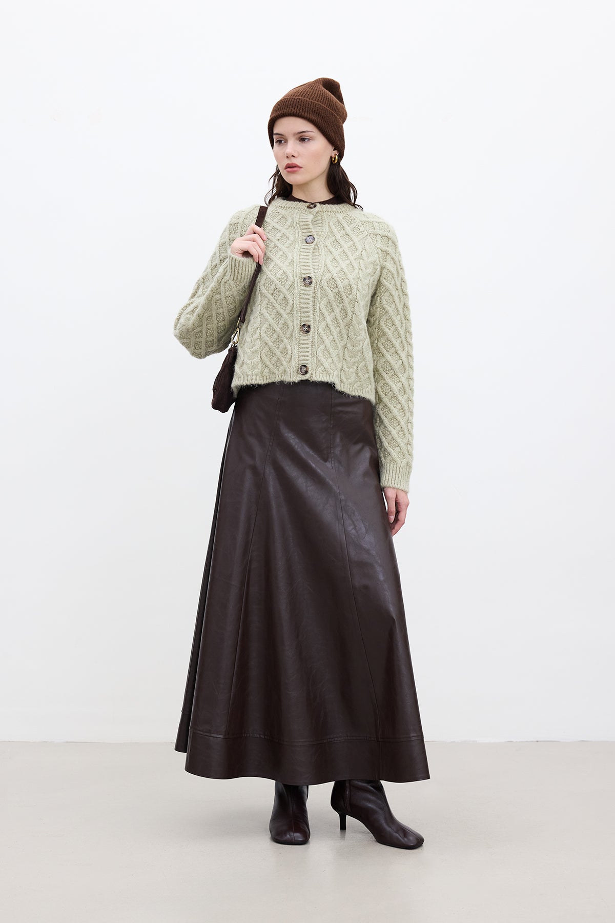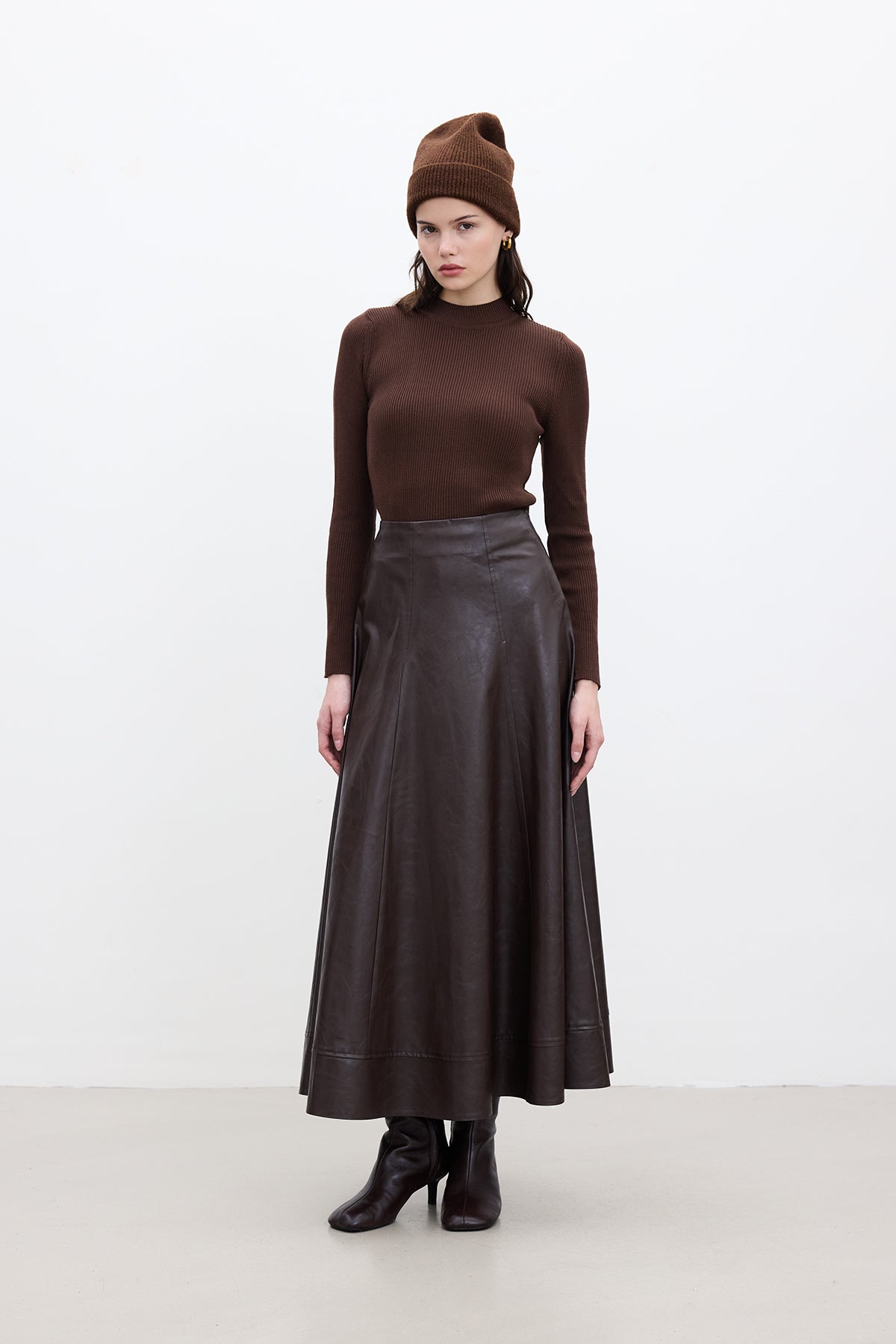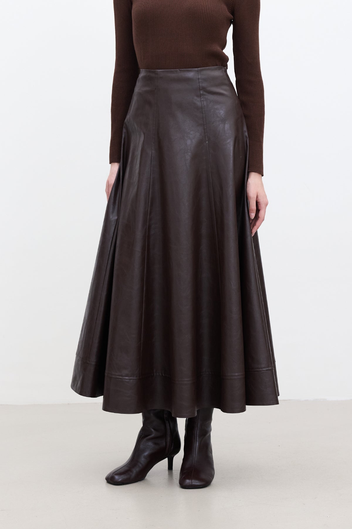 Wide-Cut Faux Leather Skirt Dark Brown
