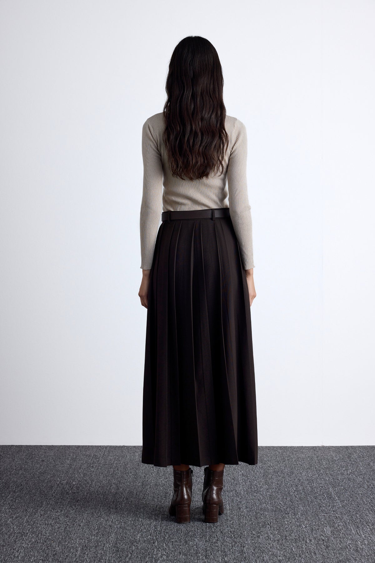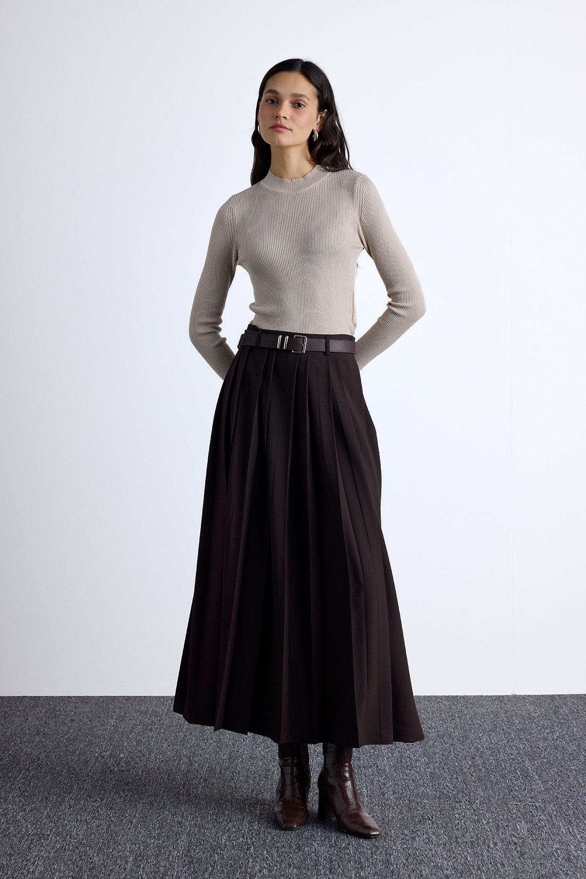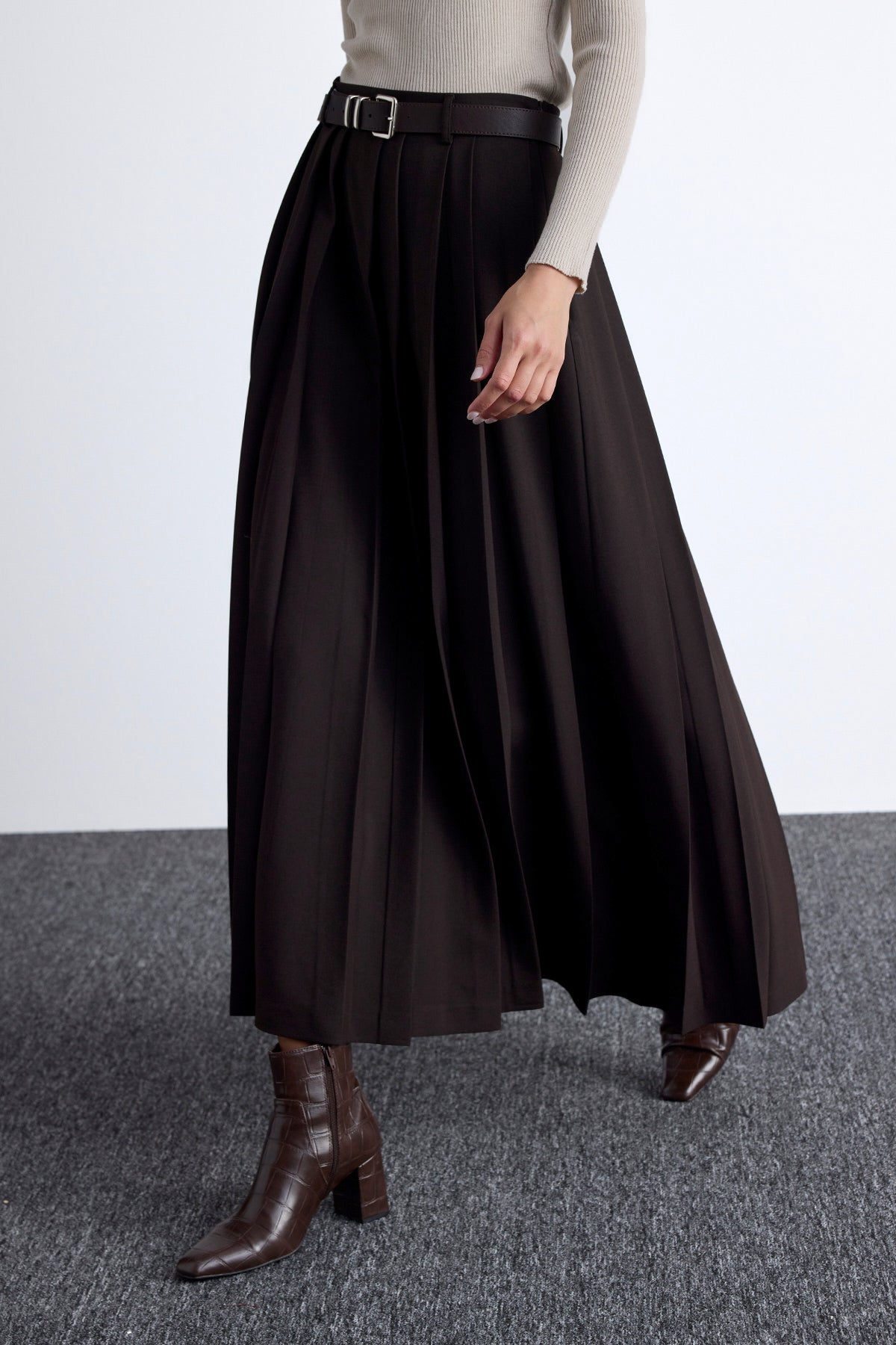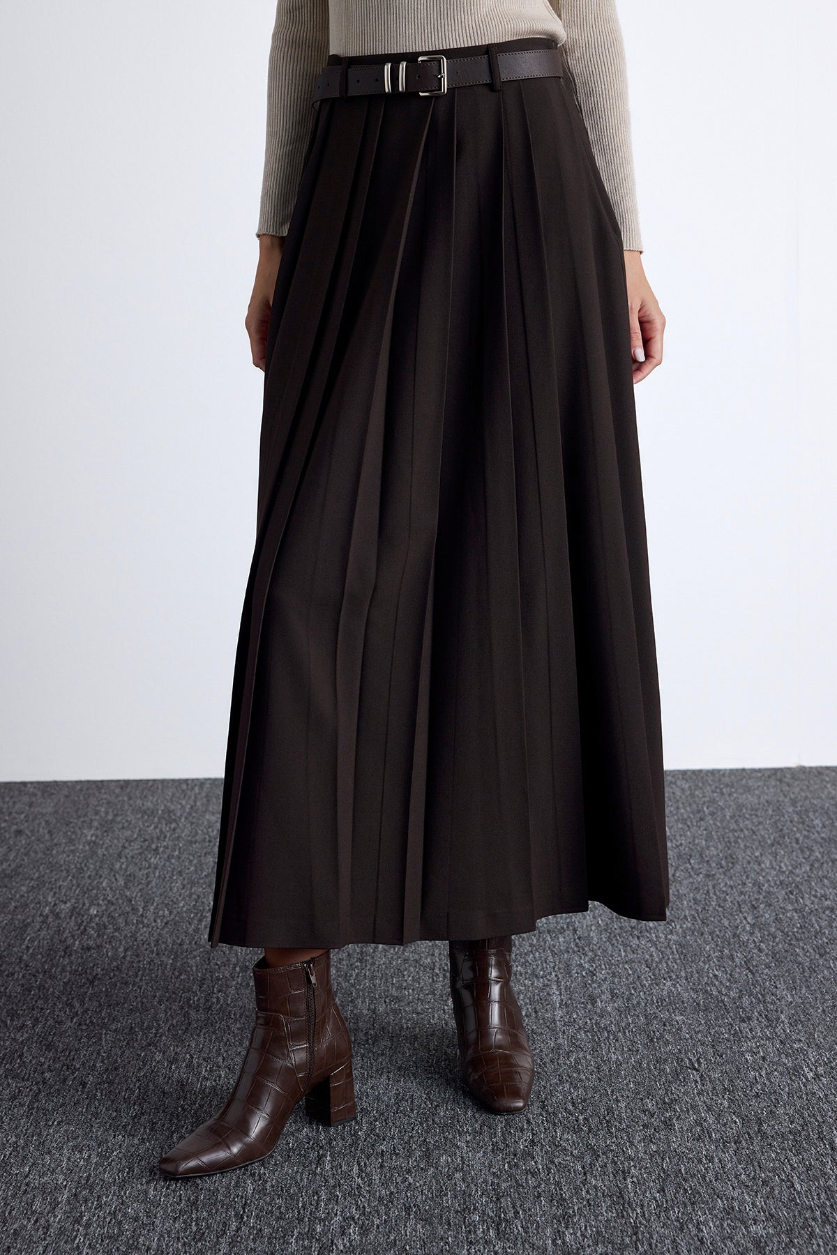 Wide Pleated Skirt Dark Brown