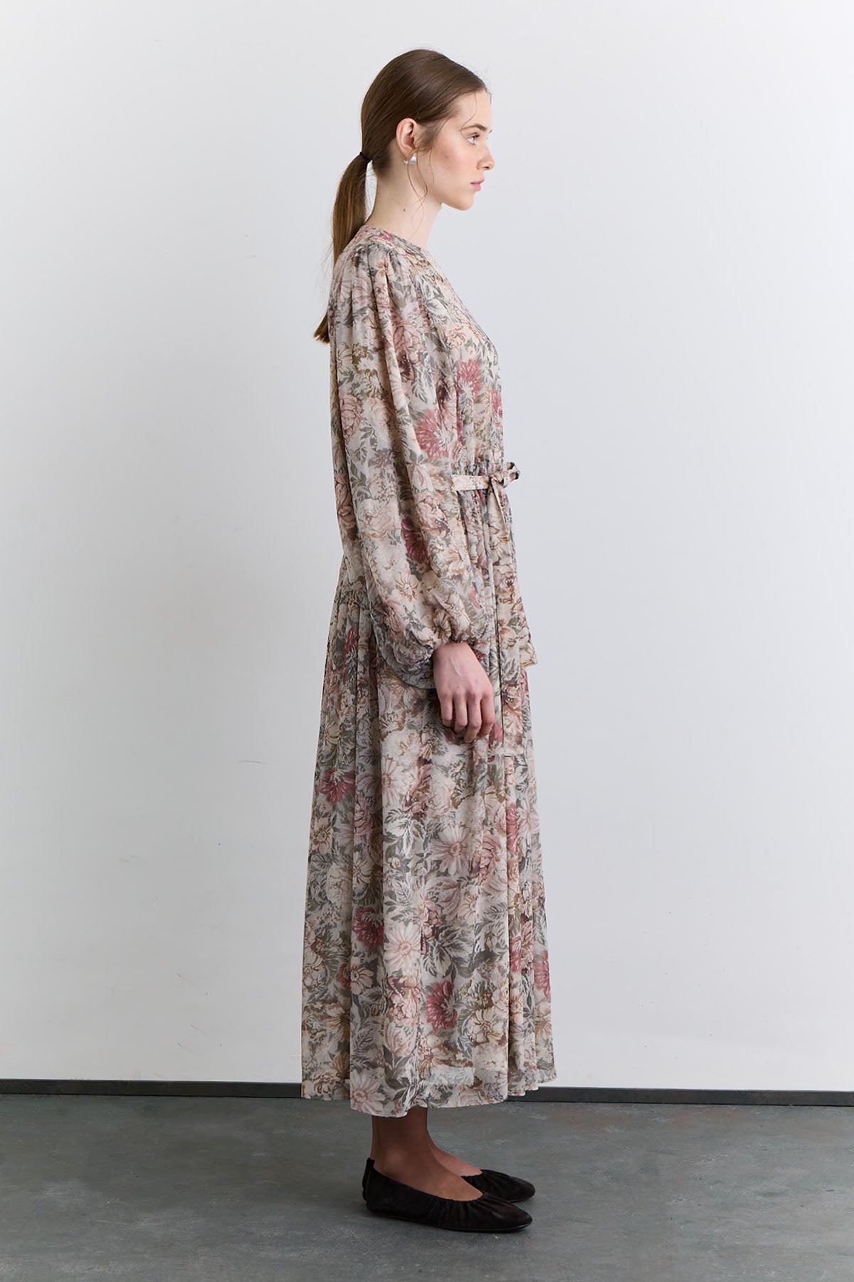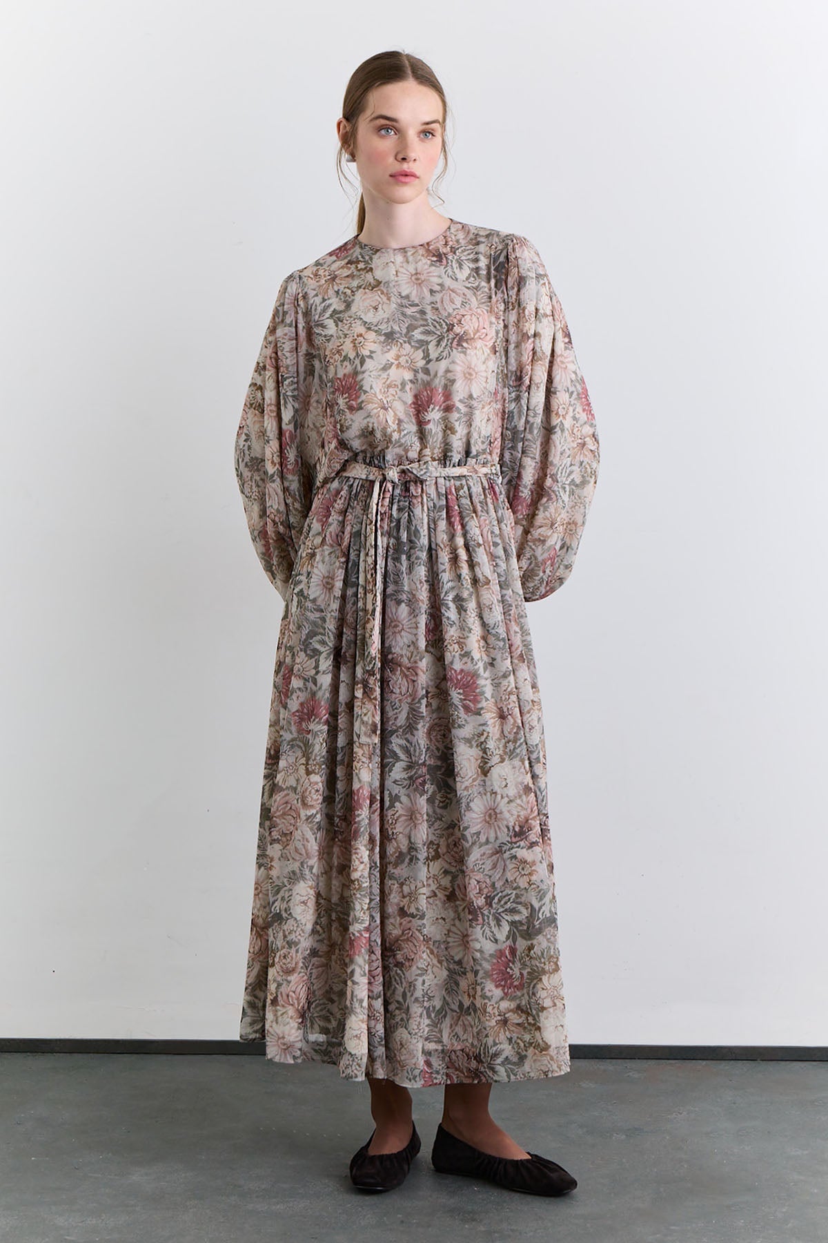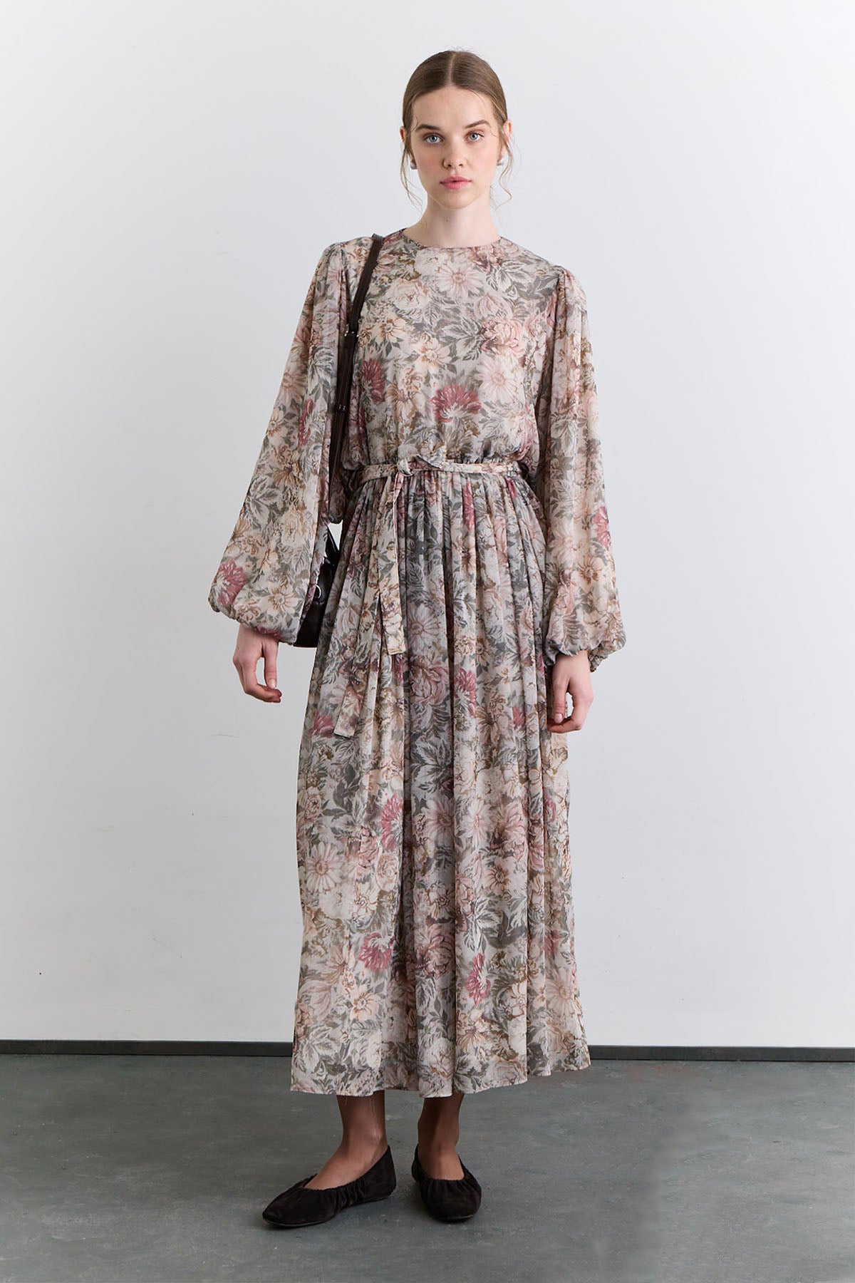Normal kalıp, yuvarlak yaka, uzun kolu büzgü detaylı, beli büzgülü kuşak detaylı, tam boy, fermuar kapamalı.