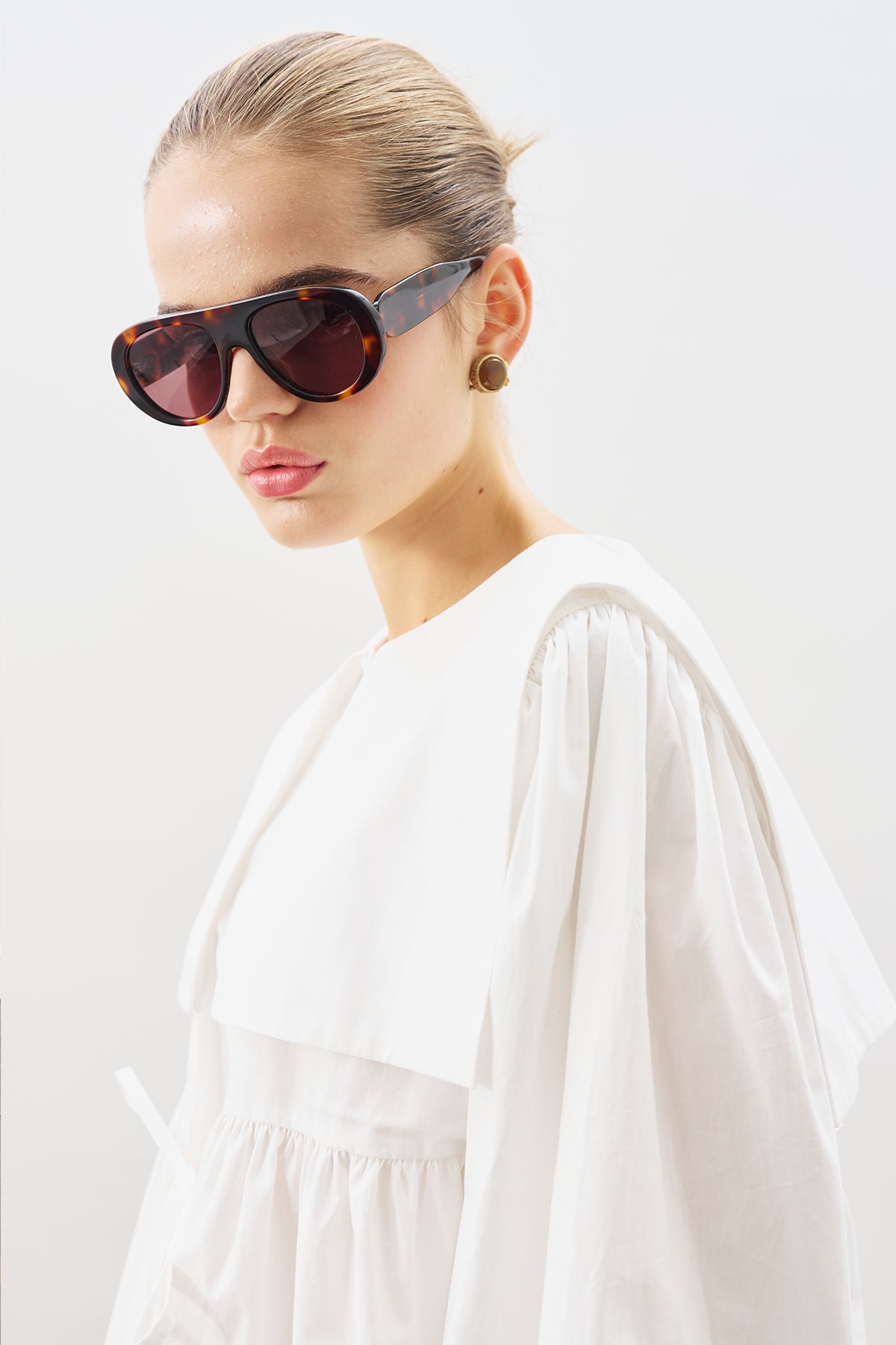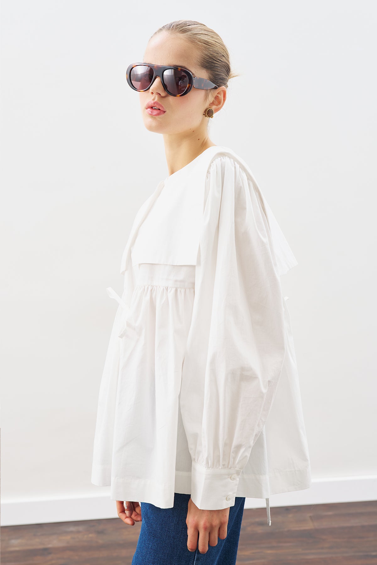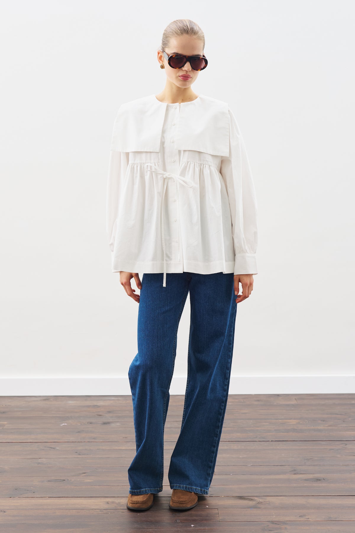 Yuvarlak yakalı, uzun kollu, büzgülü yaka detaylı, ara boy, düğmeli kapamalı, 30 derecede ters çevirerek yıkayınız, normal kalıp, dokuma kumaş.