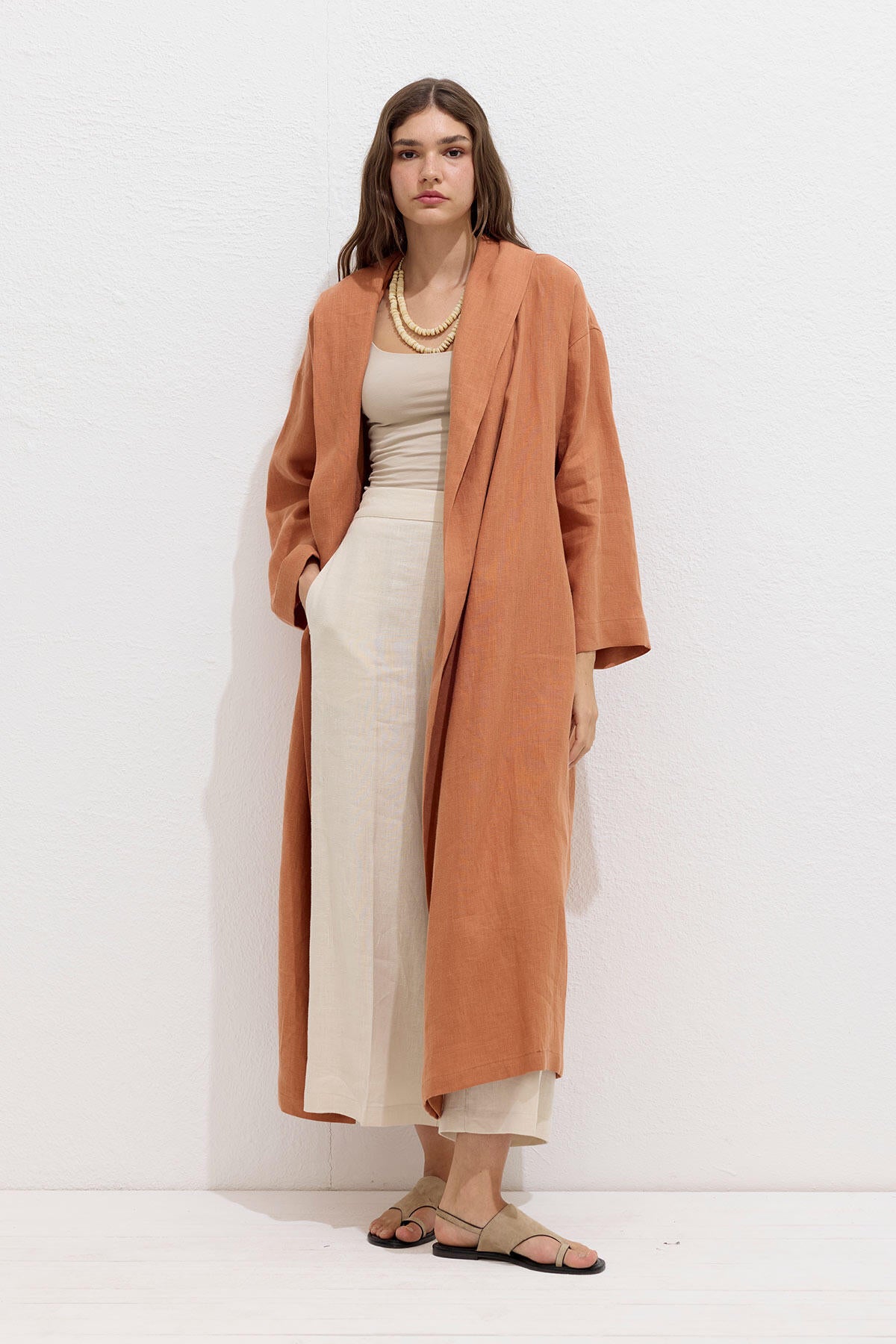 This full-length coat is made from linen and features a hood, side pockets, and a belt. It has long sleeves and offers a relaxed, yet stylish fit.