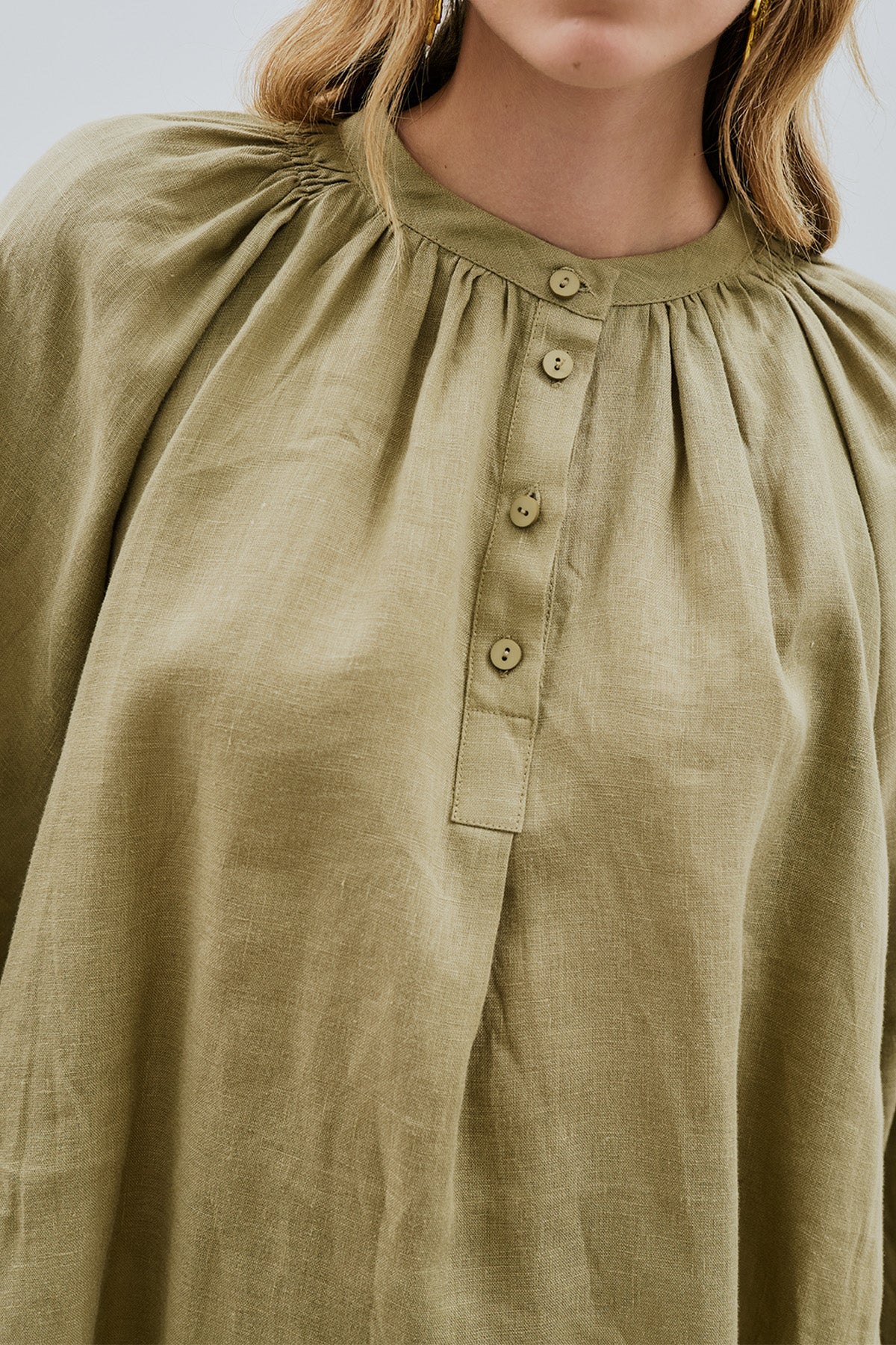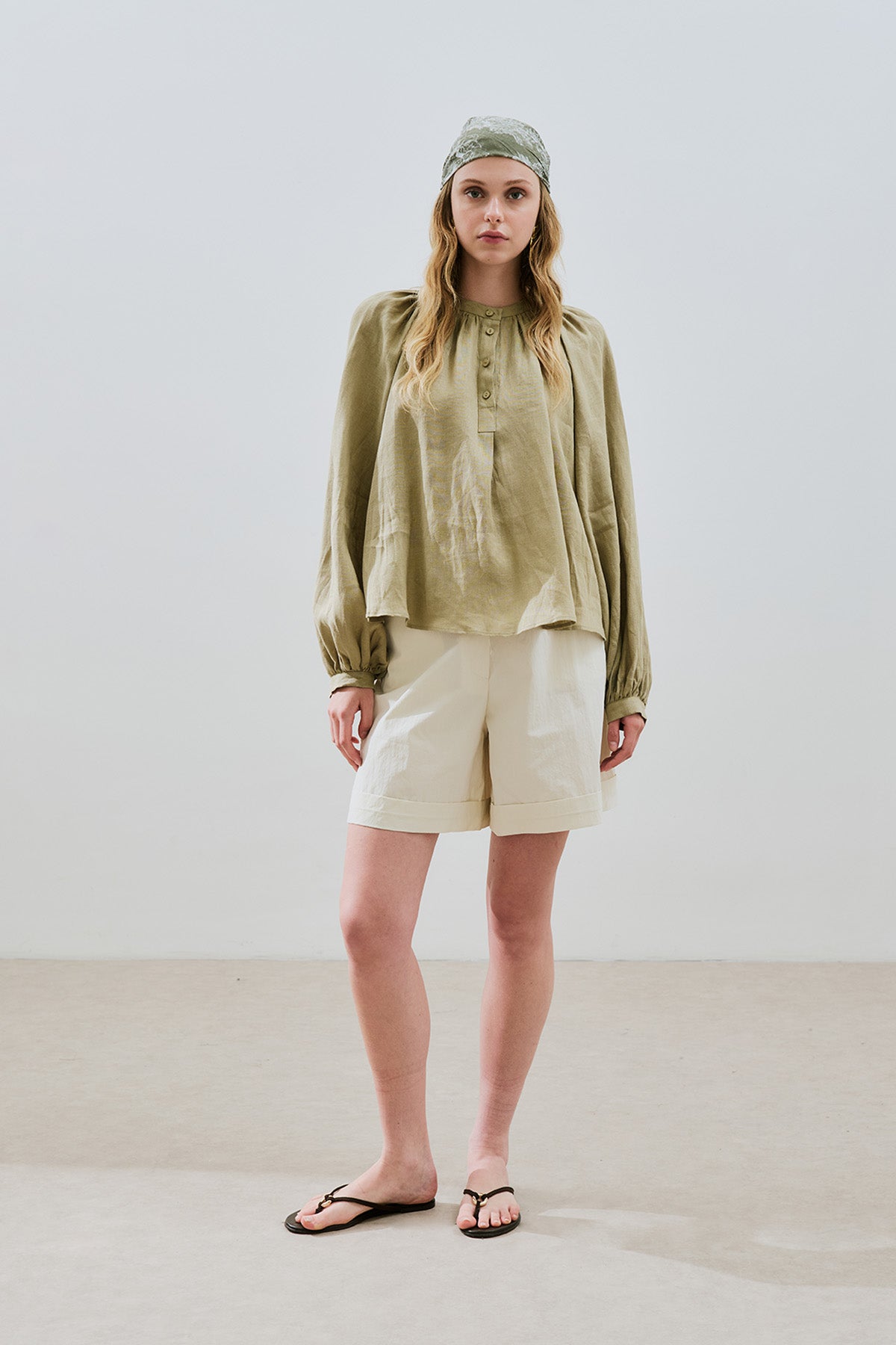 Round mandarin collar, button closure, long raglan balloon sleeves with cuffs.