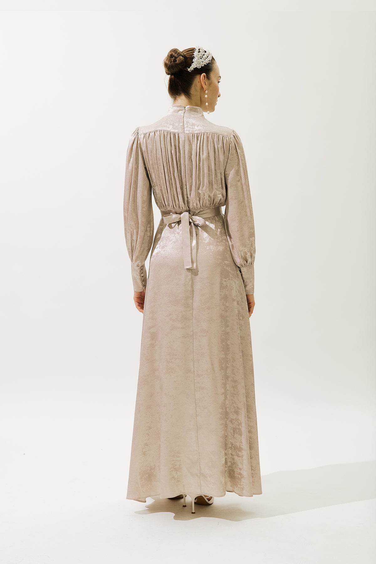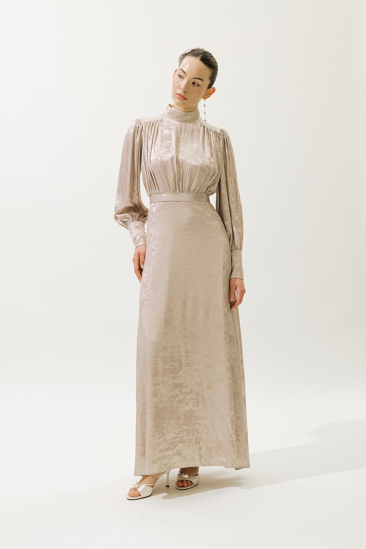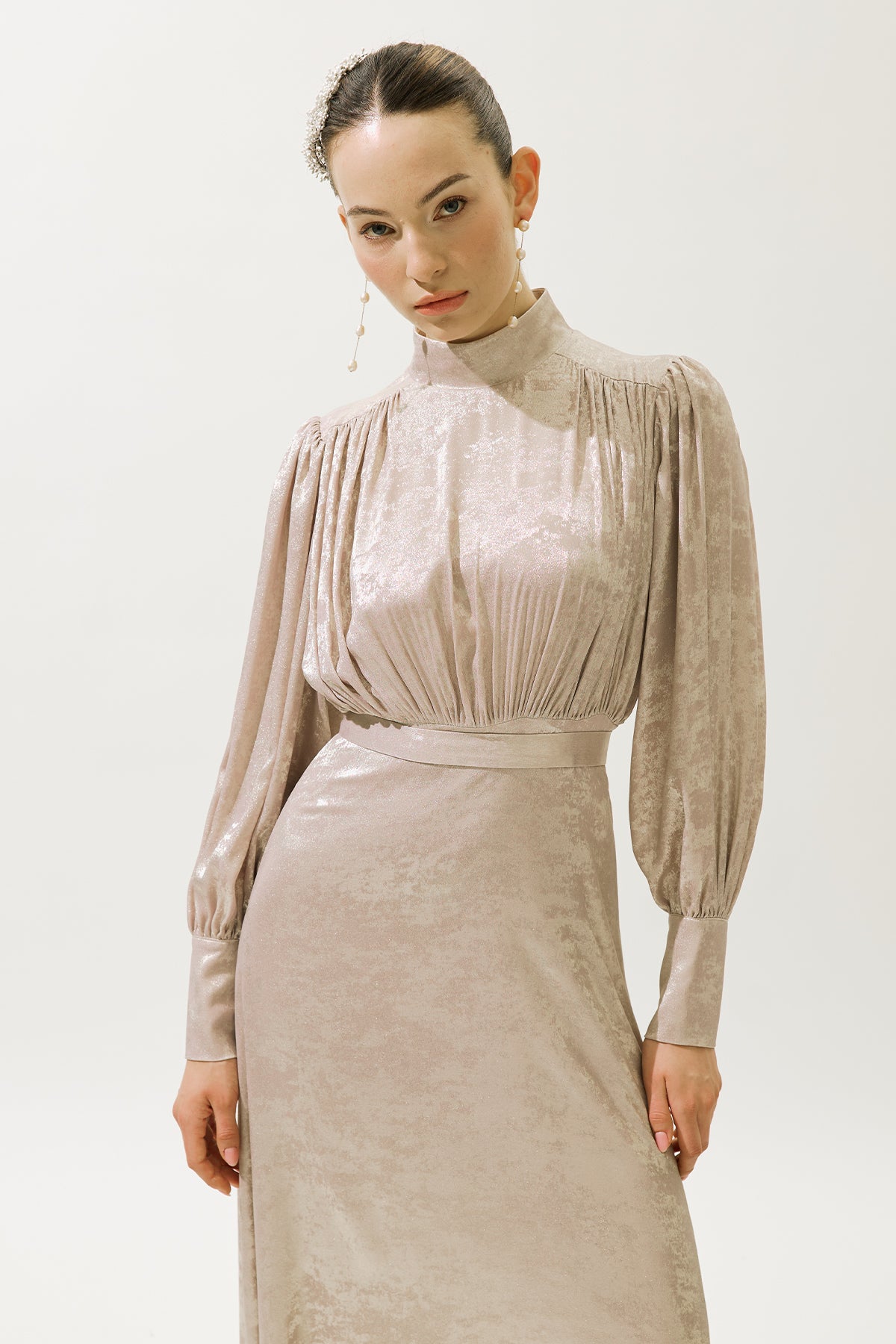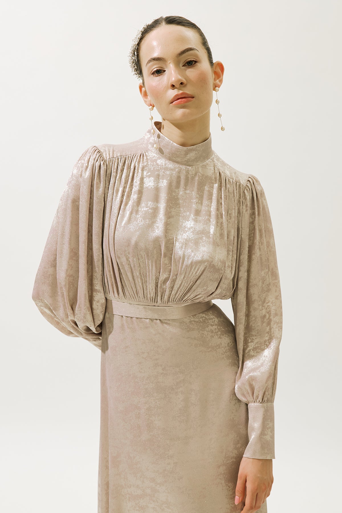 Features a high neckline and long balloon sleeves with extended cuffs, adding a touch of drama and elegance. The upper body is adorned with ruching details both at the front and back, creating a flattering silhouette that accentuates your figure. Fully lined for comfort and a seamless look, this dress is designed in a regular fit, ensuring it drapes beautifully on various body types. A concealed zipper closure provides a smooth, uninterrupted finish.
