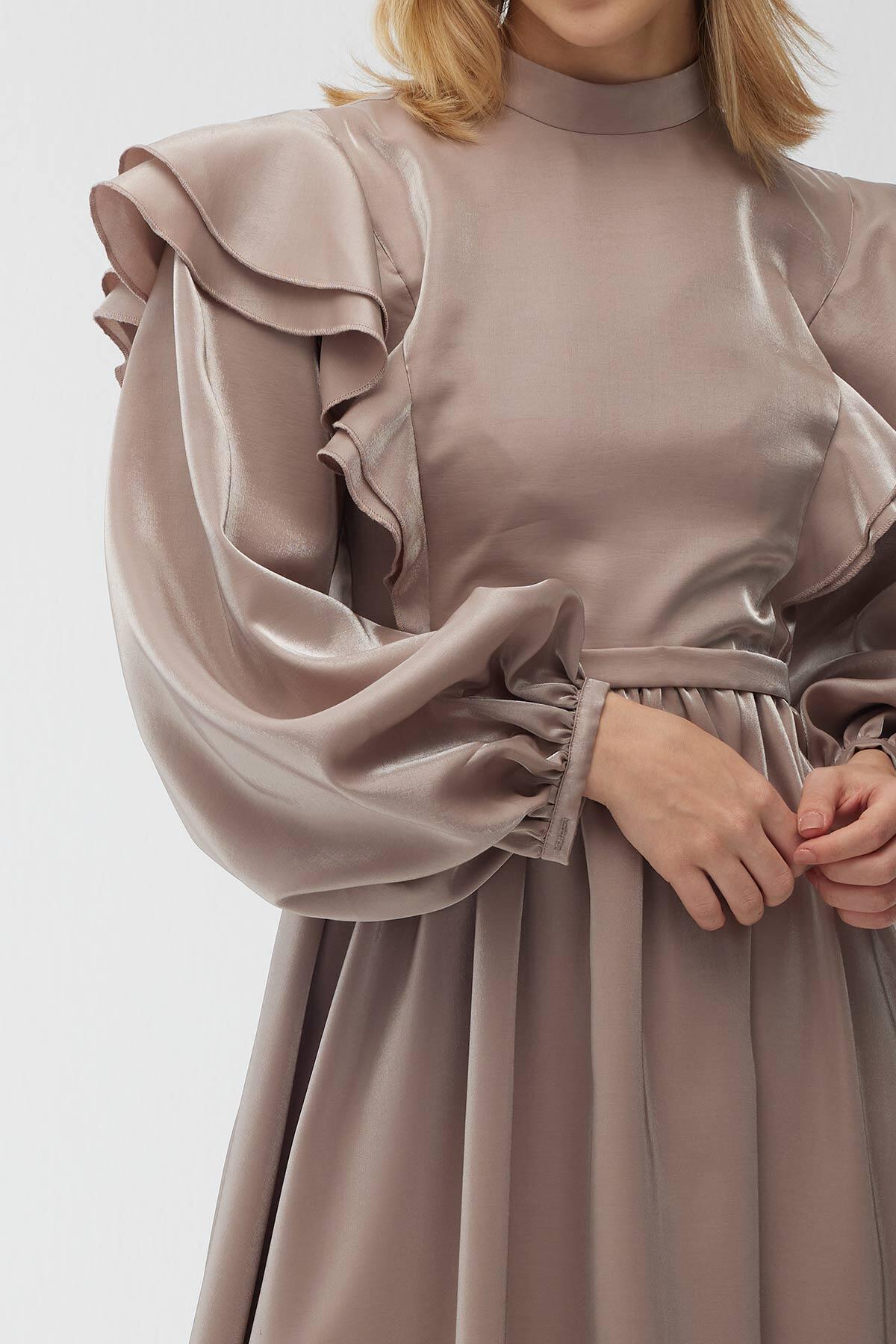 This dress features a high neckline and voluminous balloon sleeves, creating a silhouette that's both dramatic and effortlessly elegant. The shoulders are adorned with ruffle details, adding a layer of sophistication and movement to the design. Crafted from self-illuminating organza fabric, this dress captures and reflects light, ensuring you dazzle from every angle. The skirt gathers delicately, thanks to a tasteful ruching detail, enhancing the dress's overall femininity. Fully lined for comfort and modesty, it comes complete with a fixed belt, cinching the waist and providing a flattering fit.