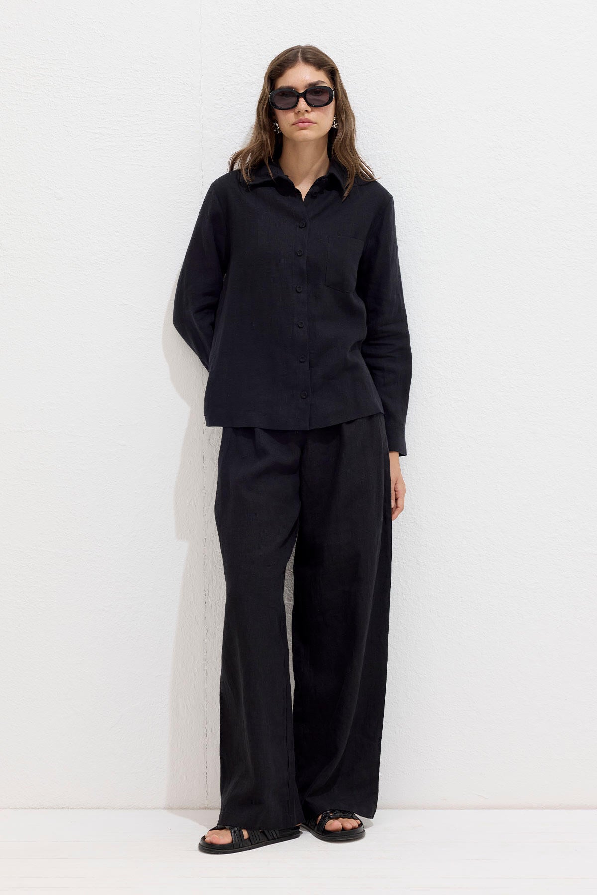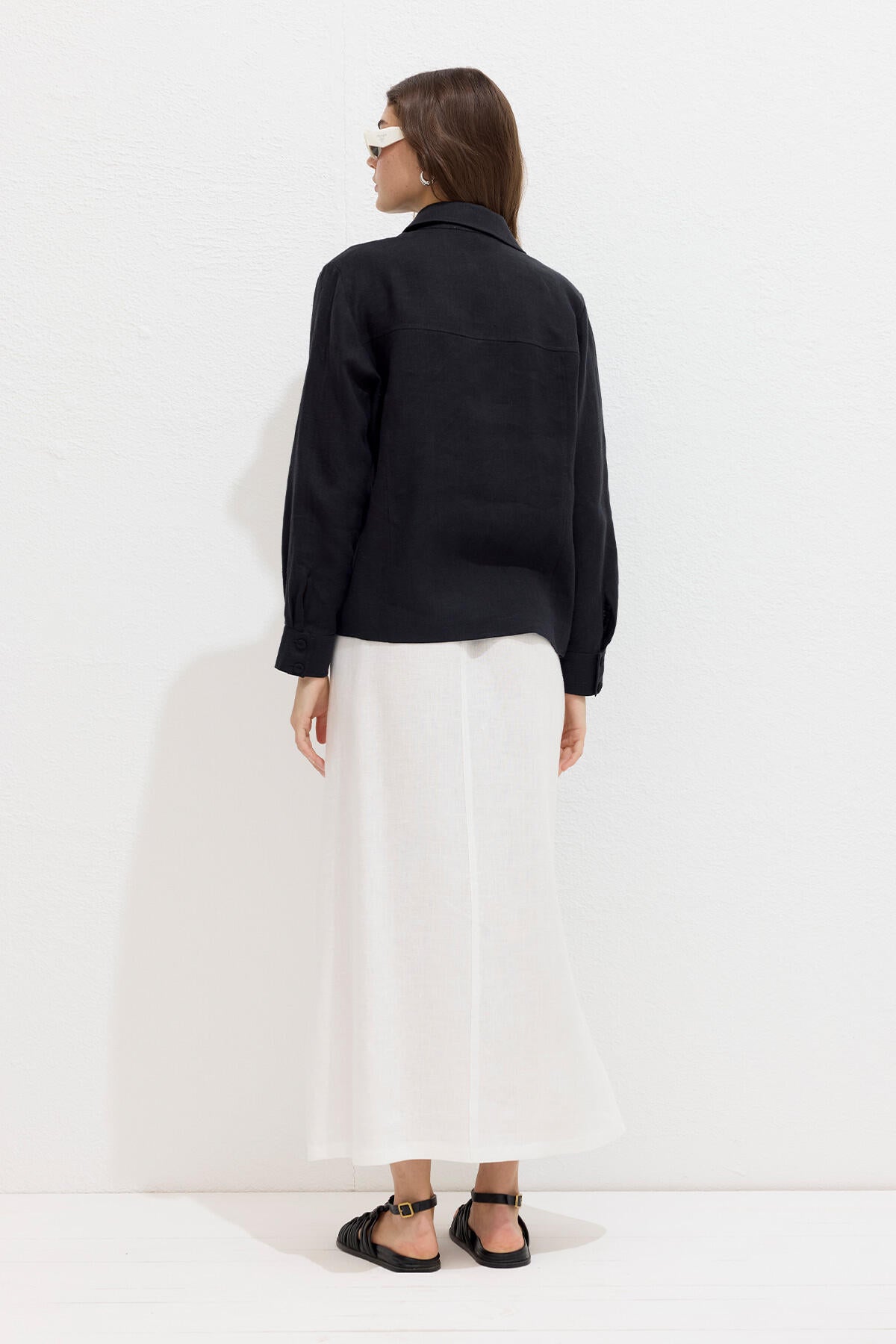 Shirt collar, fabric-covered button closure, long sleeves with cuffs, pocket detail.