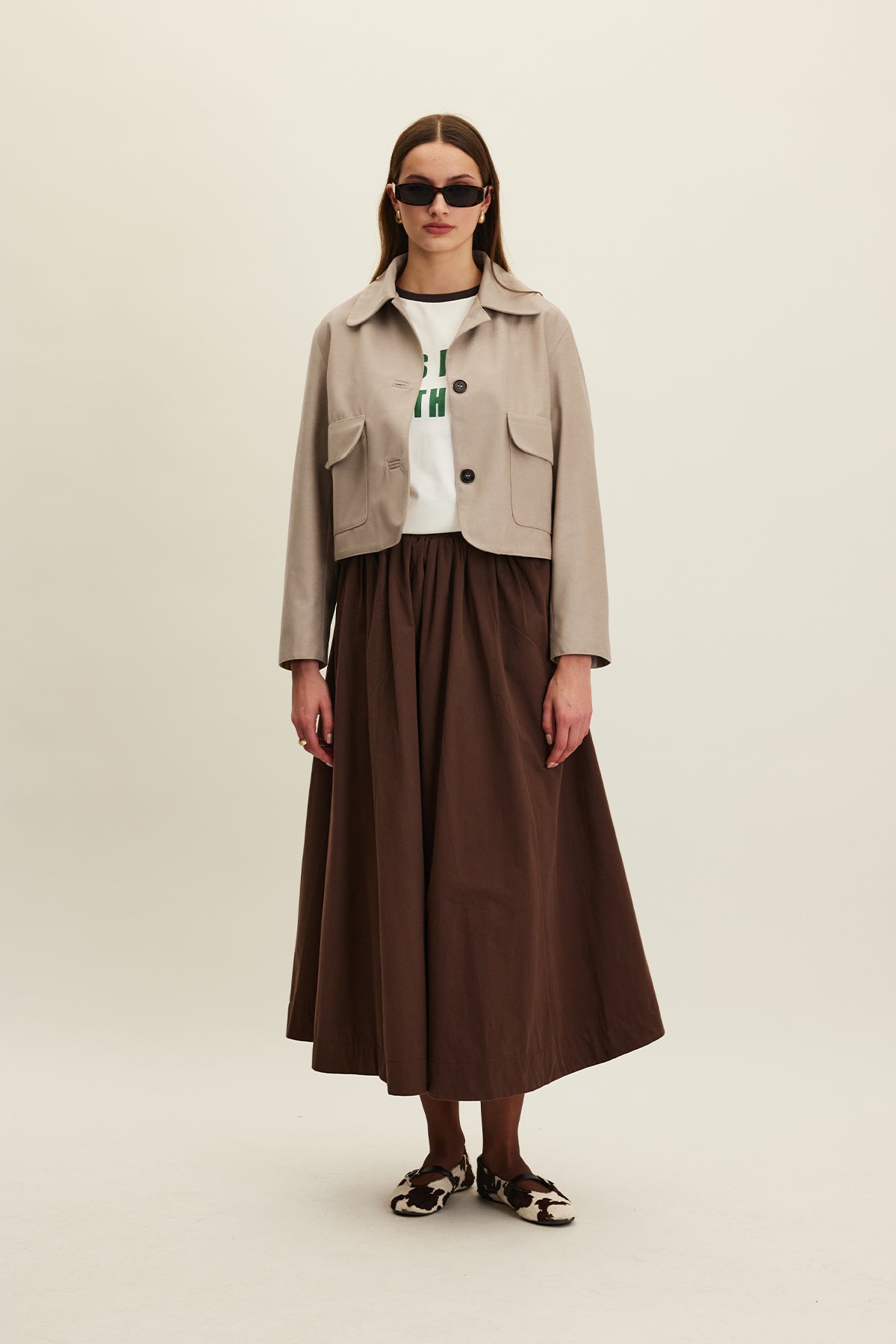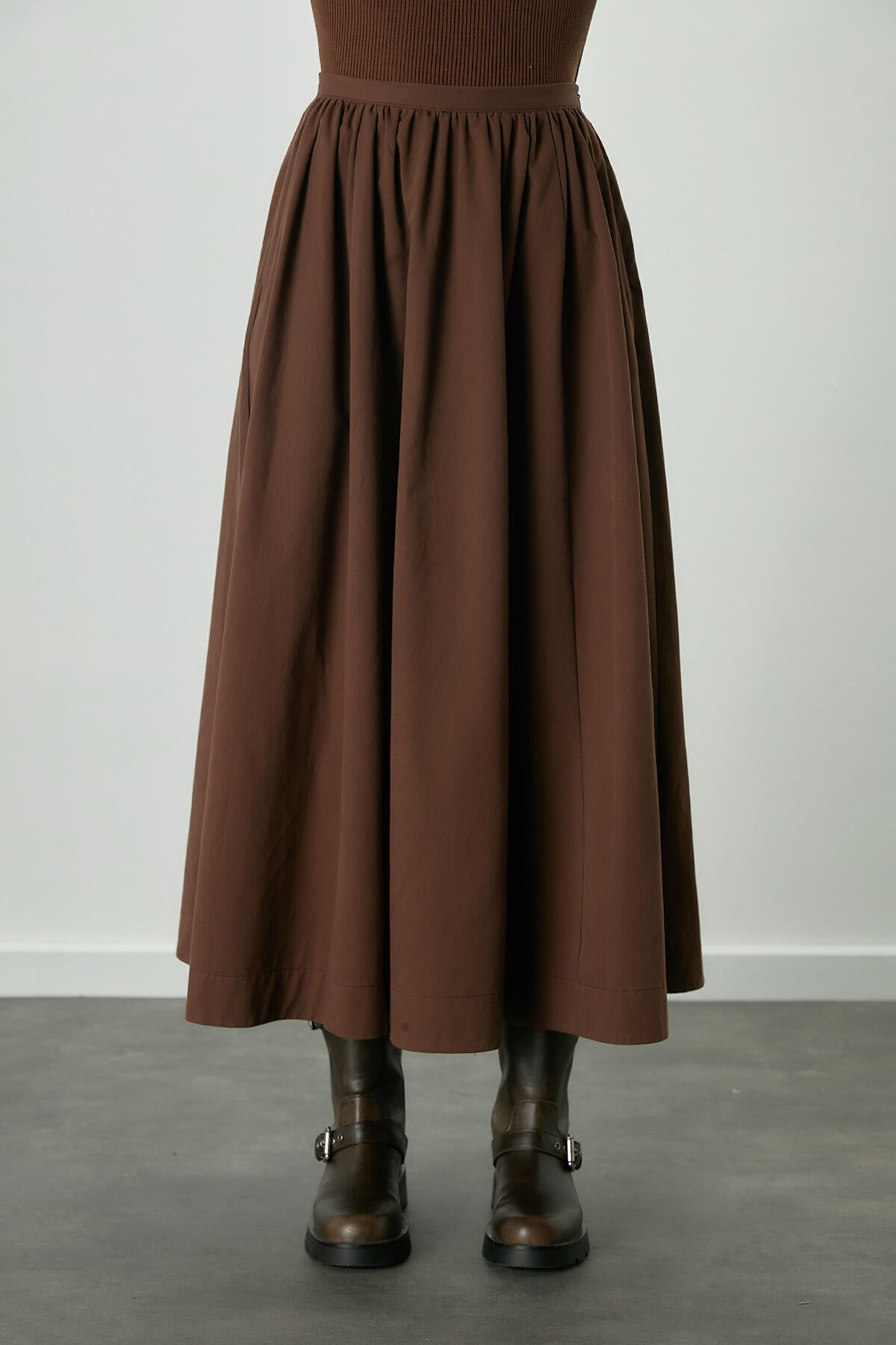Comfort meets elegance. This skirt is designed to fit snugly at the waist, featuring a concealed zipper closure for a seamless look. The shirred detailing and unique stitching add a touch of sophistication, while the cotton gabardine fabric ensures durability and comfort. A versatile piece that embodies chic simplicity.