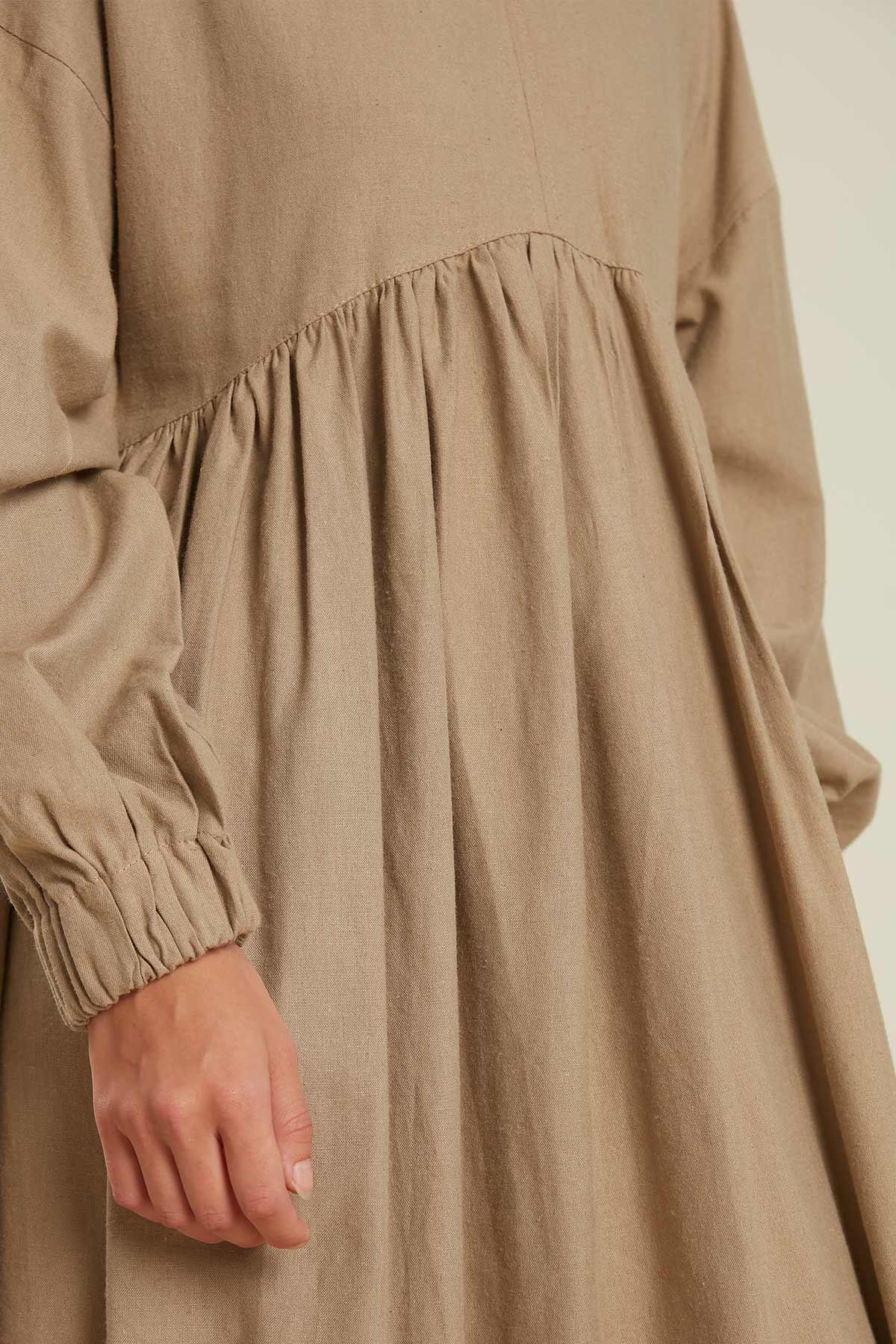 This dress features a round neckline, dropped shoulders, and a keyhole back closure for a touch of sophistication. The waist is cinched with asymmetric gathering, offering a flattering silhouette, while elastic cuffs on the balloon sleeves add a refined finish. Made from a premium linen blend fabric, this dress promises both comfort and style.